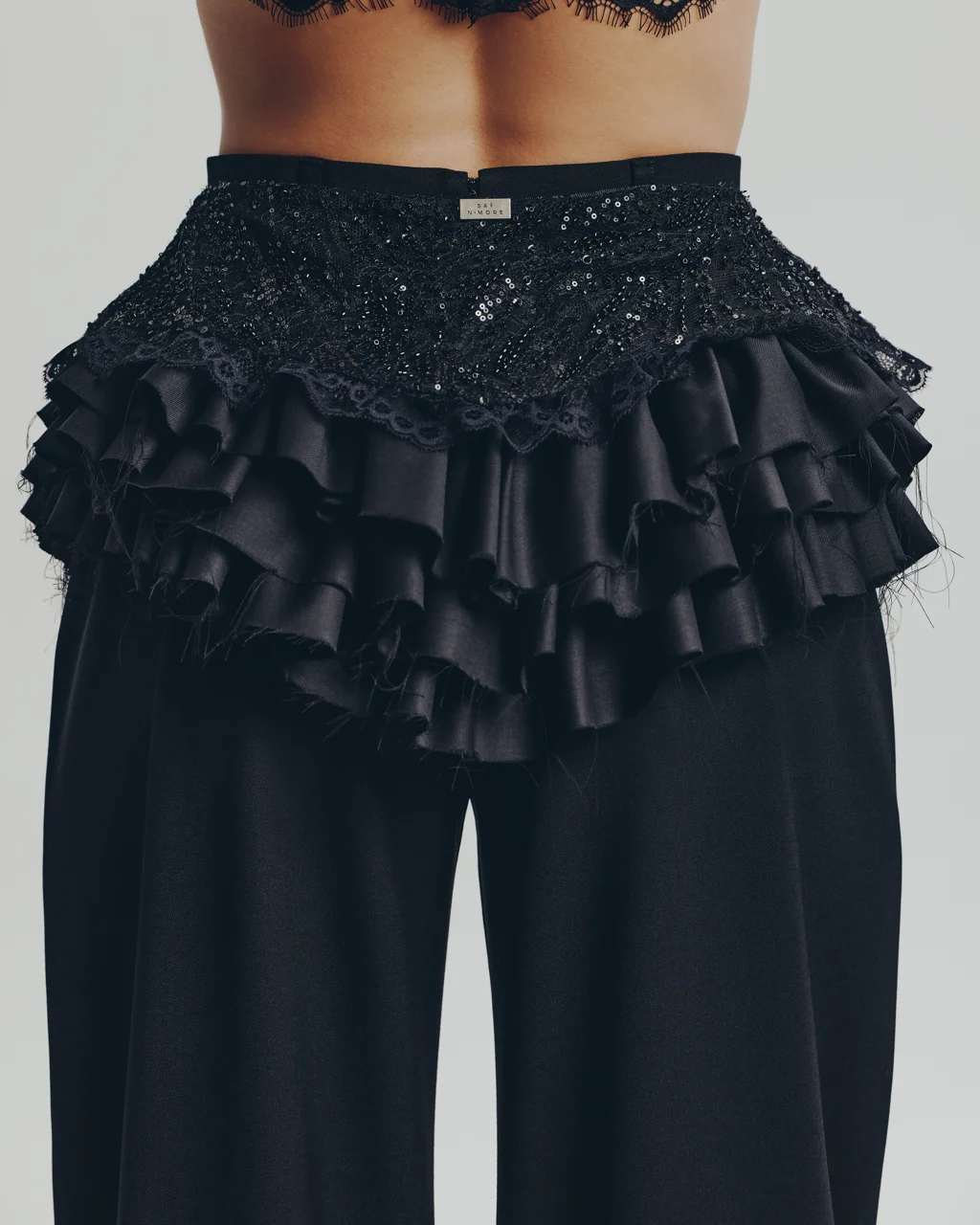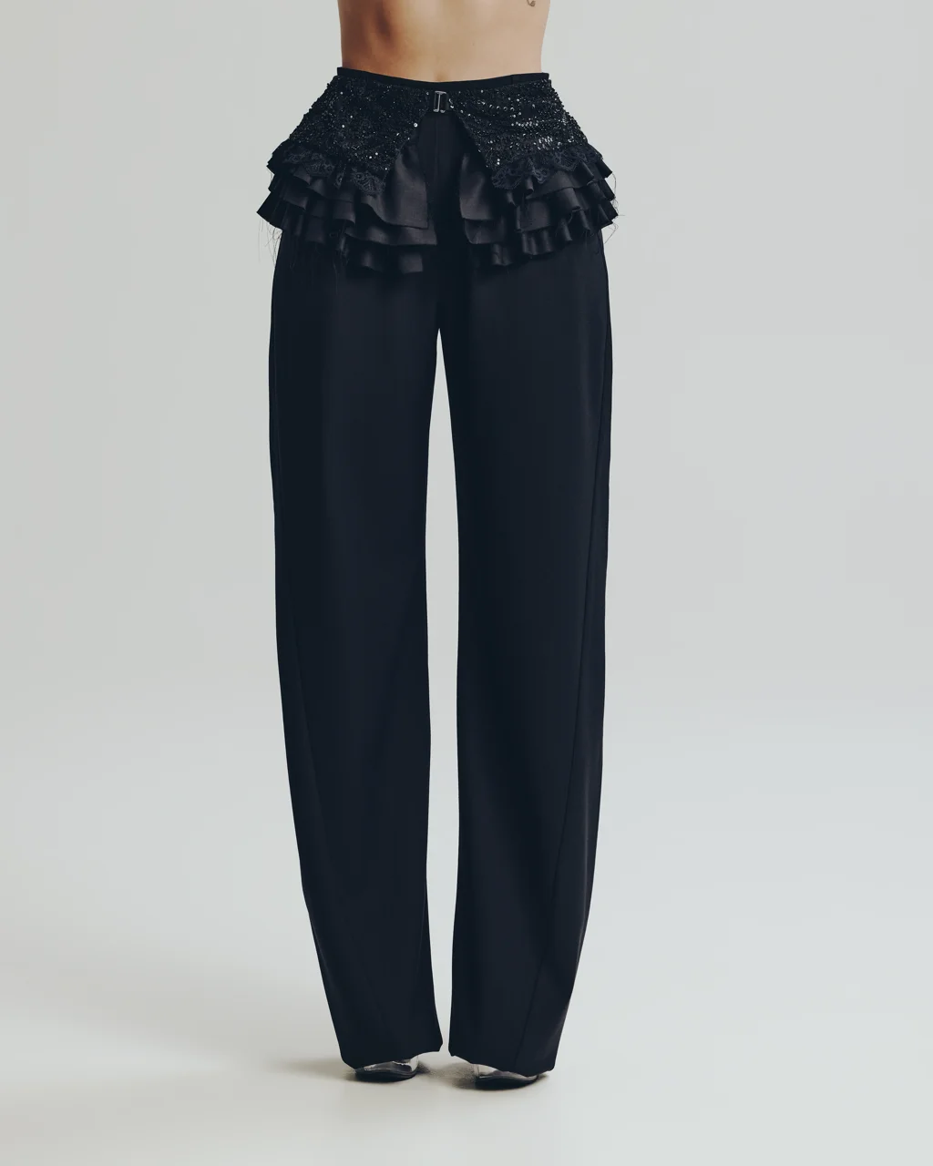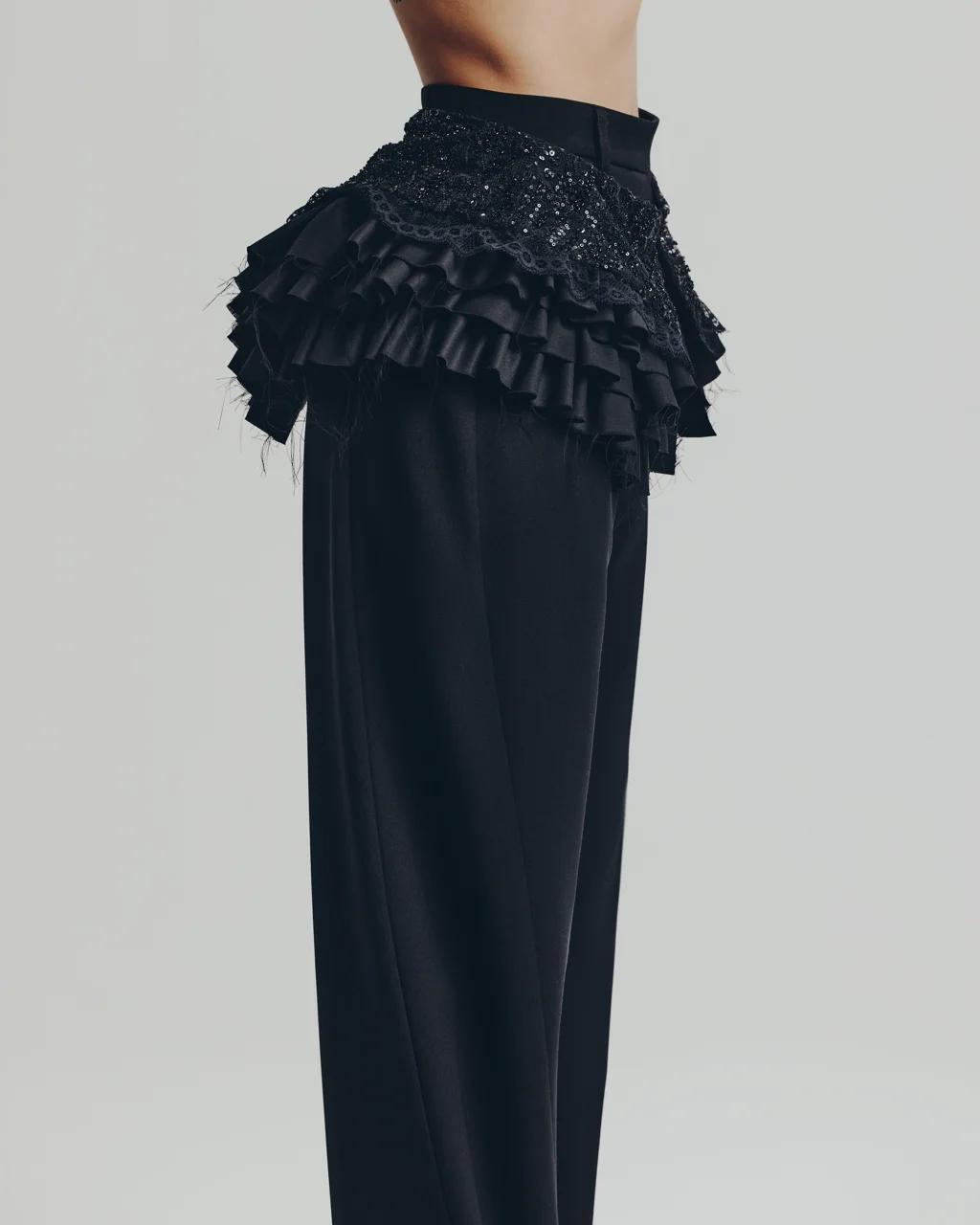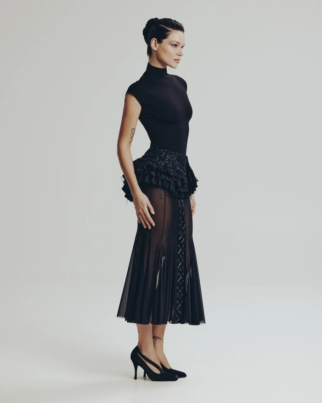 Широкий волан выполнен из 100% итальянской шерсти с глянцевым отливом, пояс и верхняя часть состоят из тонкого кружева расшитого бисером
