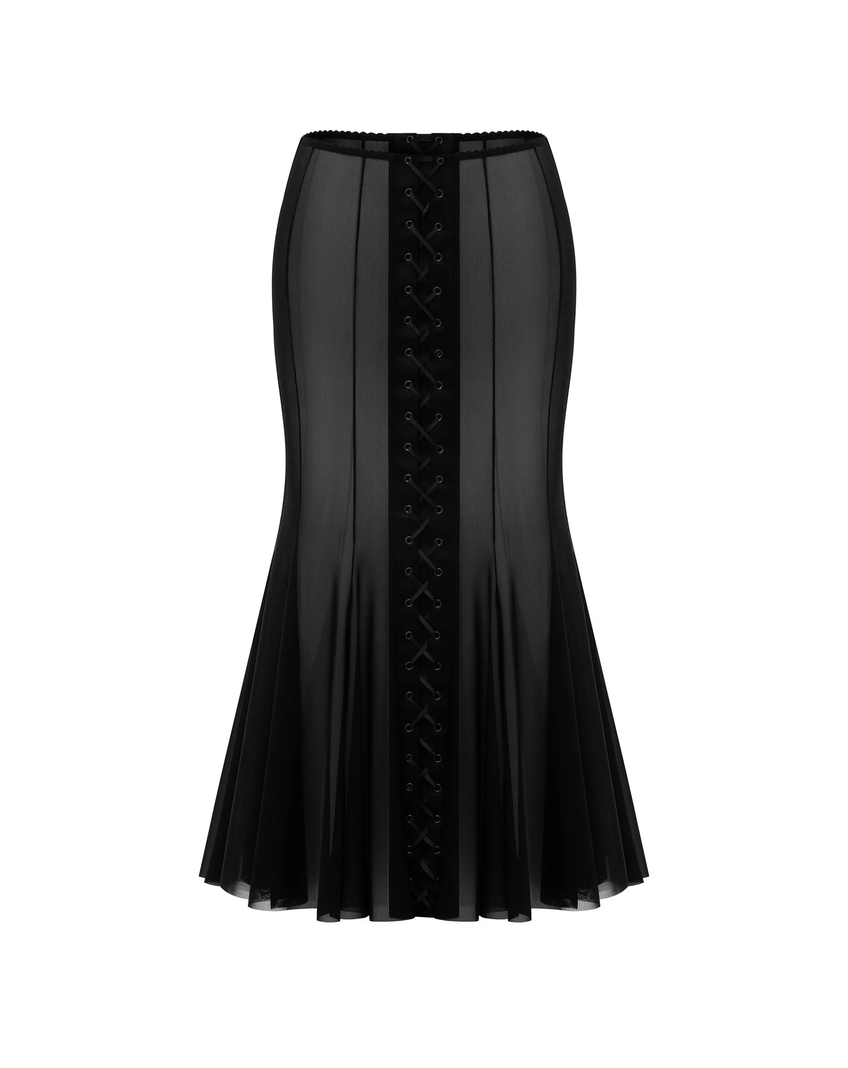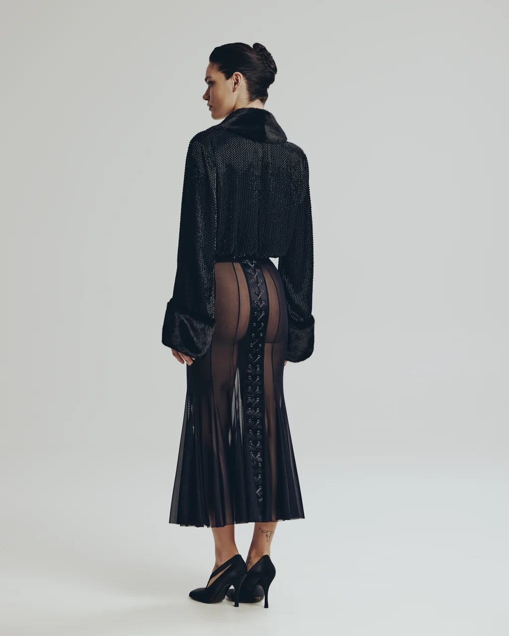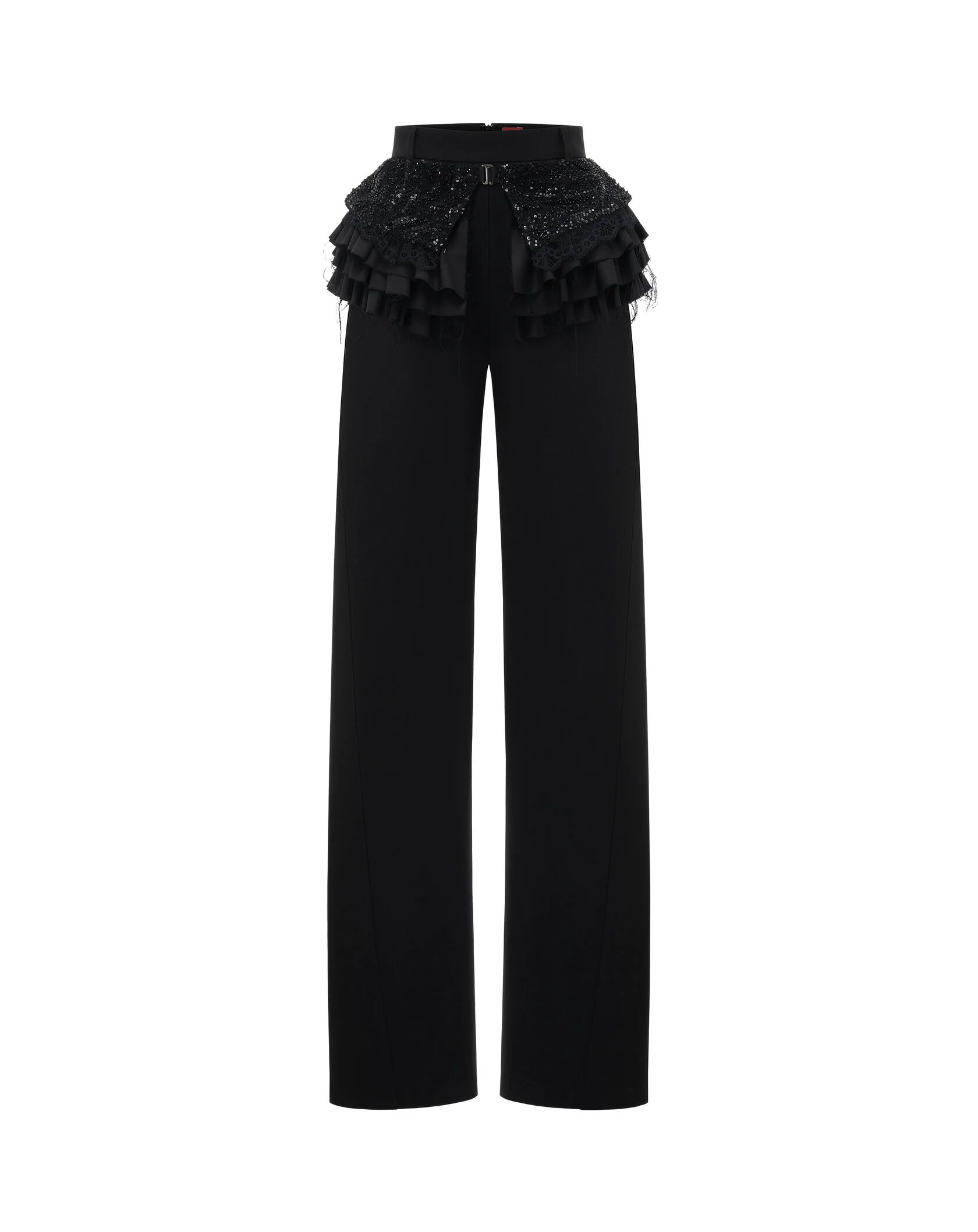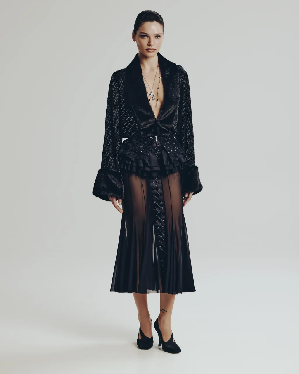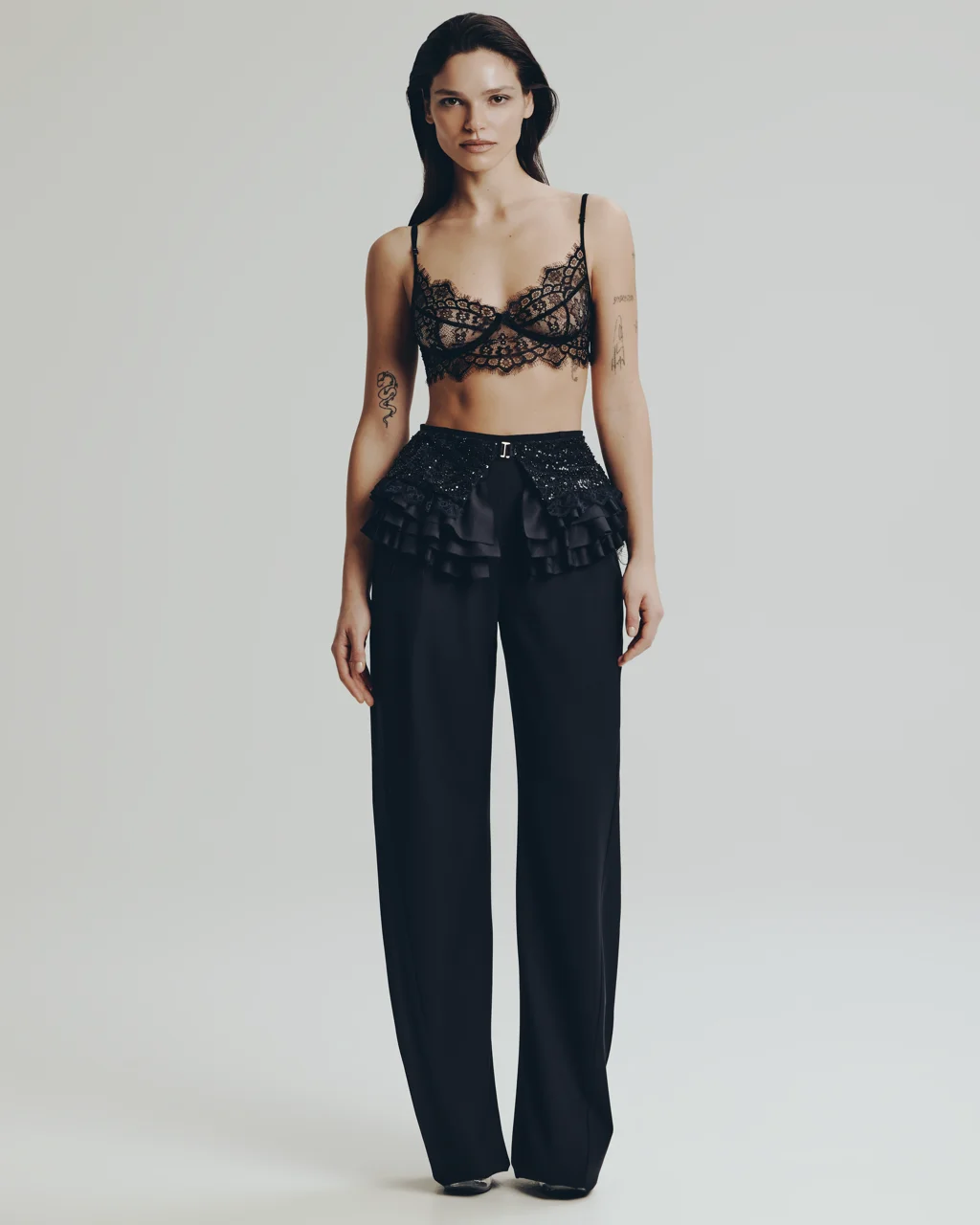 Широкий волан выполнен из 100% итальянской шерсти с глянцевым отливом, пояс и верхняя часть состоят из тонкого кружева расшитого бисером