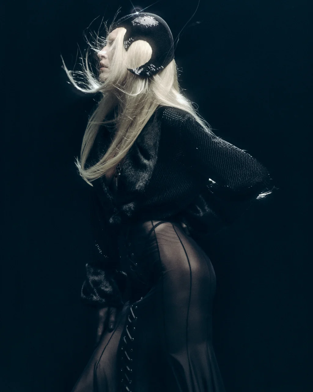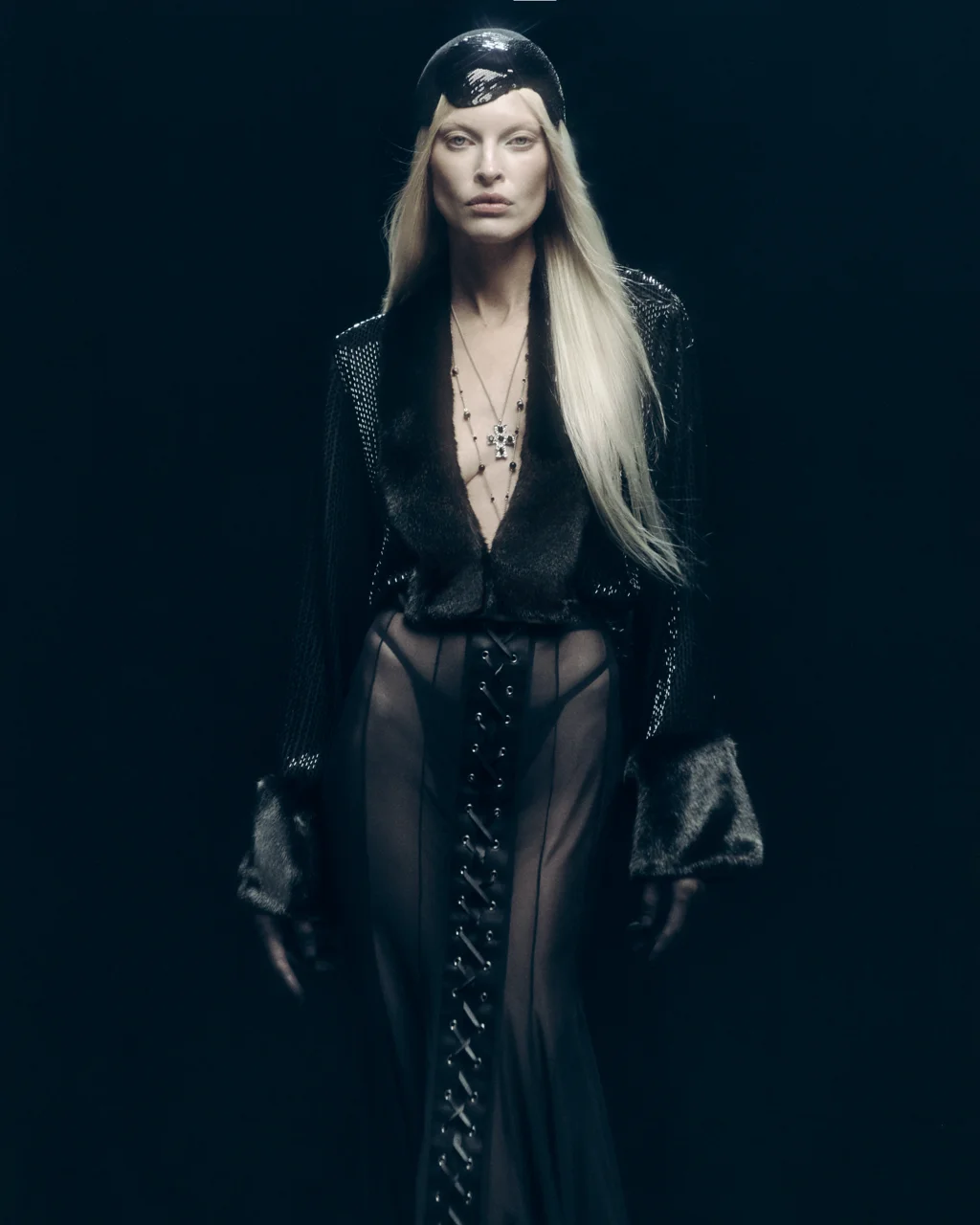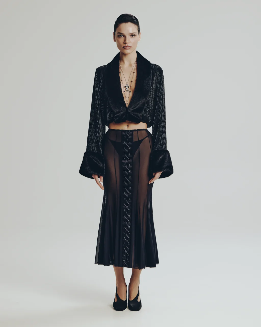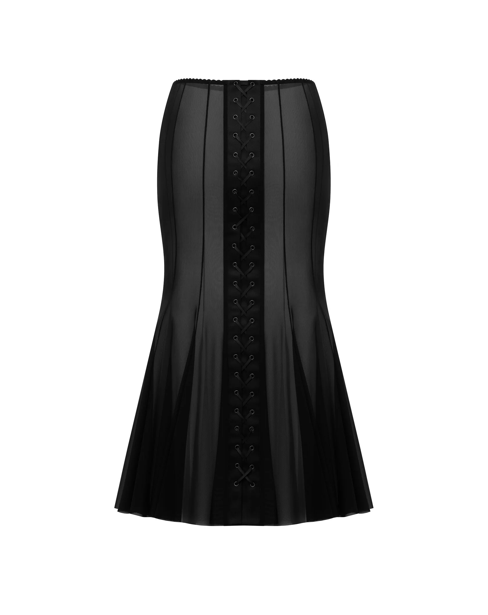 Широкий волан выполнен из 100% итальянской шерсти с глянцевым отливом, пояс и верхняя часть состоят из тонкого кружева расшитого бисером
