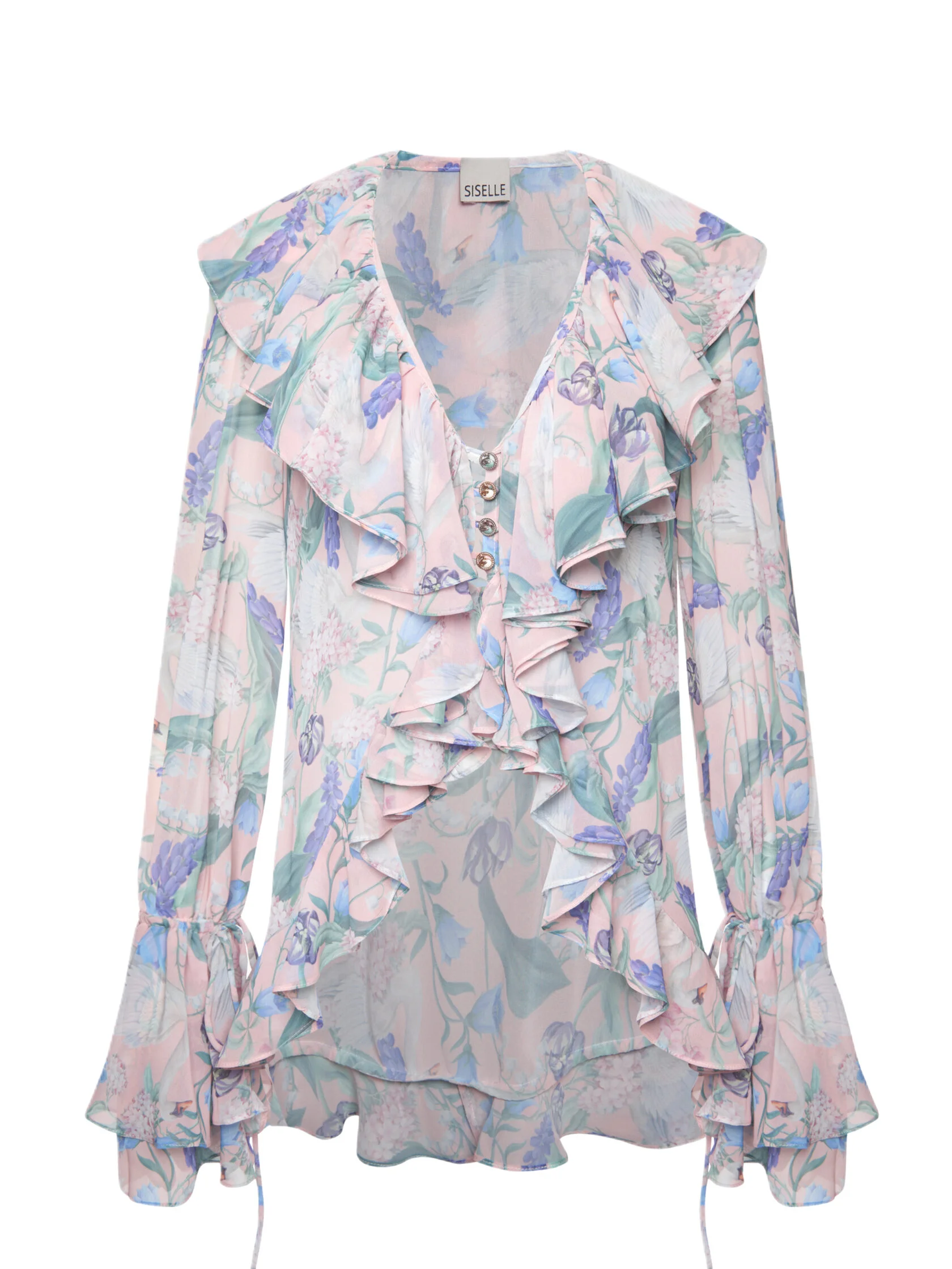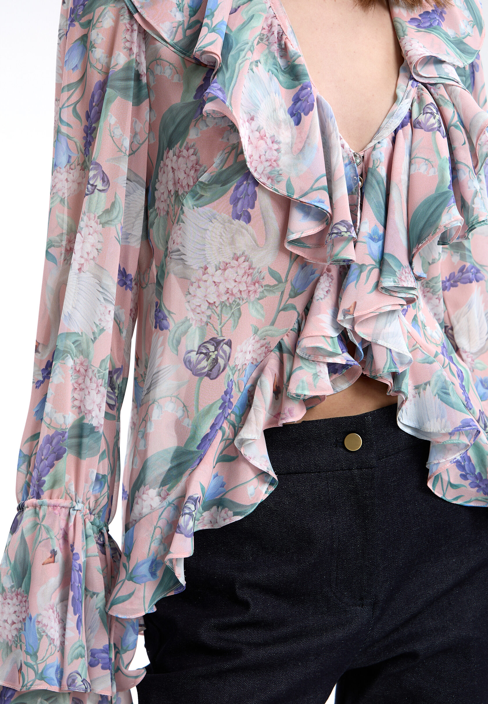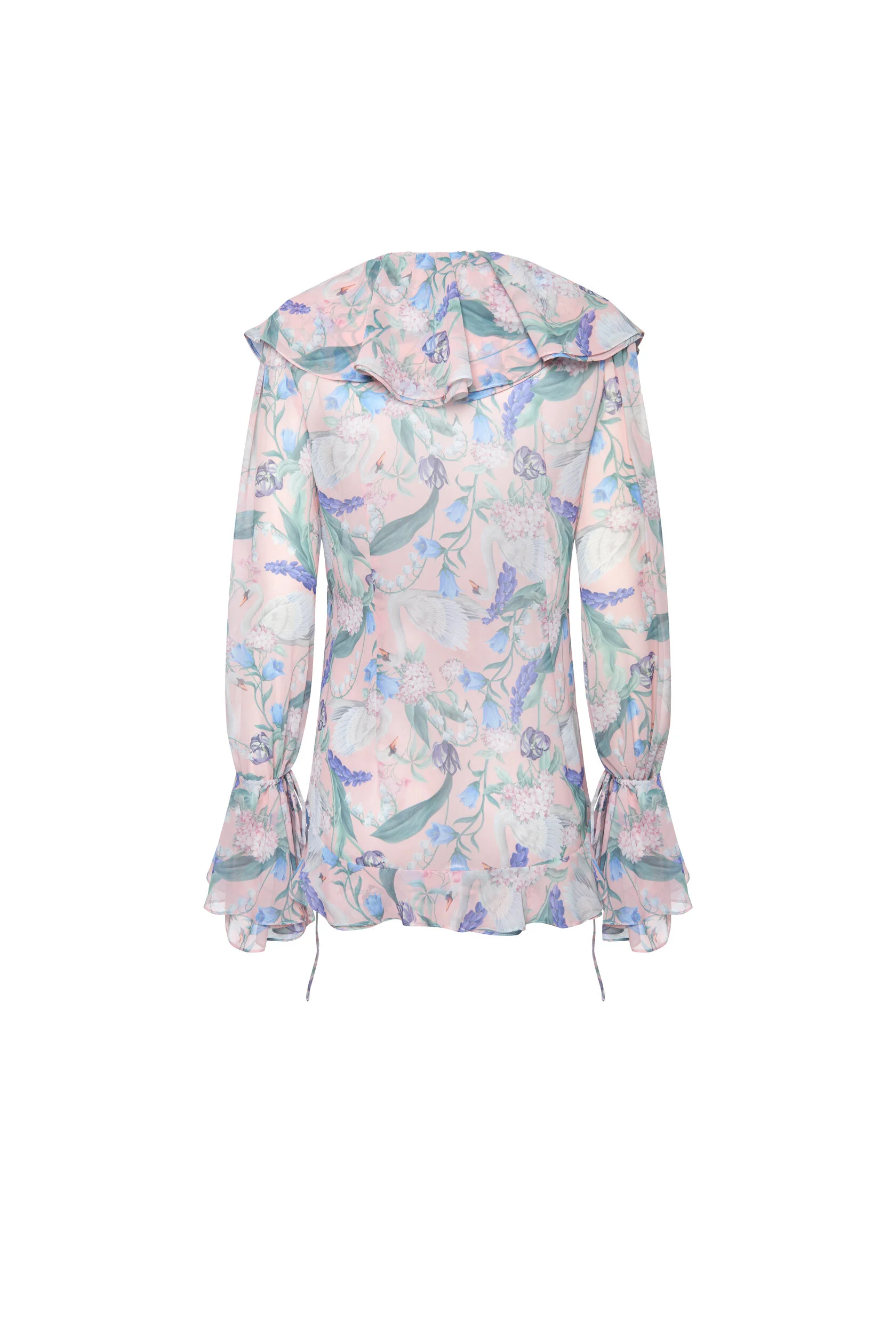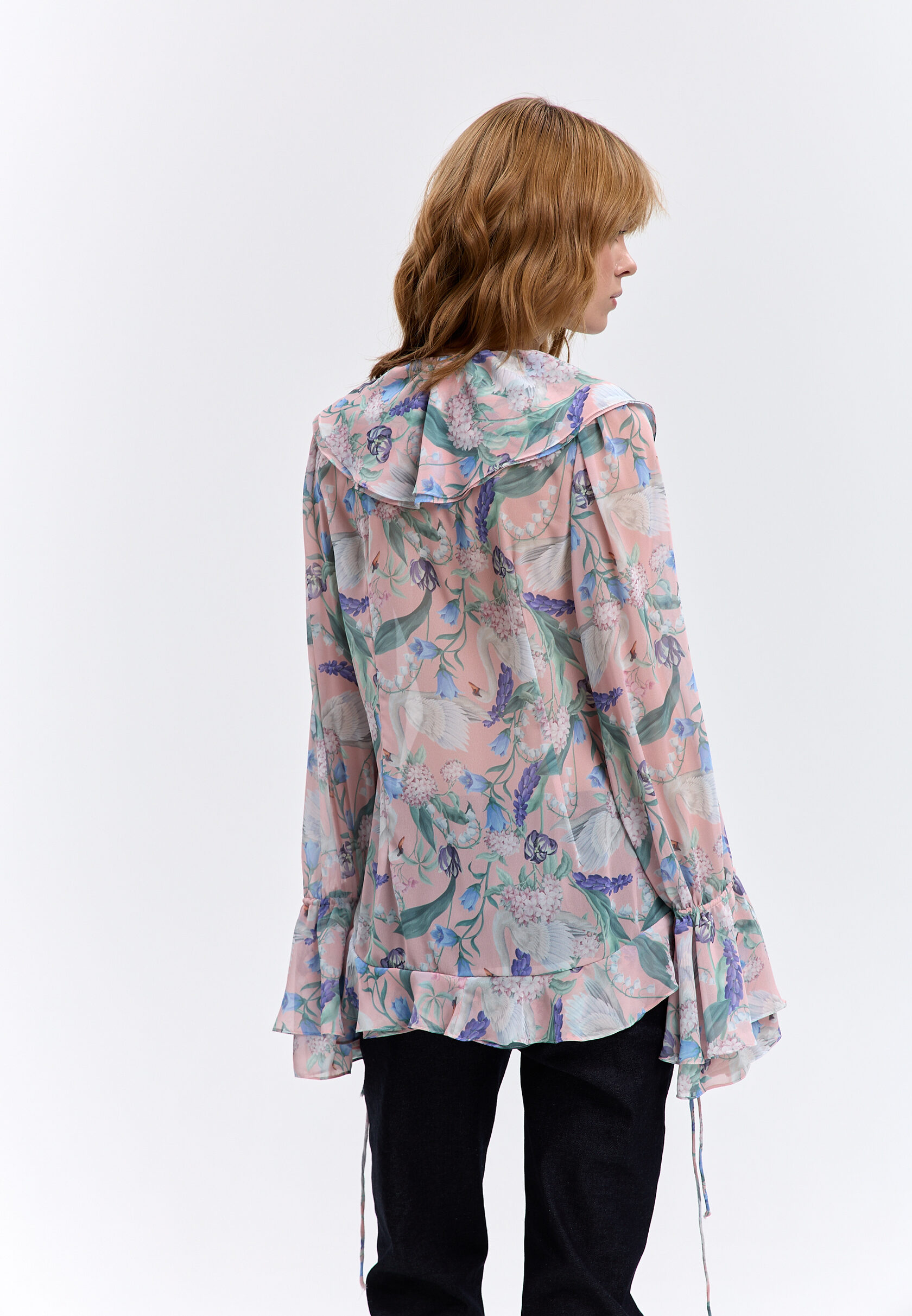 Блуза в викторианском стиле с рюшами с завязками на рукавах из итальянского шифона с эксклюзивным принтом "лебеди и цветы", украшенная брендовыми пуговицами в виде лебедя изумрудного и перламутрового цвета.