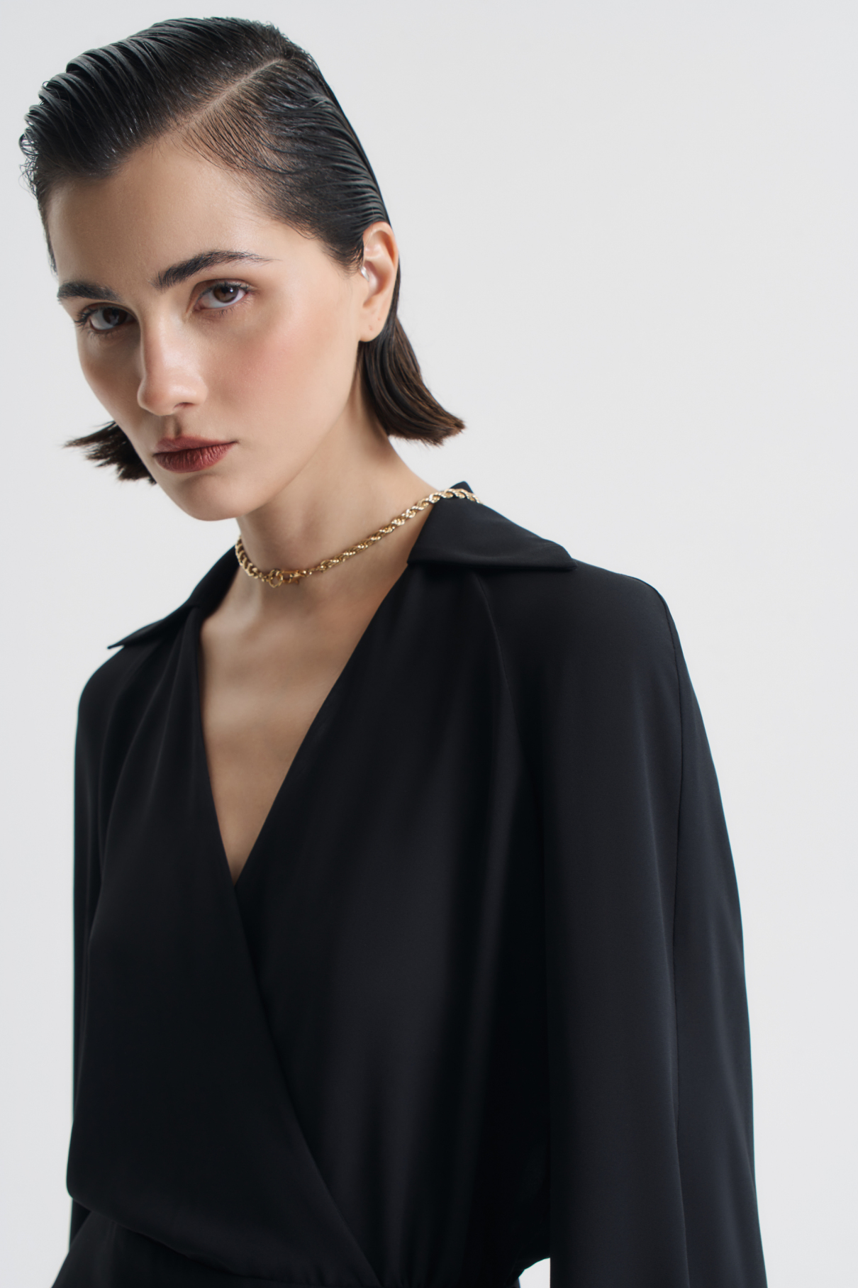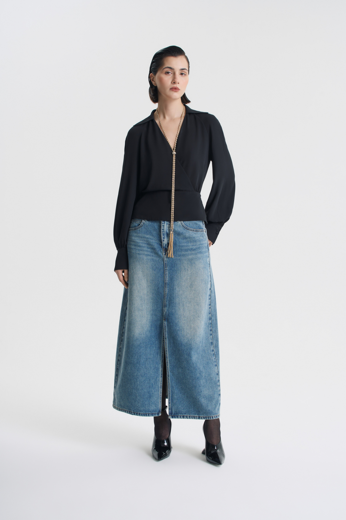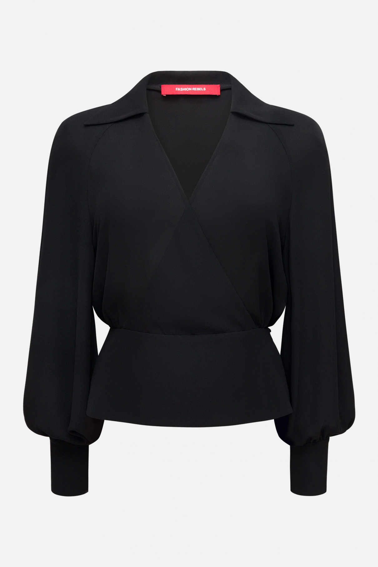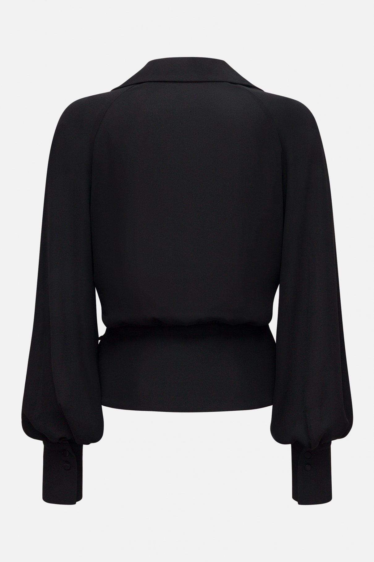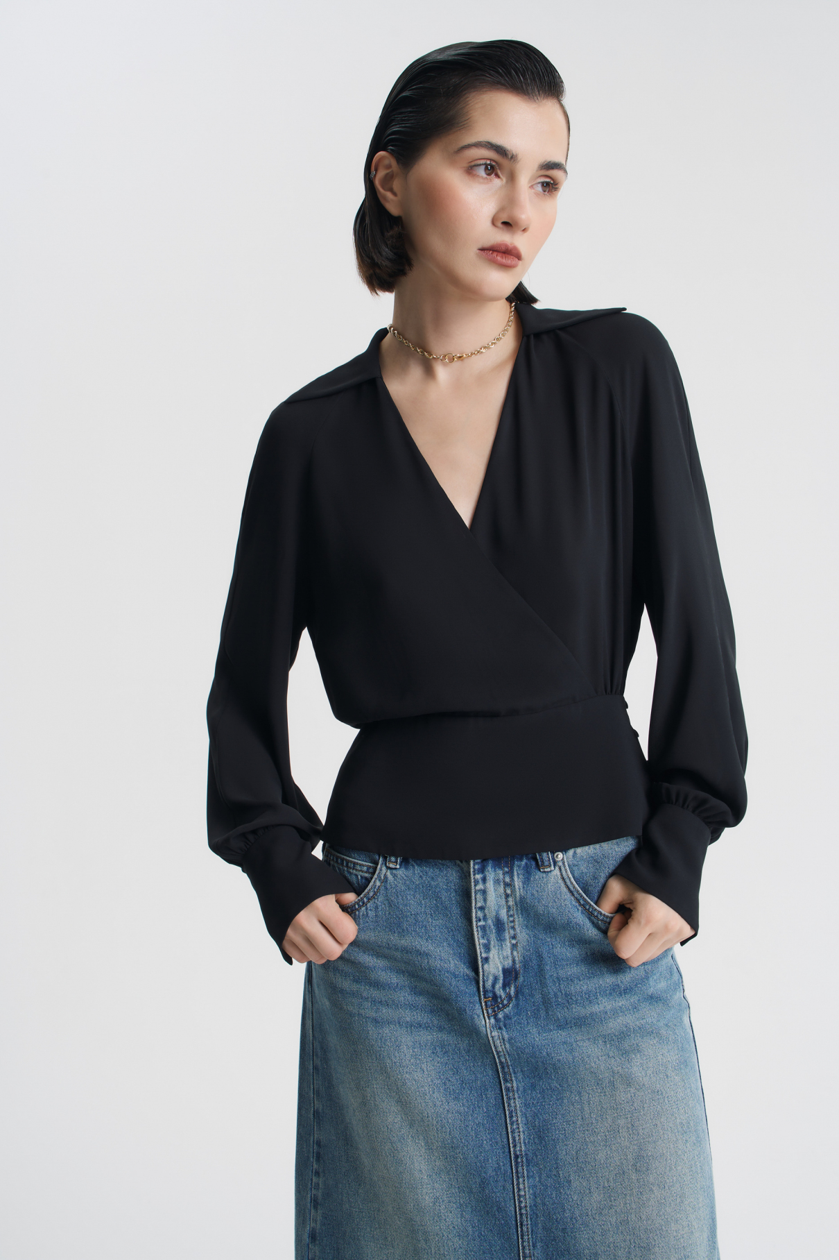 Блузка из шифона, одновременно свободная и прилегающая, красиво подчеркивает фигуру и элегантно дополняет любые образы с юбками, брюками и джинсами. Свободная в верхней части блузка на запах с V-образным вырезом и отложным воротничком образует деликатный напуск, а широкая продублированная баска в нижней части акцентирует линию талии. Свободный рукав также формирует напуск на высокую манжету с пуговицами. Блузка застегивается на элегантные обтяжные пуговицы с петлями по левому боку баски.