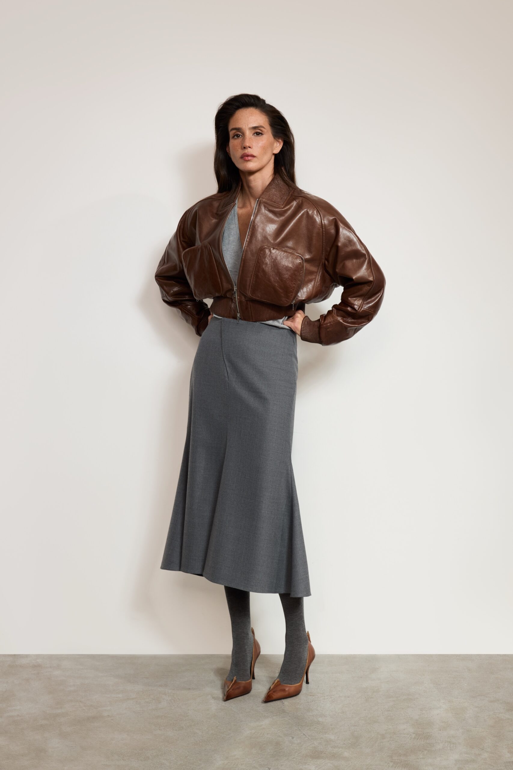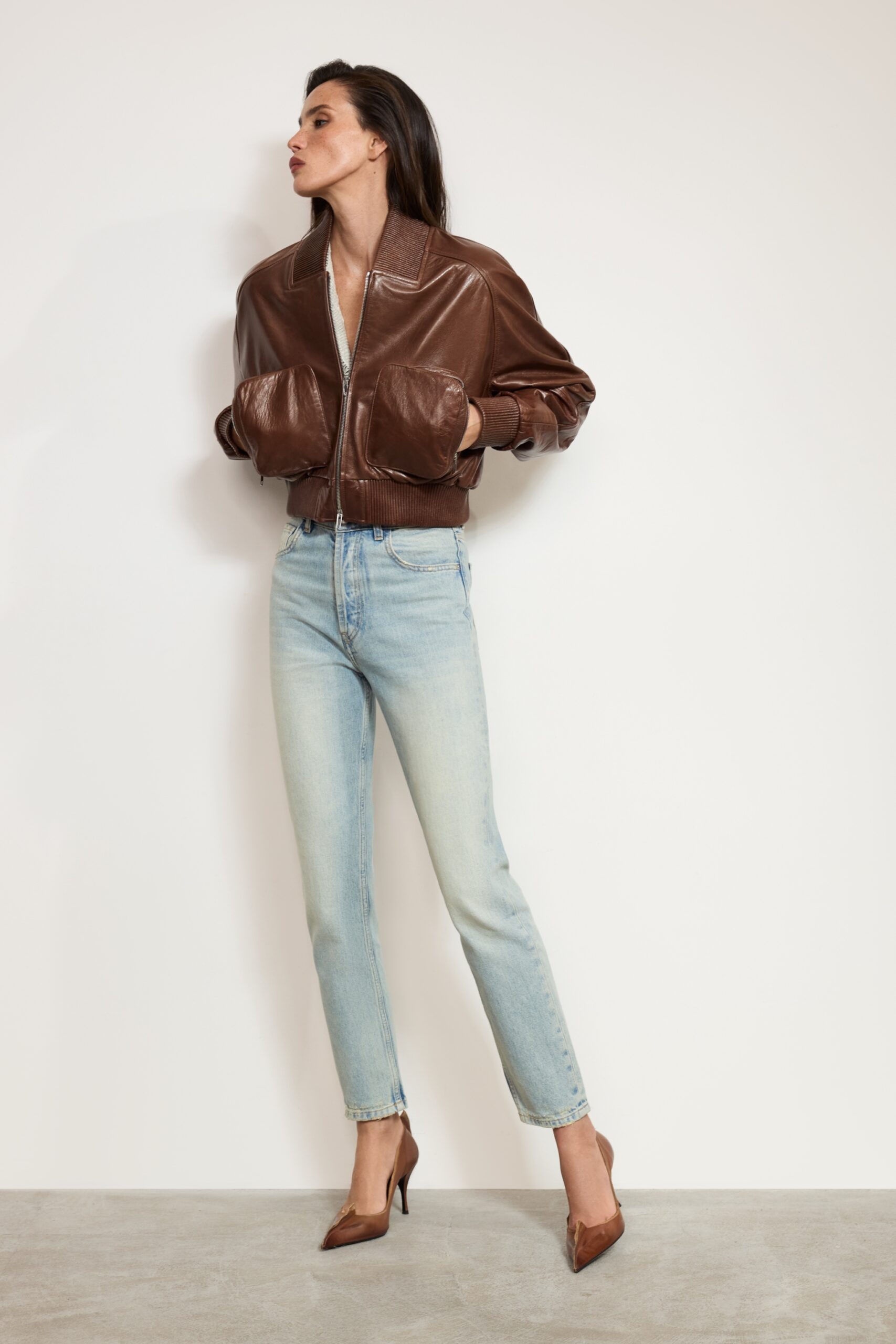 “Phoebe” — кожаная куртка-бомбер с выразительным силуэтом и архитектурной формой. Выполнена из мягкой натуральной кожи с благородным блеском. Объёмные накладные карманы и аккуратная линия плеч создают баланс между утилитарностью и женственностью.