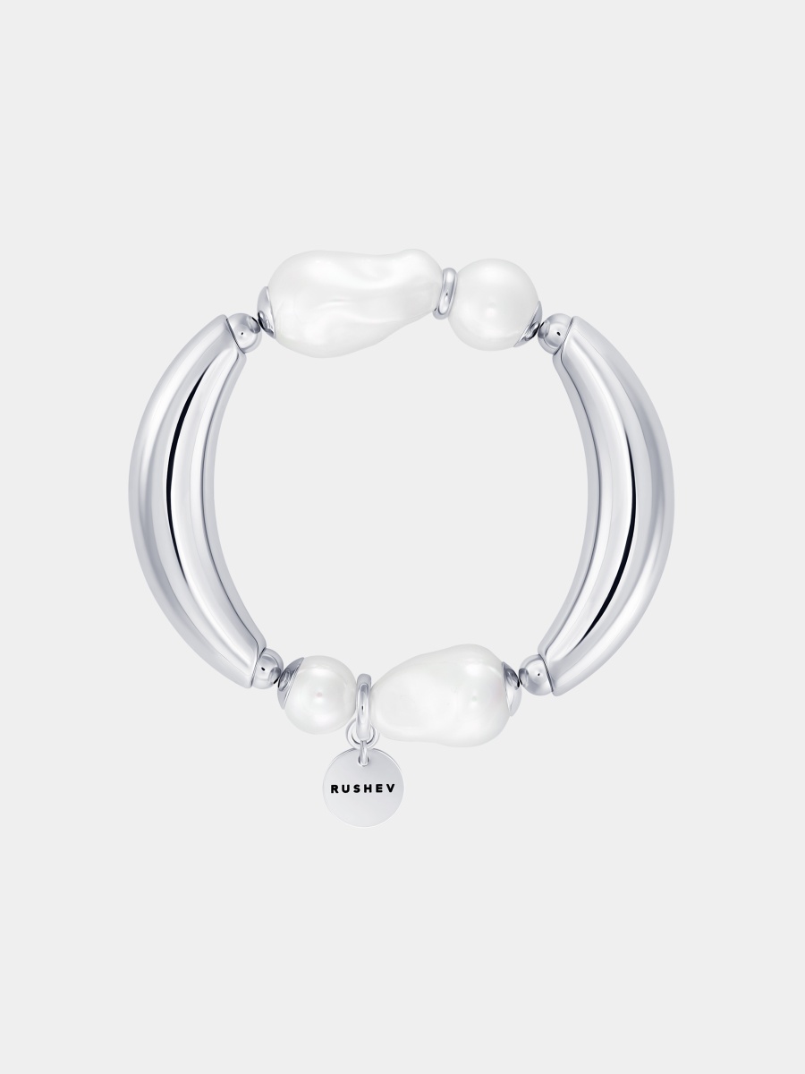 Асимметричный браслет "MOONLIGHT" с металлическими элементами в форме полумесяца и сияющим жемчугом разных форм и размеров.