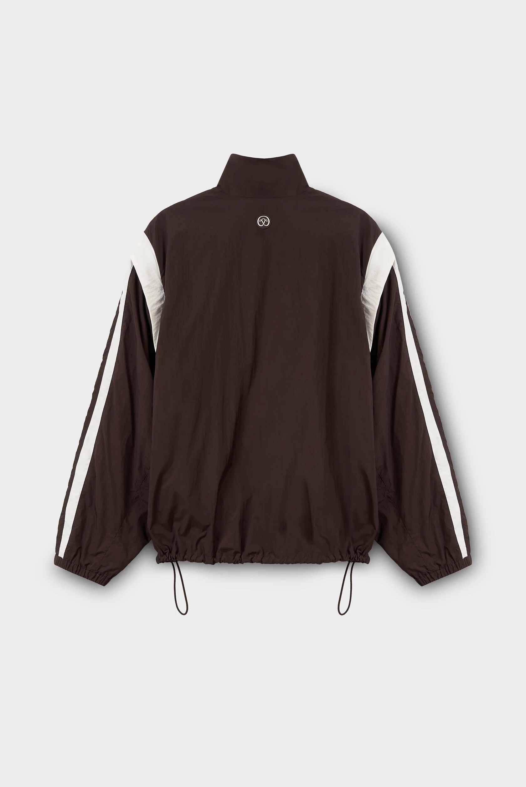 Лёгкая куртка из тафты в глубоком коричневом оттенке. Ткань матовая, с мягкой фактурой и лёгким «шорохом» в движении — держит форму, но остаётся пластичной.