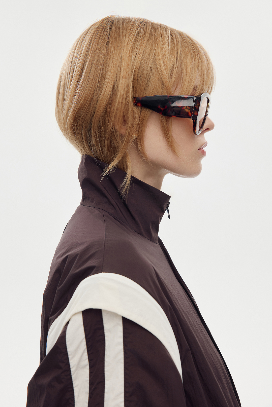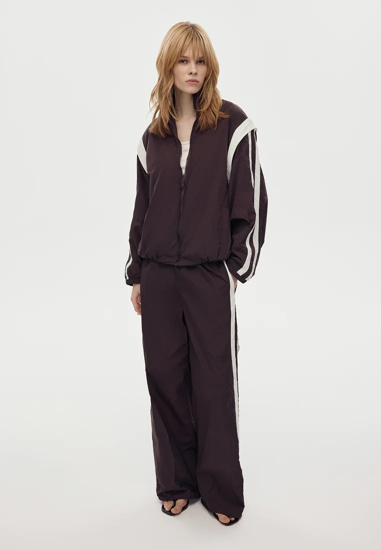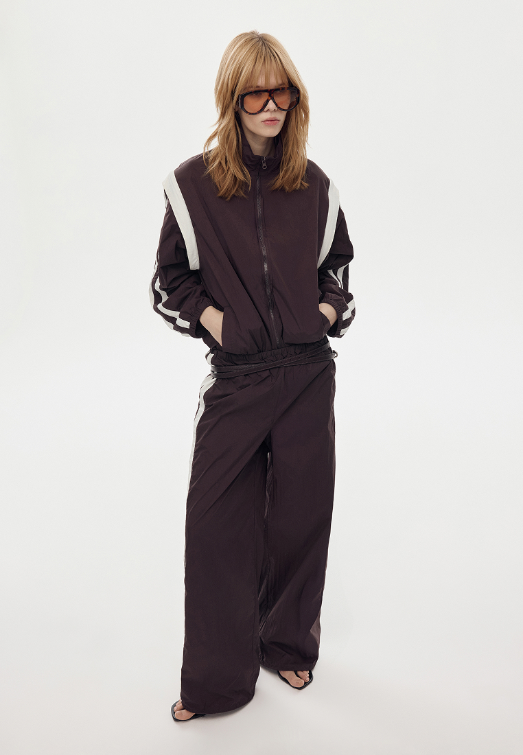 Молочные лампасы добавляют графику и вытягивают силуэт. Вертикали работают спокойно и точно — без лишнего спорта, скорее как акцент. Рукава отстёгиваются, и куртка превращается в жилет. Это удобная трансформация: один предмет — два варианта стилизации.