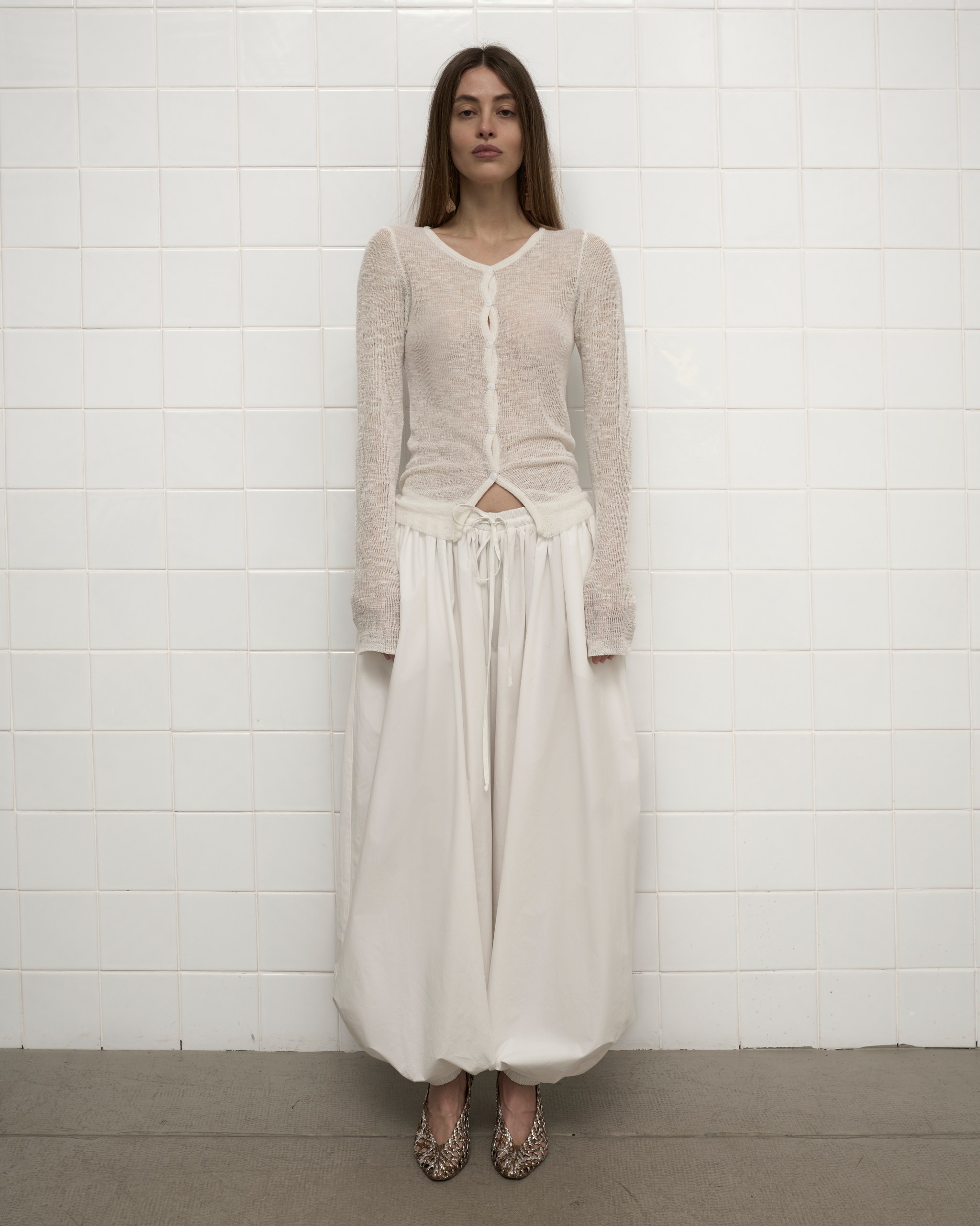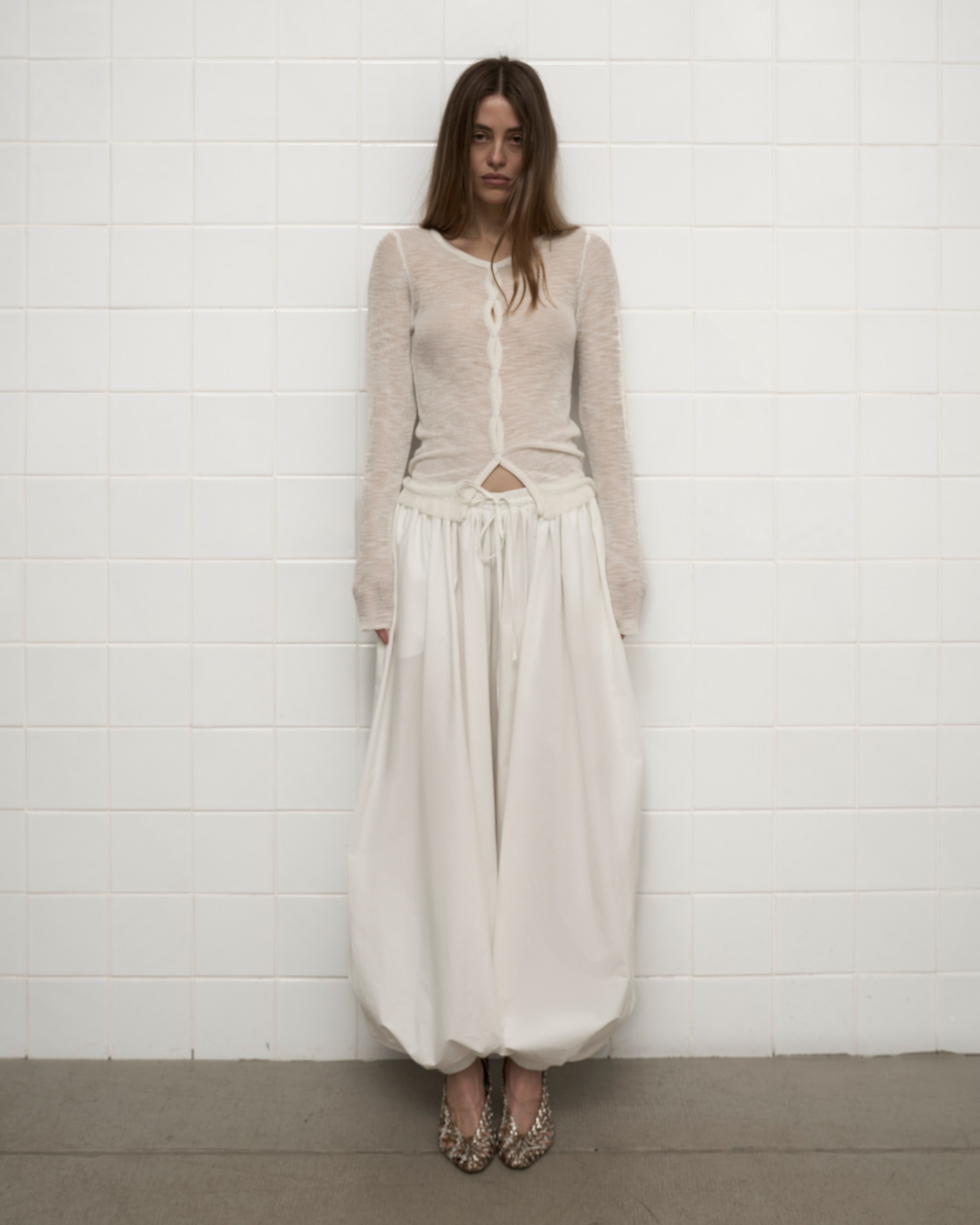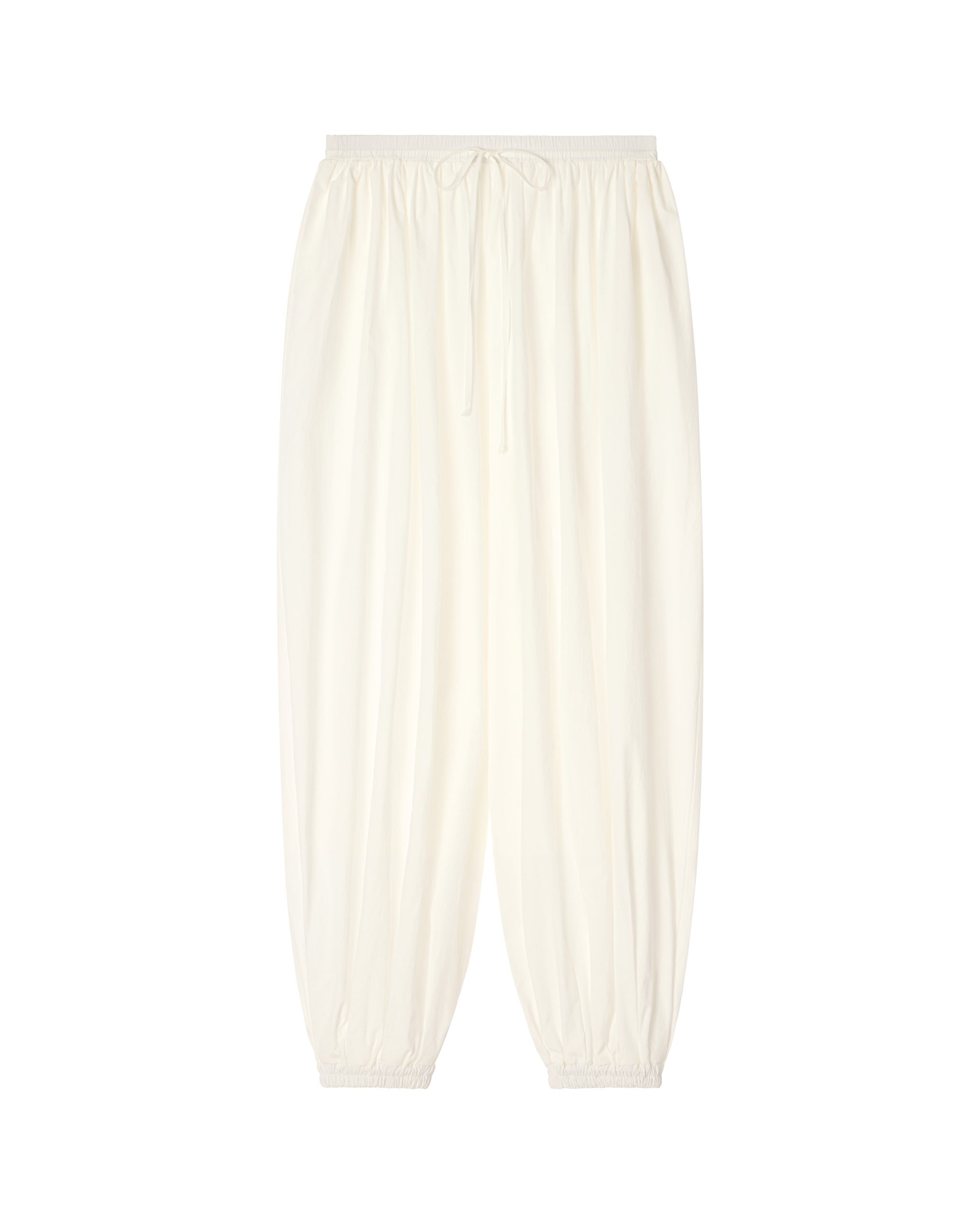 Свободные молочные брюки-шаровары легко впишутся в гардероб — сочетаются как с яркими, так и с базовыми оттенками. Это удобная база для неформального образа: например, с боди и грубыми ботинками.