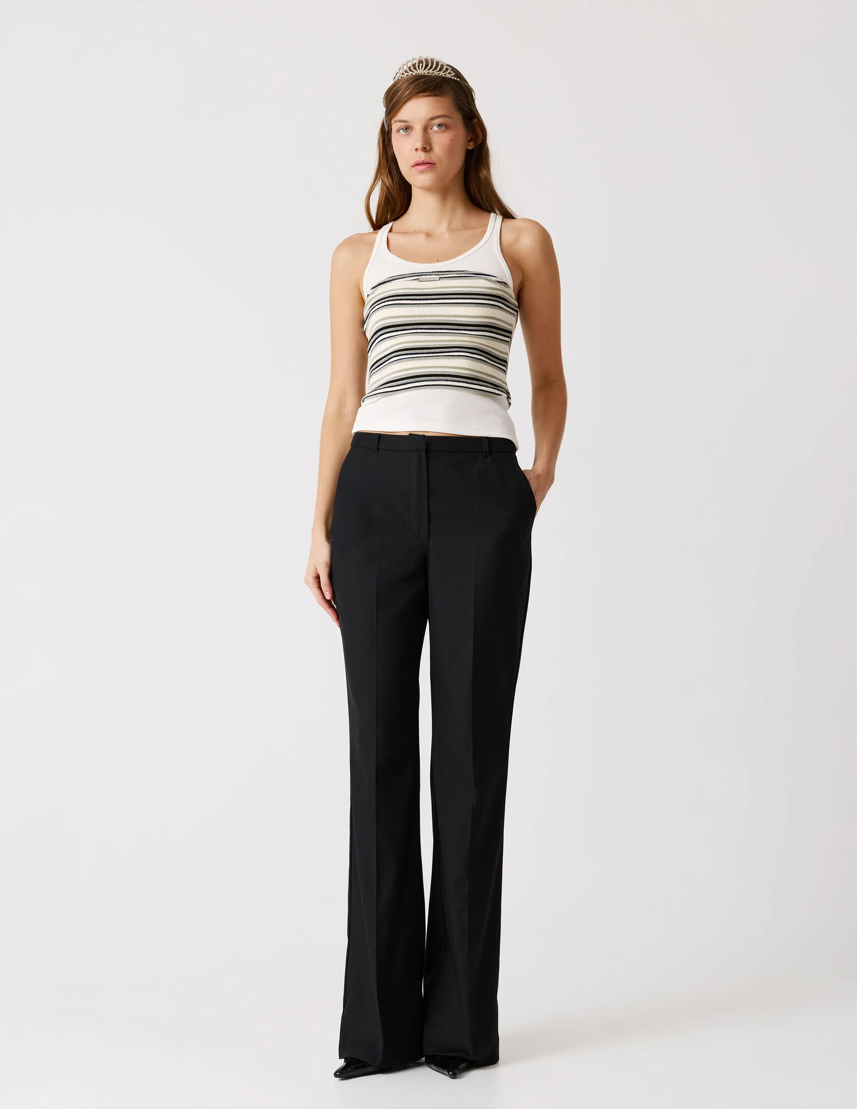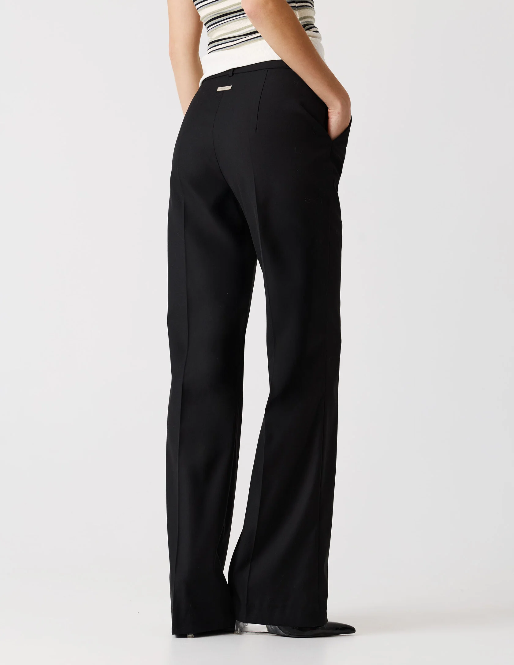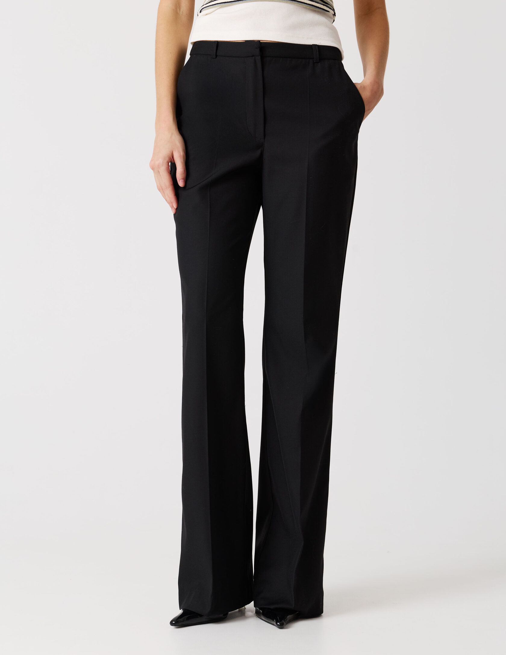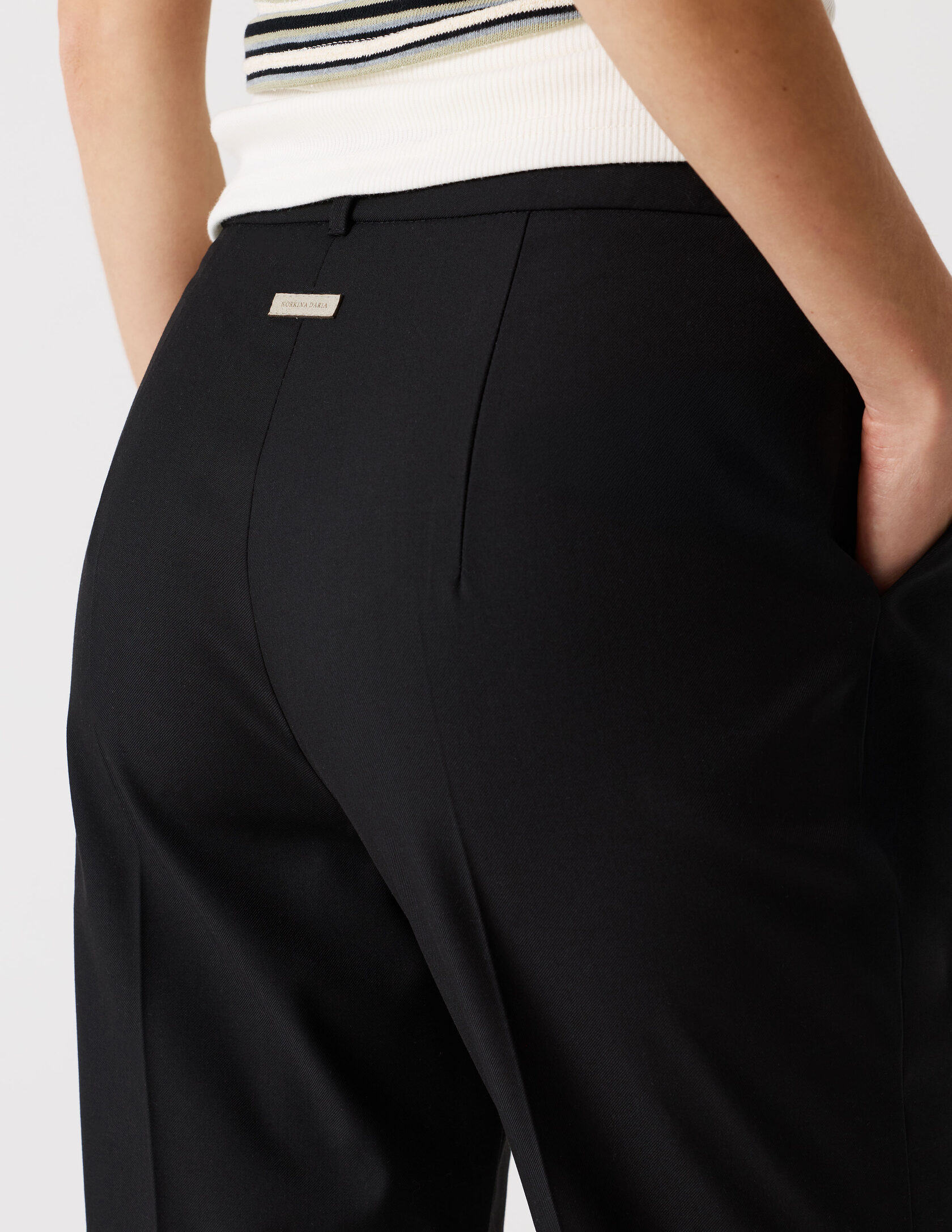 Классические брюки со стрелками и лёгким расклешением к низу, выполнены из качественной костюмной ткани. Чёткая стрелка подчёркивает вертикаль и вытягивает силуэт, а лаконичный пояс со шлёвками и классическая застёжка сохраняют чистоту линии. Брюки идеально сочетаются с пиджаком «Главная роль» или могут стать самостоятельным элементом гардероба.