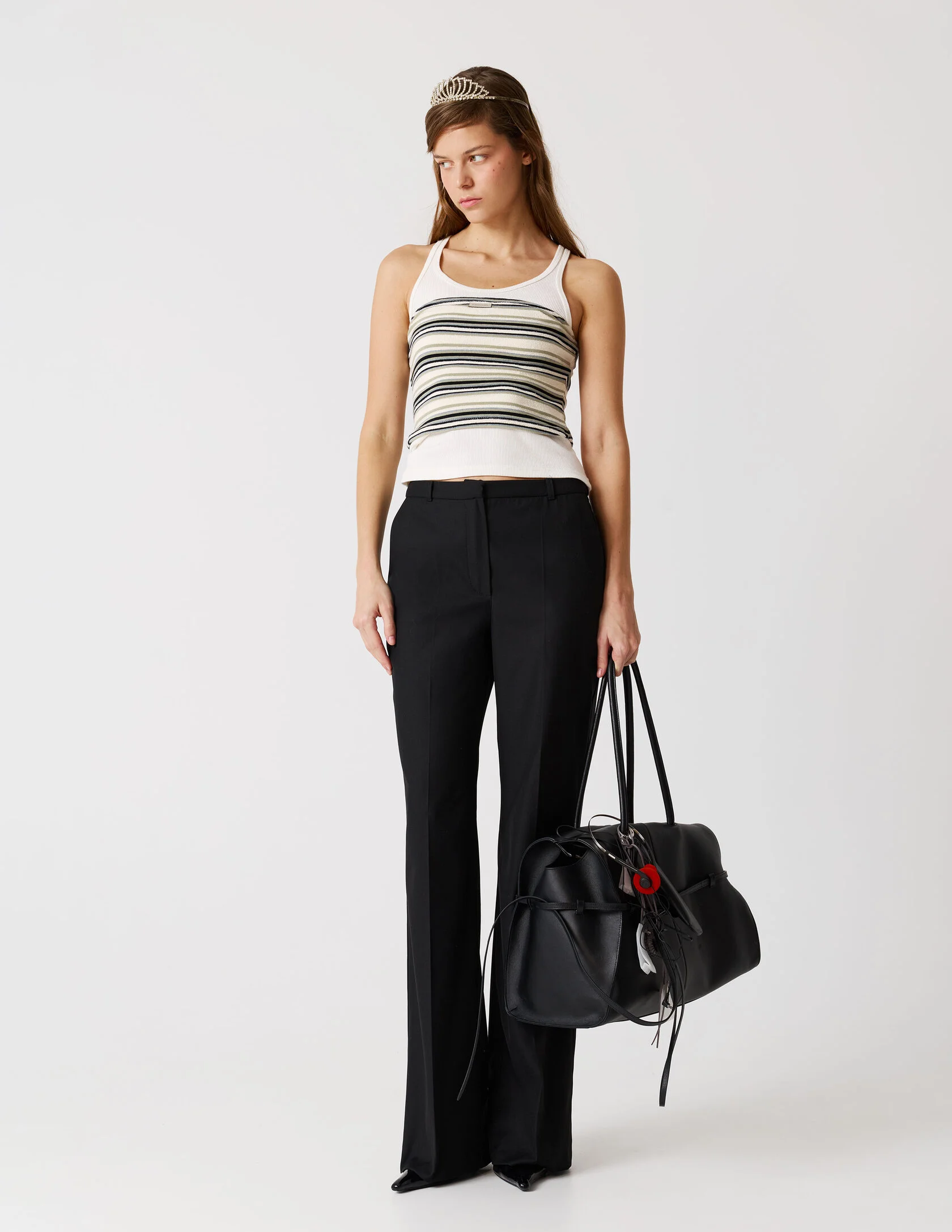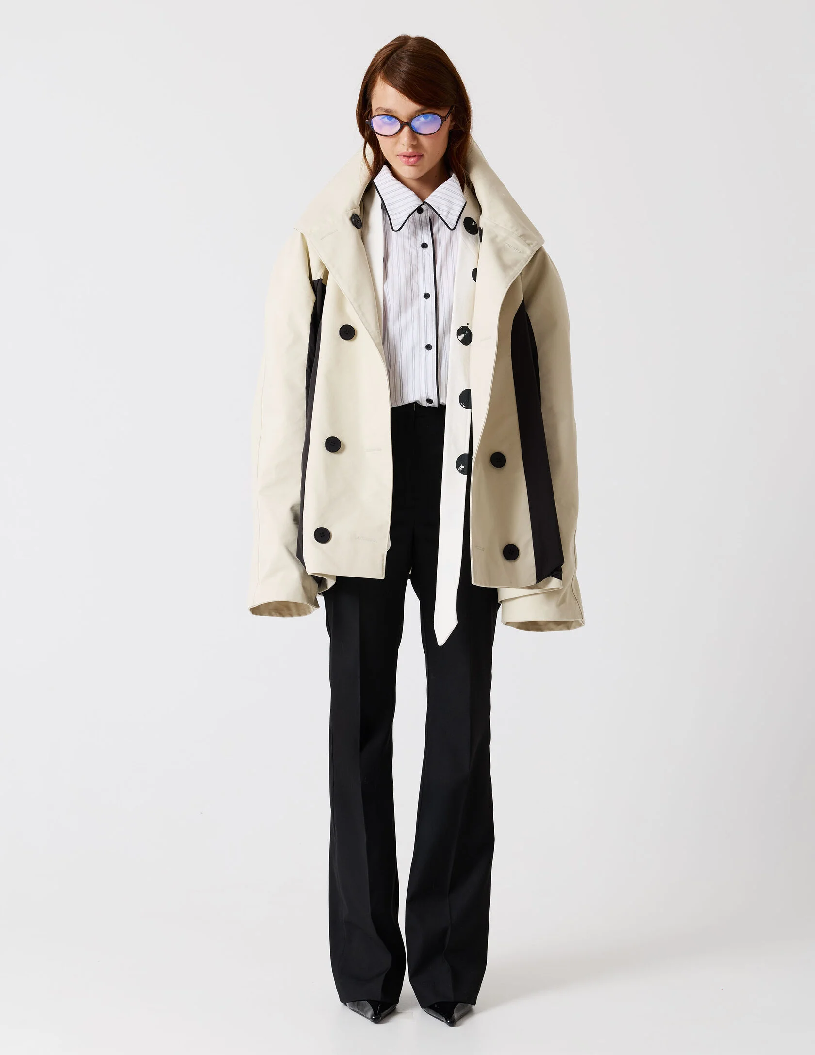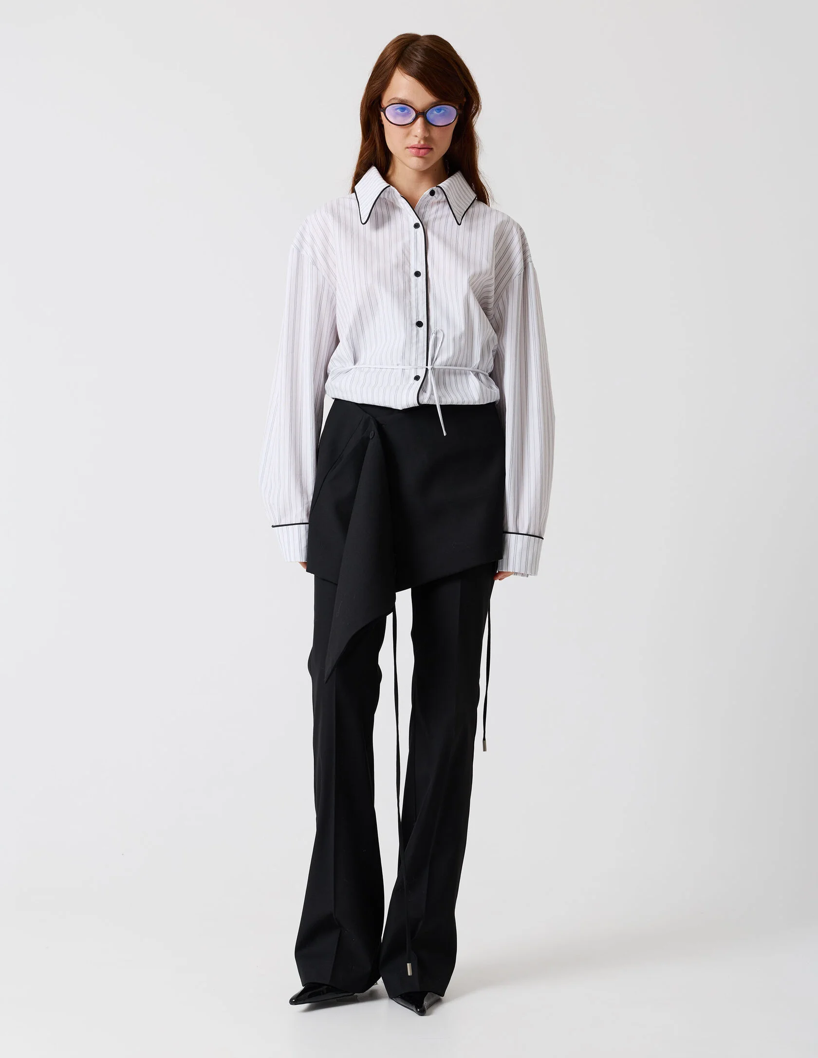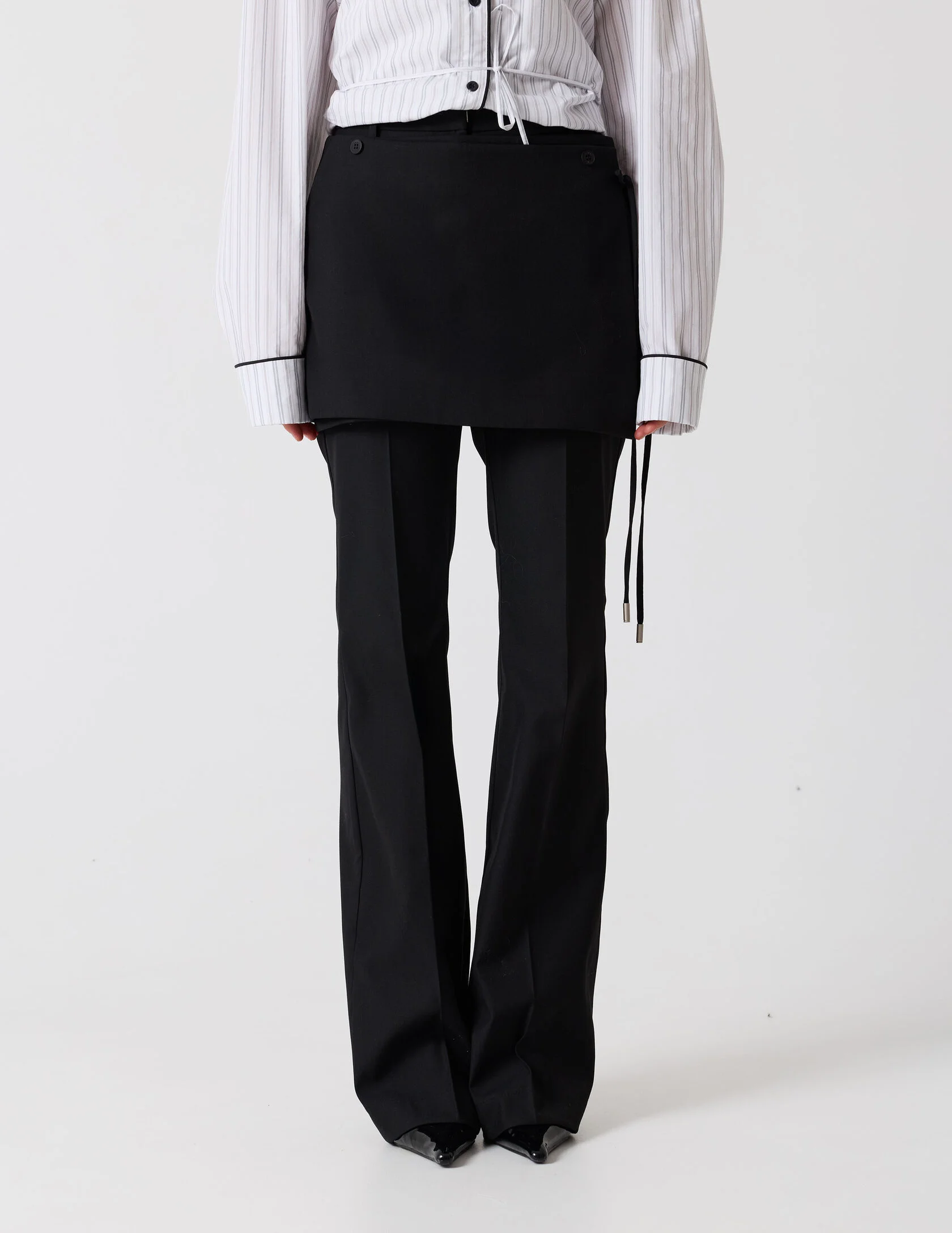 Классические брюки со стрелками и лёгким расклешением к низу, выполнены из качественной костюмной ткани. Чёткая стрелка подчёркивает вертикаль и вытягивает силуэт, а лаконичный пояс со шлёвками и классическая застёжка сохраняют чистоту линии. Брюки идеально сочетаются с пиджаком «Главная роль» или могут стать самостоятельным элементом гардероба.