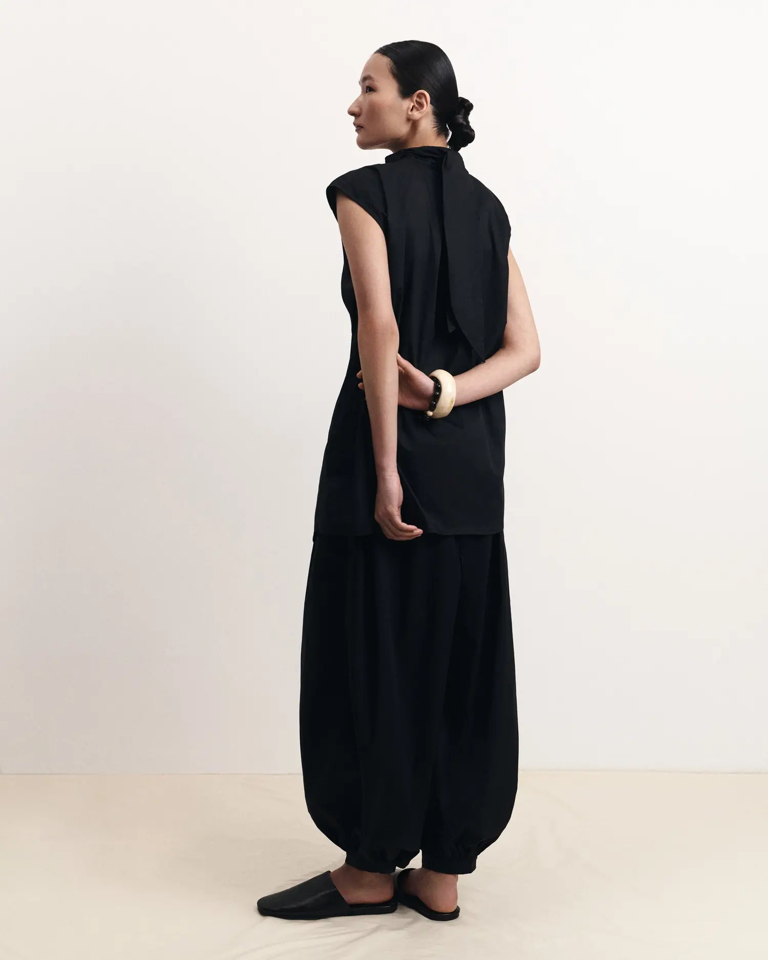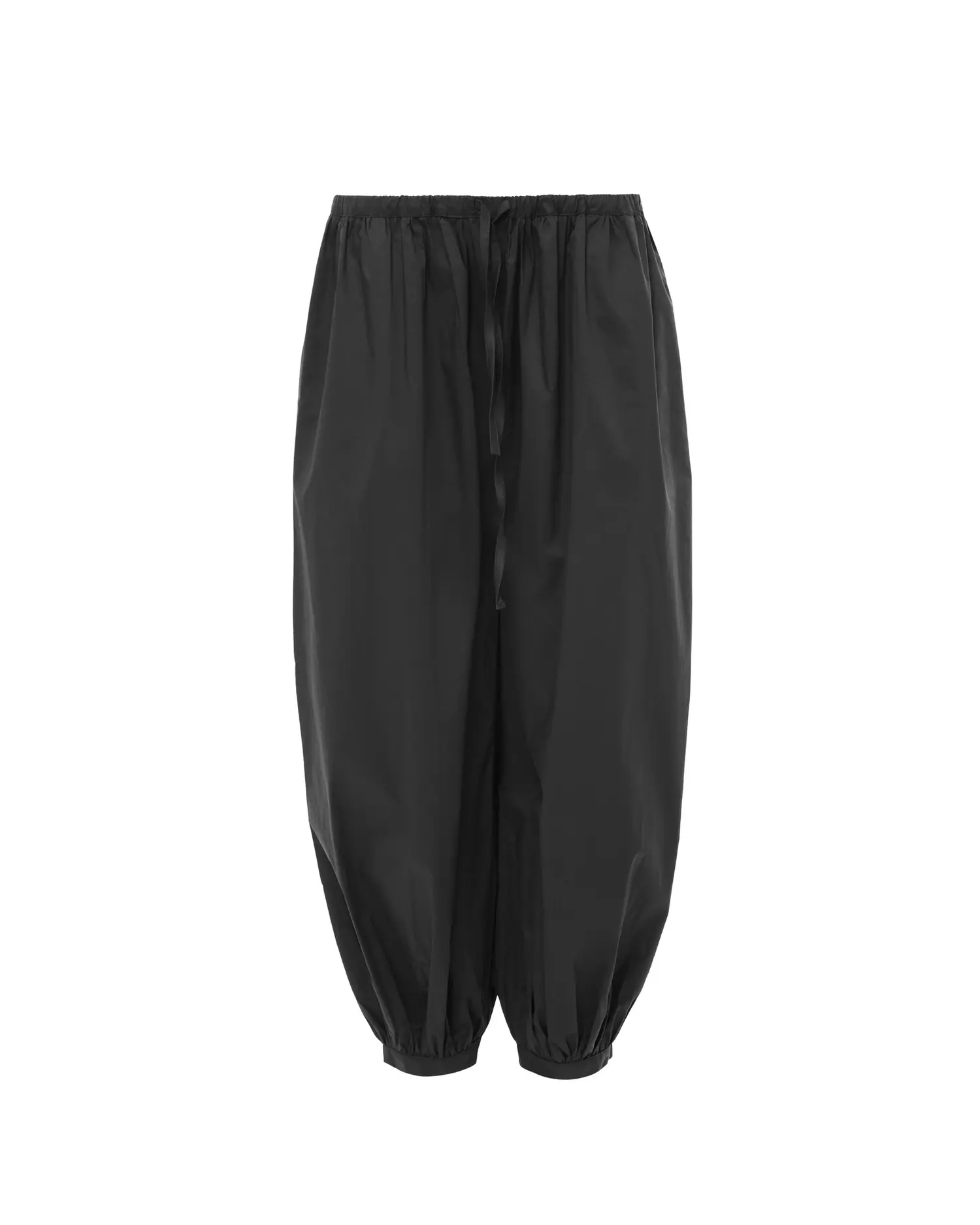 Зауженный книзу крой брюк визуально сохраняет лёгкость образа, не утяжеляя бедра и акцентируя изящество тонких щиколоток. Мягкие складки, собранные вручную, добавляют динамики в движении, а регулируемая кулиска обеспечивает идеальную посадку по фигуре.