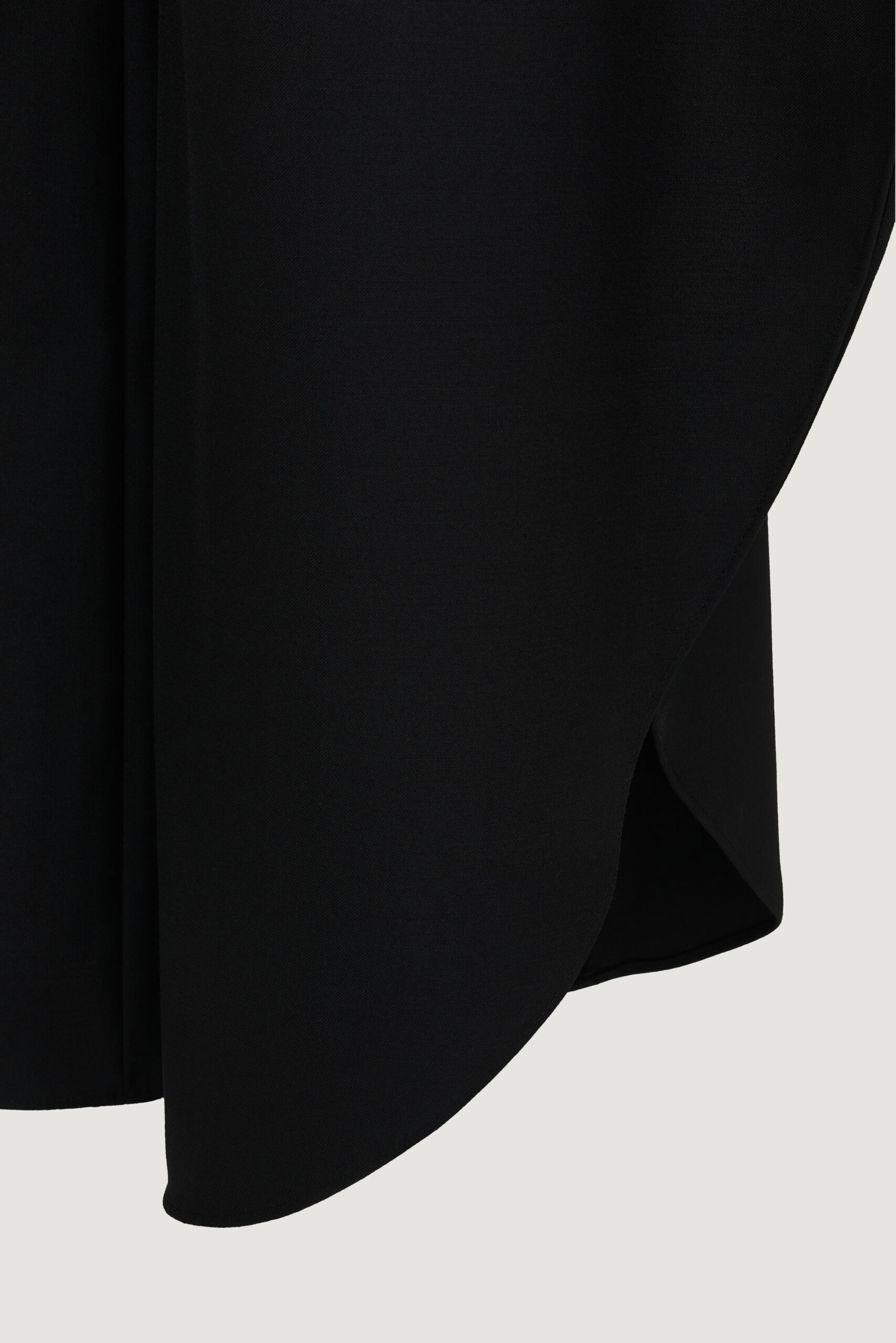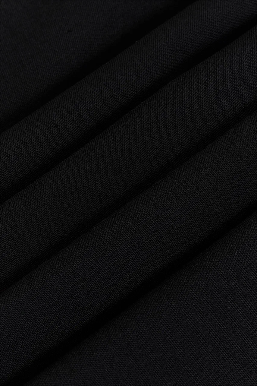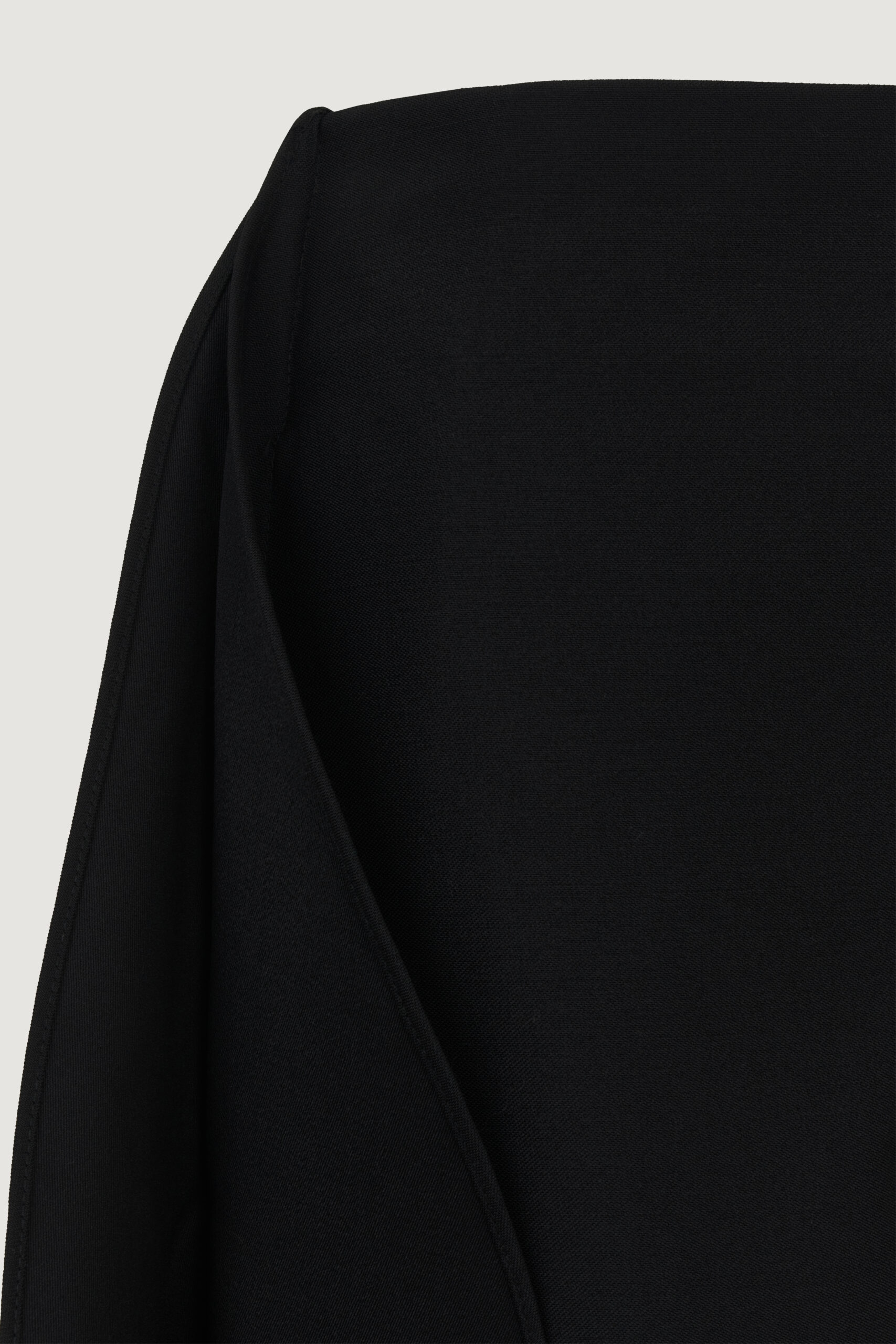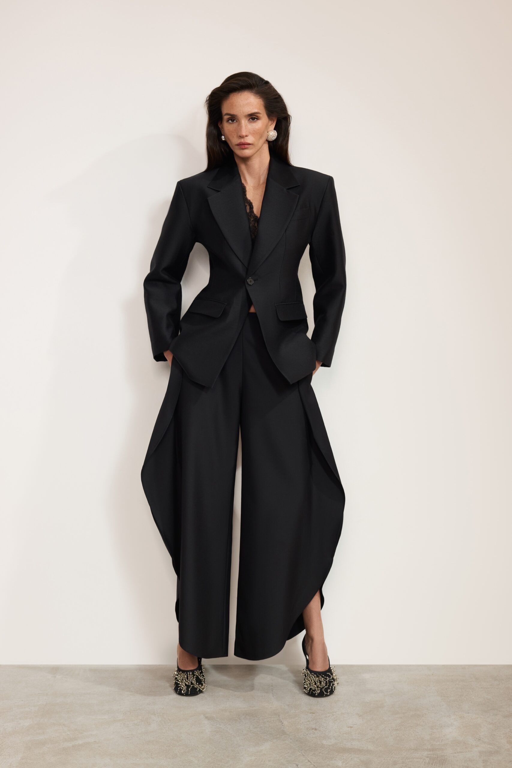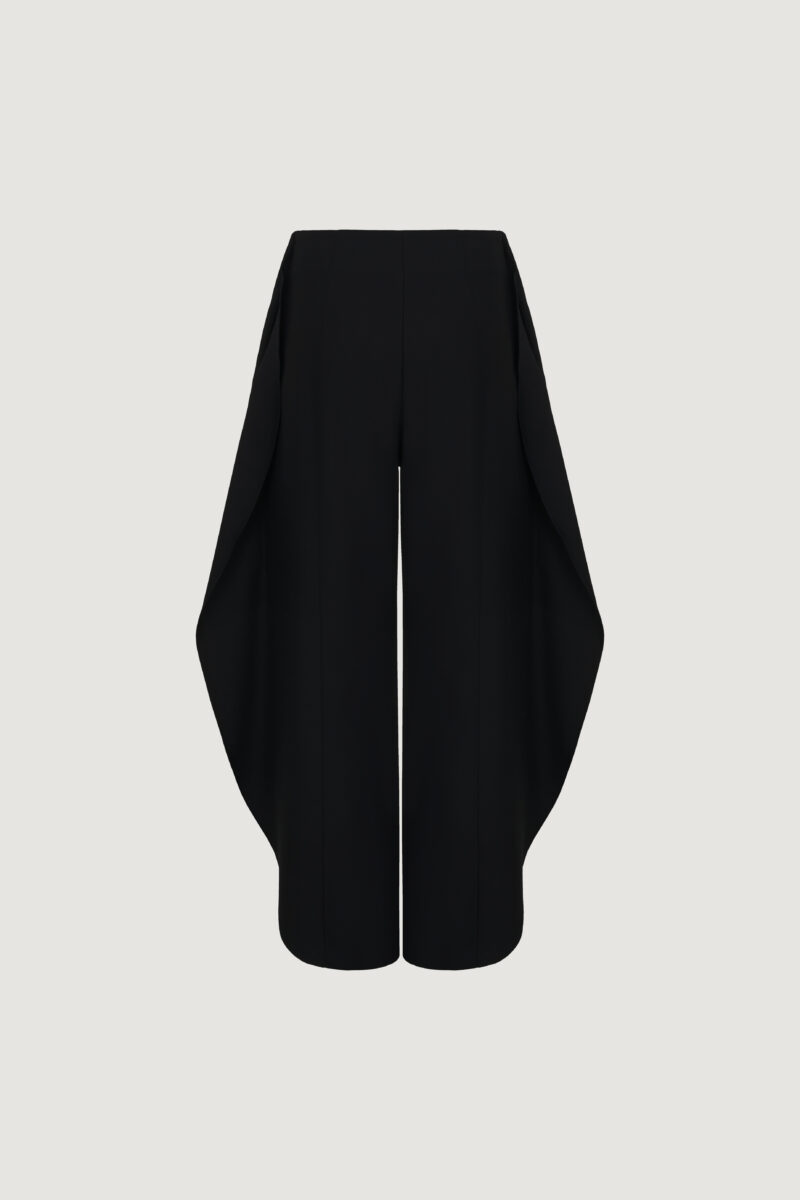 Брюки О-силуэта с выразительным объёмом и чёткой архитектурой. Свободная форма выстроена вокруг вертикали, создавая ощущение внутренней опоры и спокойной силы. Глубокий чёрный подчёркивает скульптурность кроя и работу с тенью. У модели воланы по бокам.