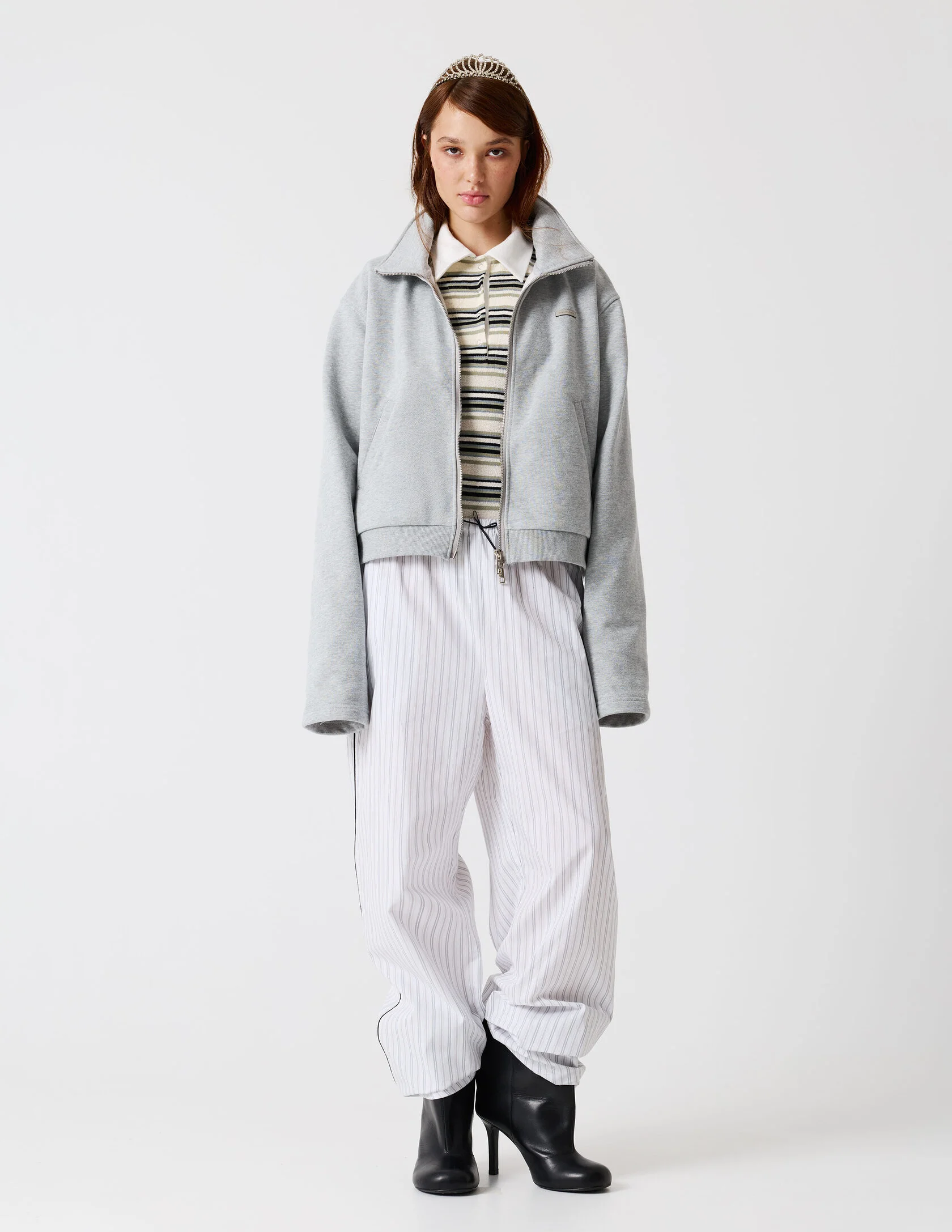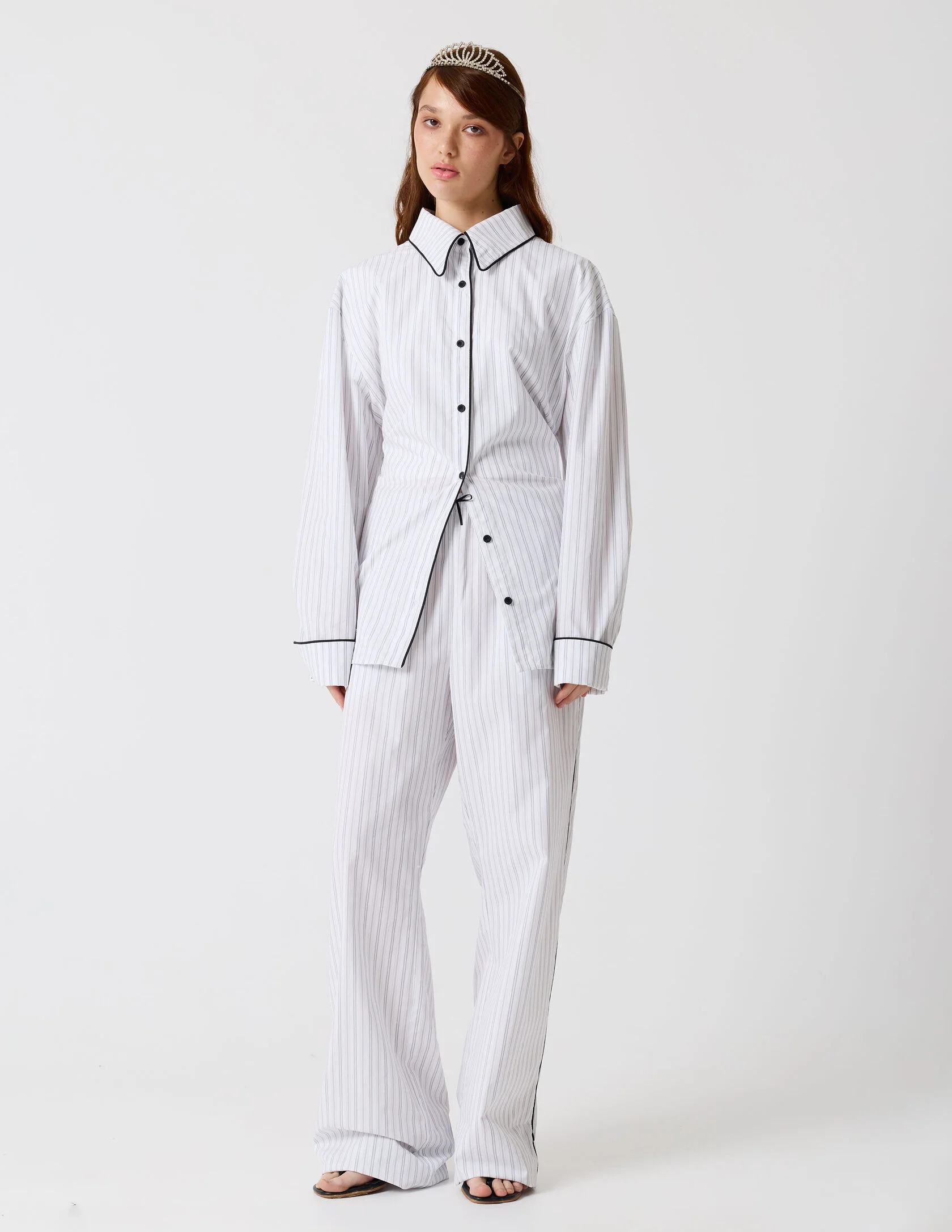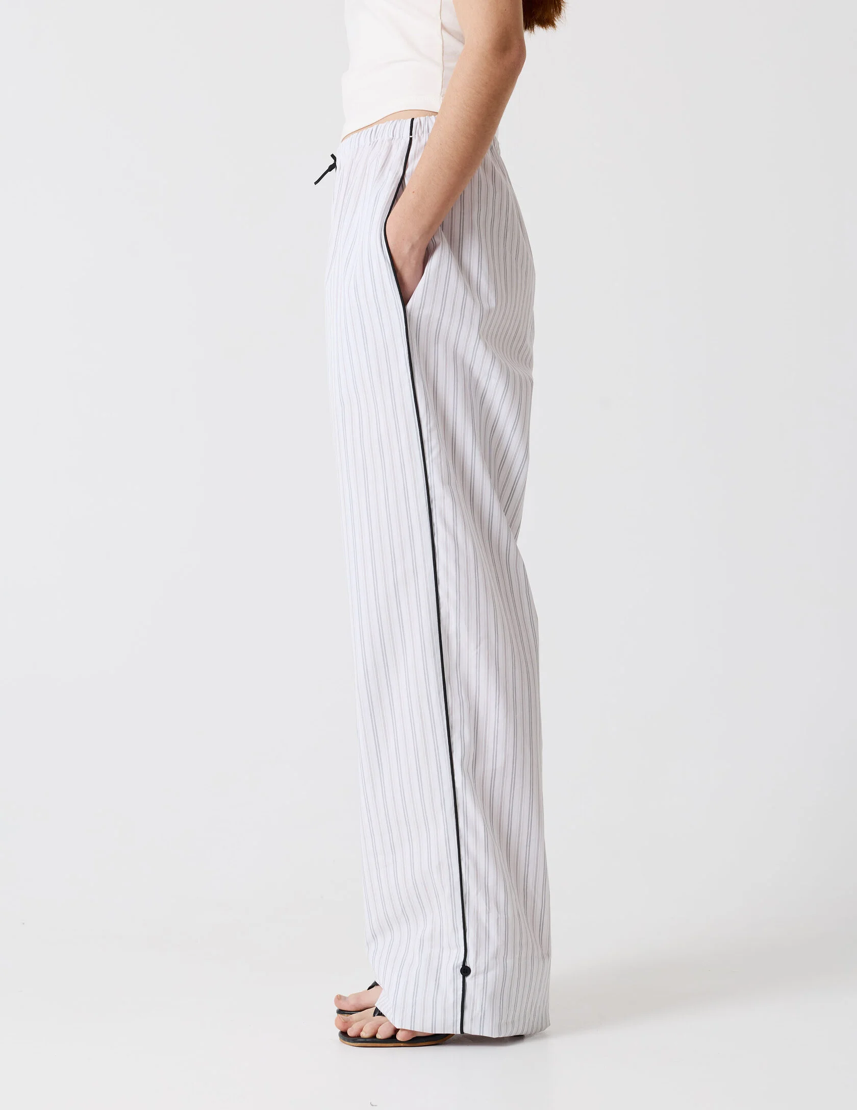 Брюки прямого кроя на мягкой резинке c контрастным кантом по боковому шву. По низу изделия есть скрытые петли для регулирования длины. Созданы для комплекта с рубашкой «Репетиция» или как самостоятельная расслабленная база.