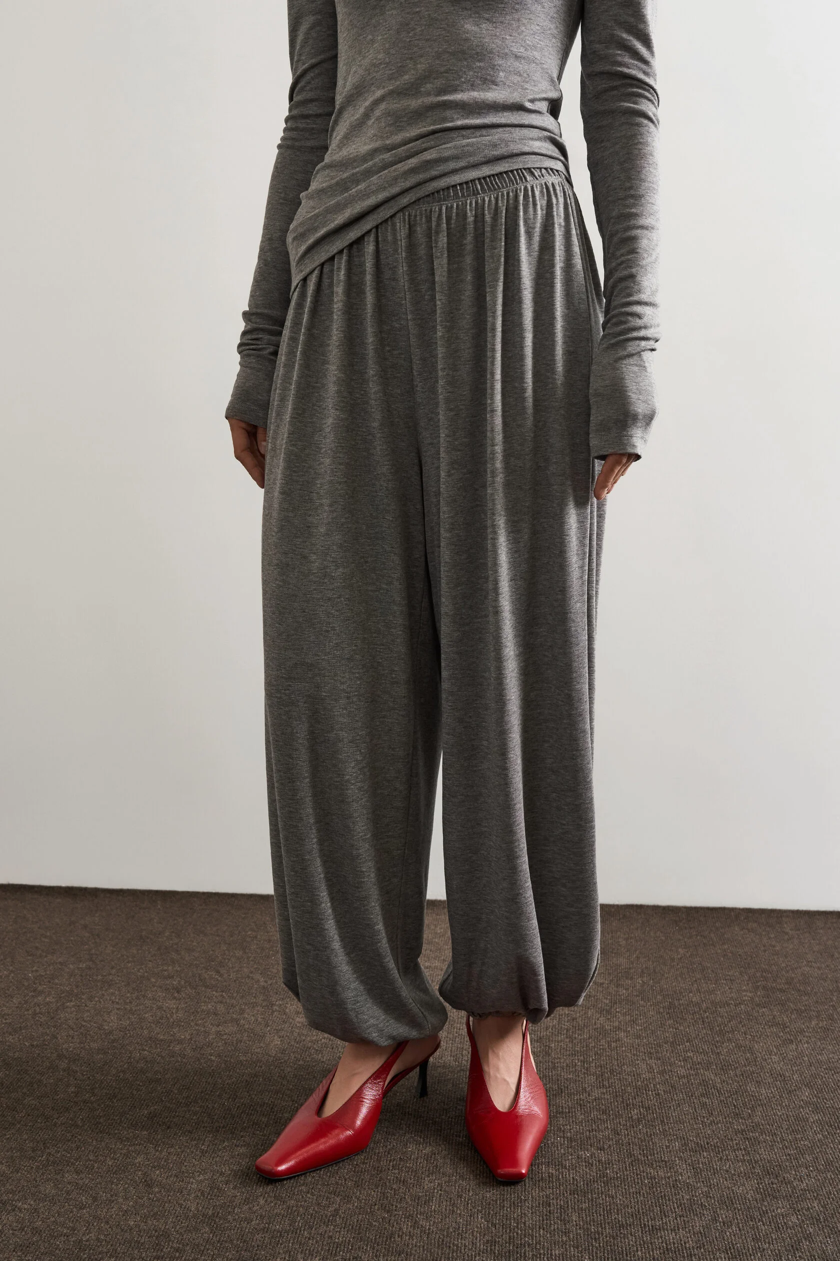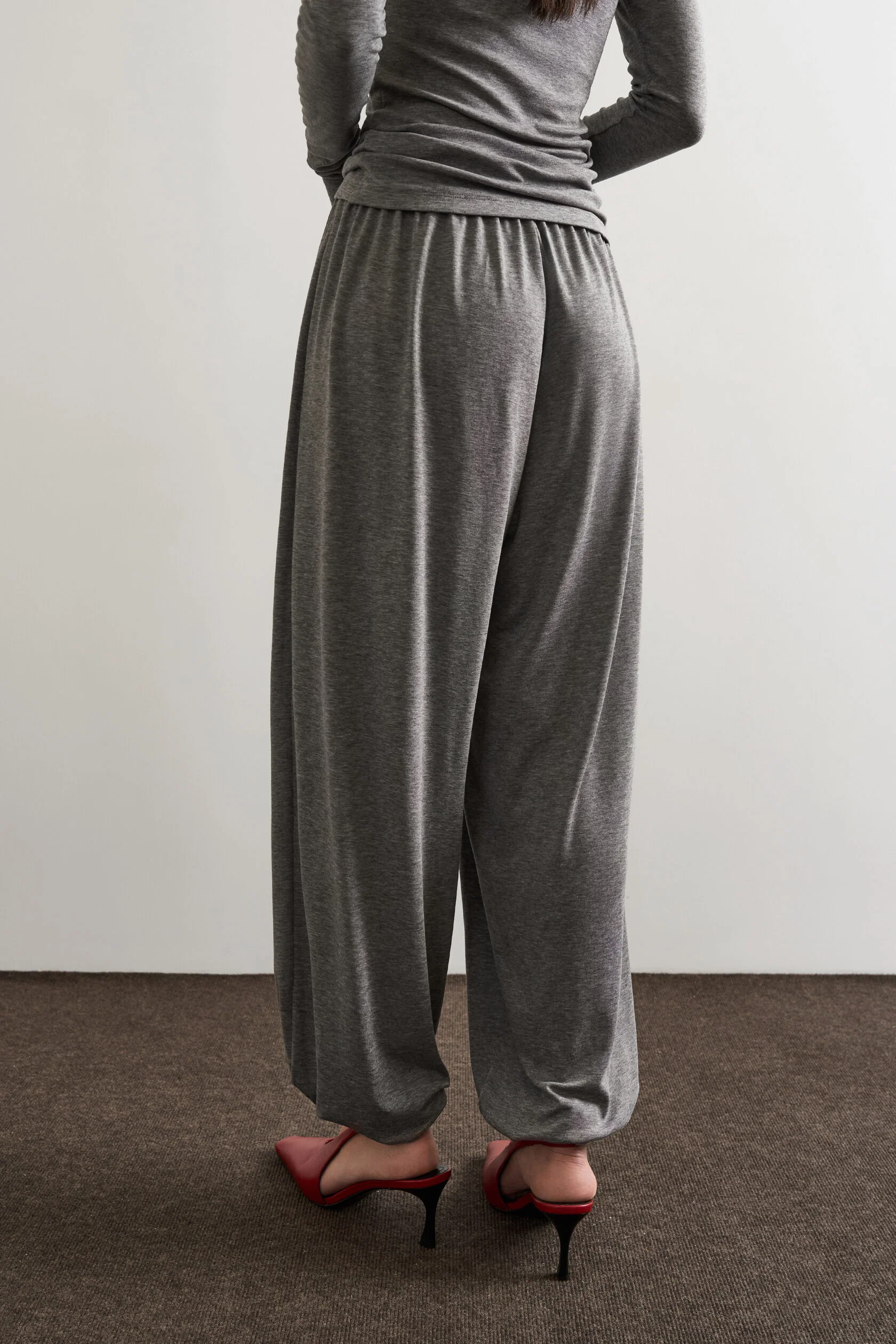 В коллекции Unison брюки получают новое прочтение — низу брючин обрамляют мягкие резинки. Такая деталь меняет привычный силуэт: теперь прямые широкие брюки сужаются к лодыжке. Пояс на резинке позволяет варьировать посадку. У изделия свободный крой, поэтому оно смотрится одинаково хорошо и на талии, и на бедрах.
