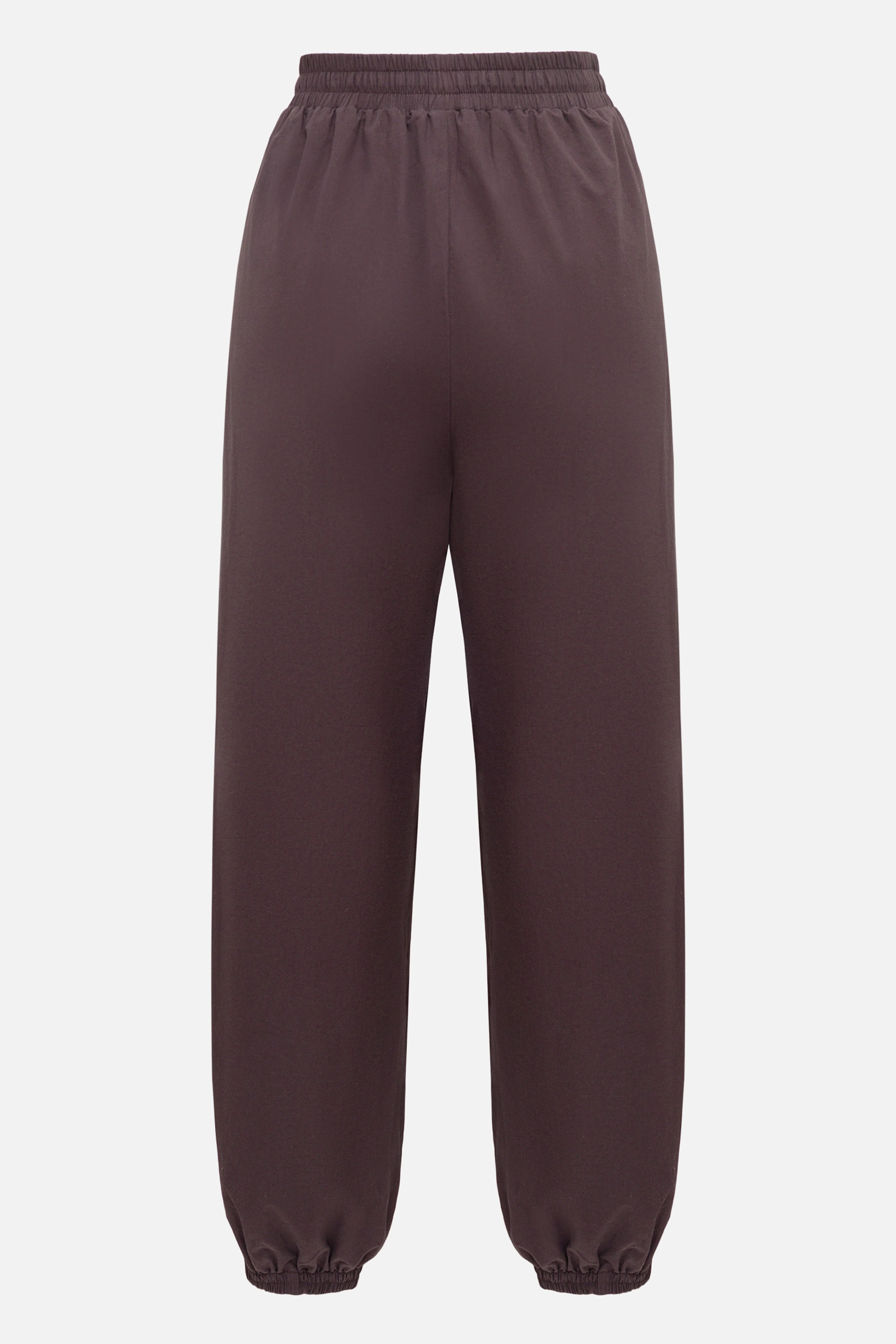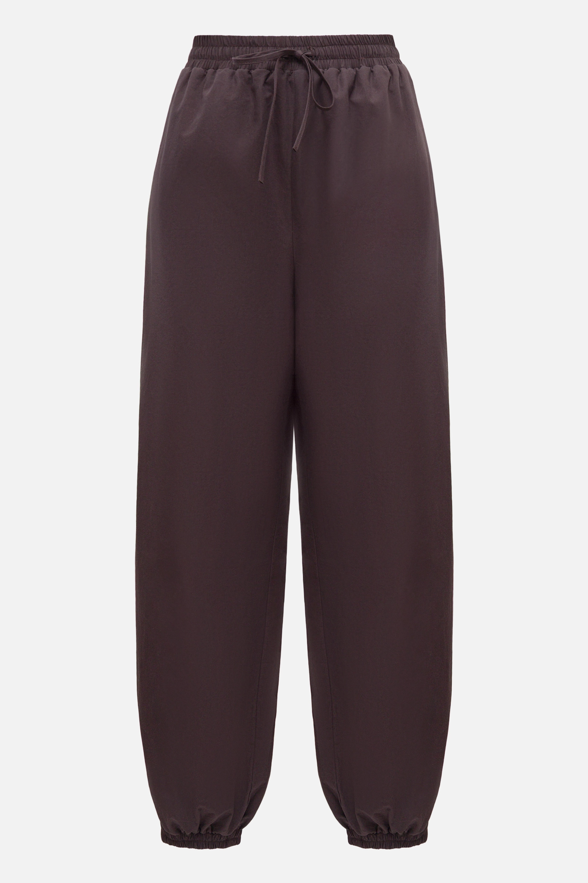 Спортивные хлопковые брюки выполнены из приятного на ощупь, слегка шуршащего материала. Модель прямого кроя комфортно сидит по фигуре благодаря резинкам на талии и в манжетах брюк, а завязка на поясе позволяет регулировать посадку. Тонкая хлопковая подкладка добавляет комфорта, а боковые карманы — практичности. Отлично смотрится в паре с курткой из такого же материала.
