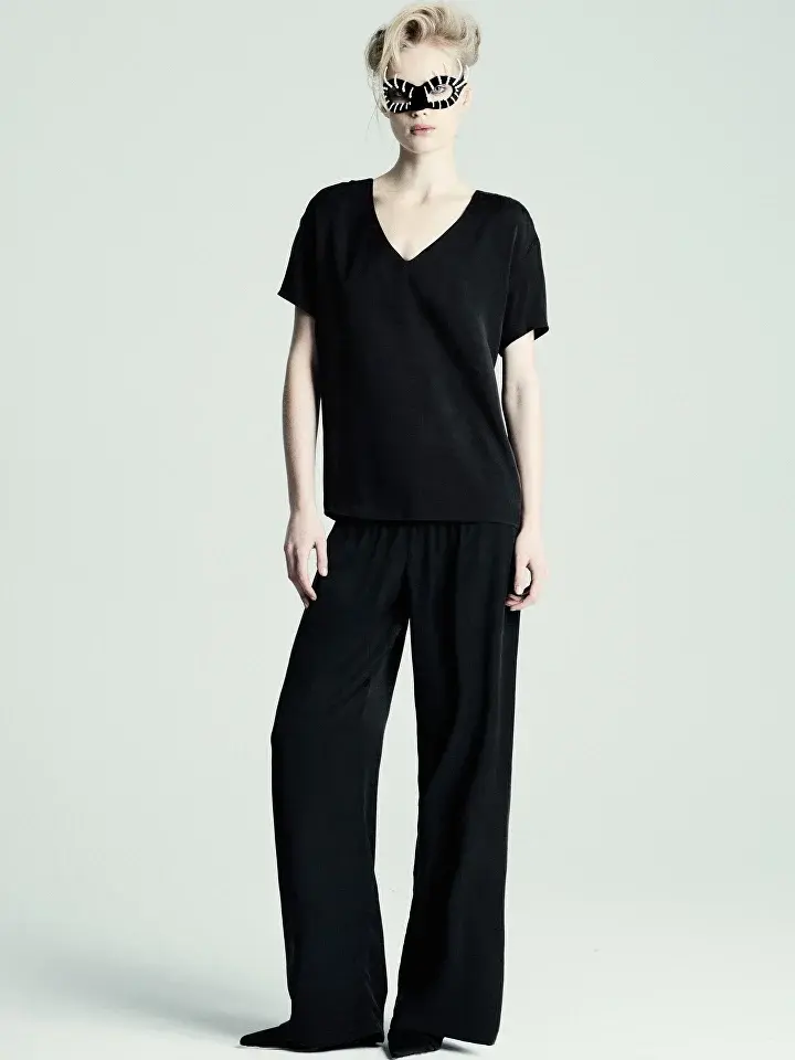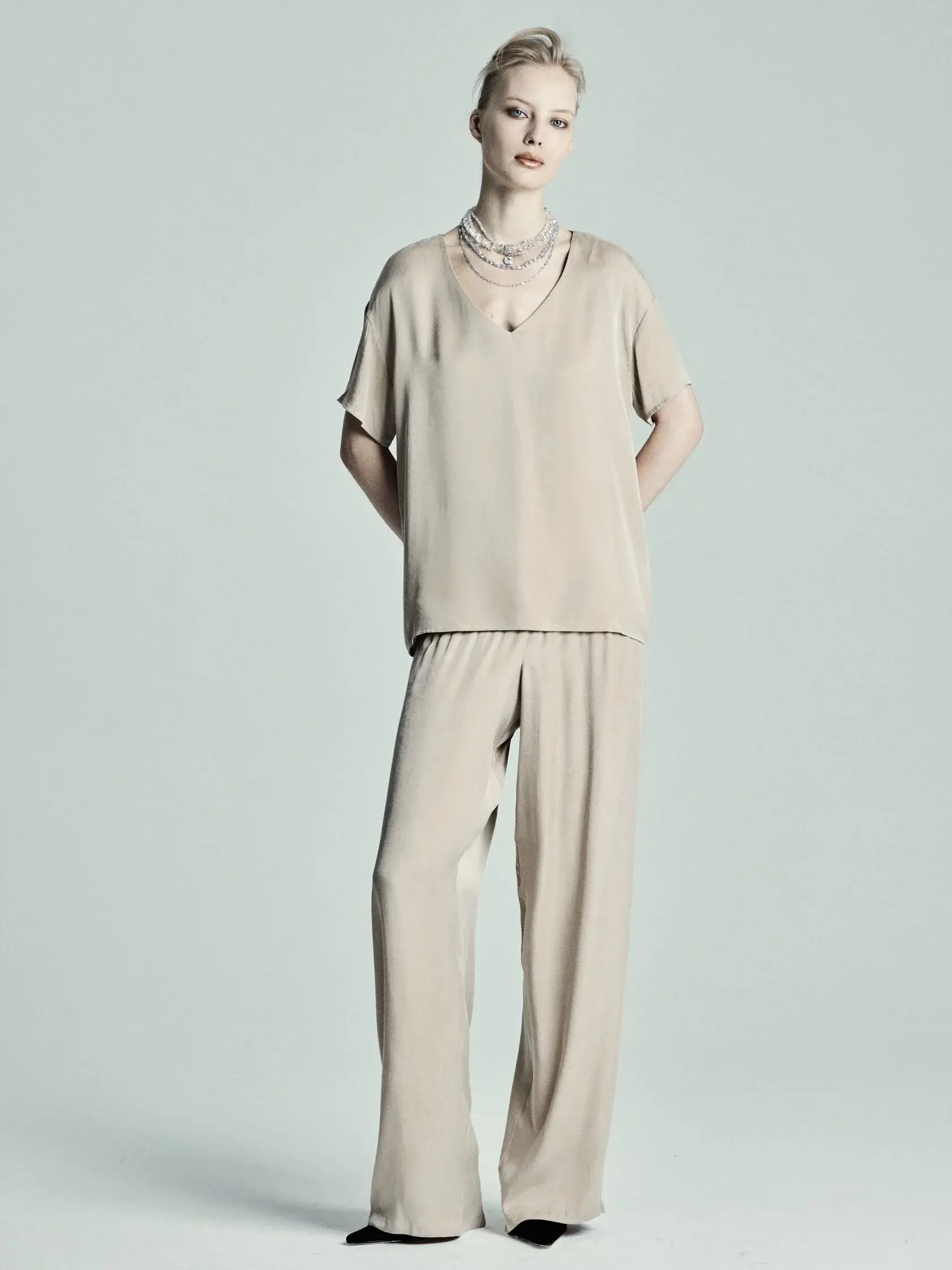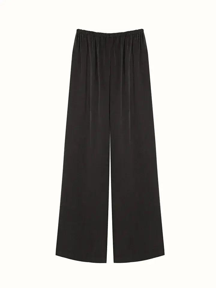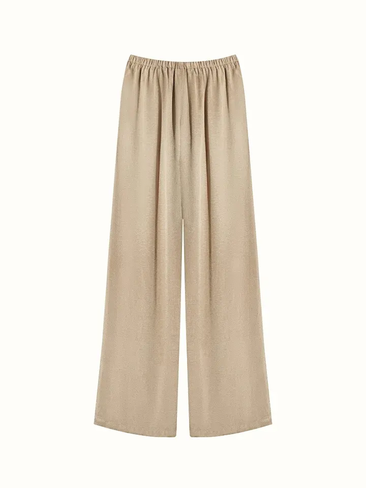 Базовые брюки свободного силуэта из тактильно приятной купры. Модель прямого кроя, на резинке. Брюки отлично сочетаются с футболкой из этой же капсулы. Представлены в двух цветах: темный графит и золотисто-бежевый
