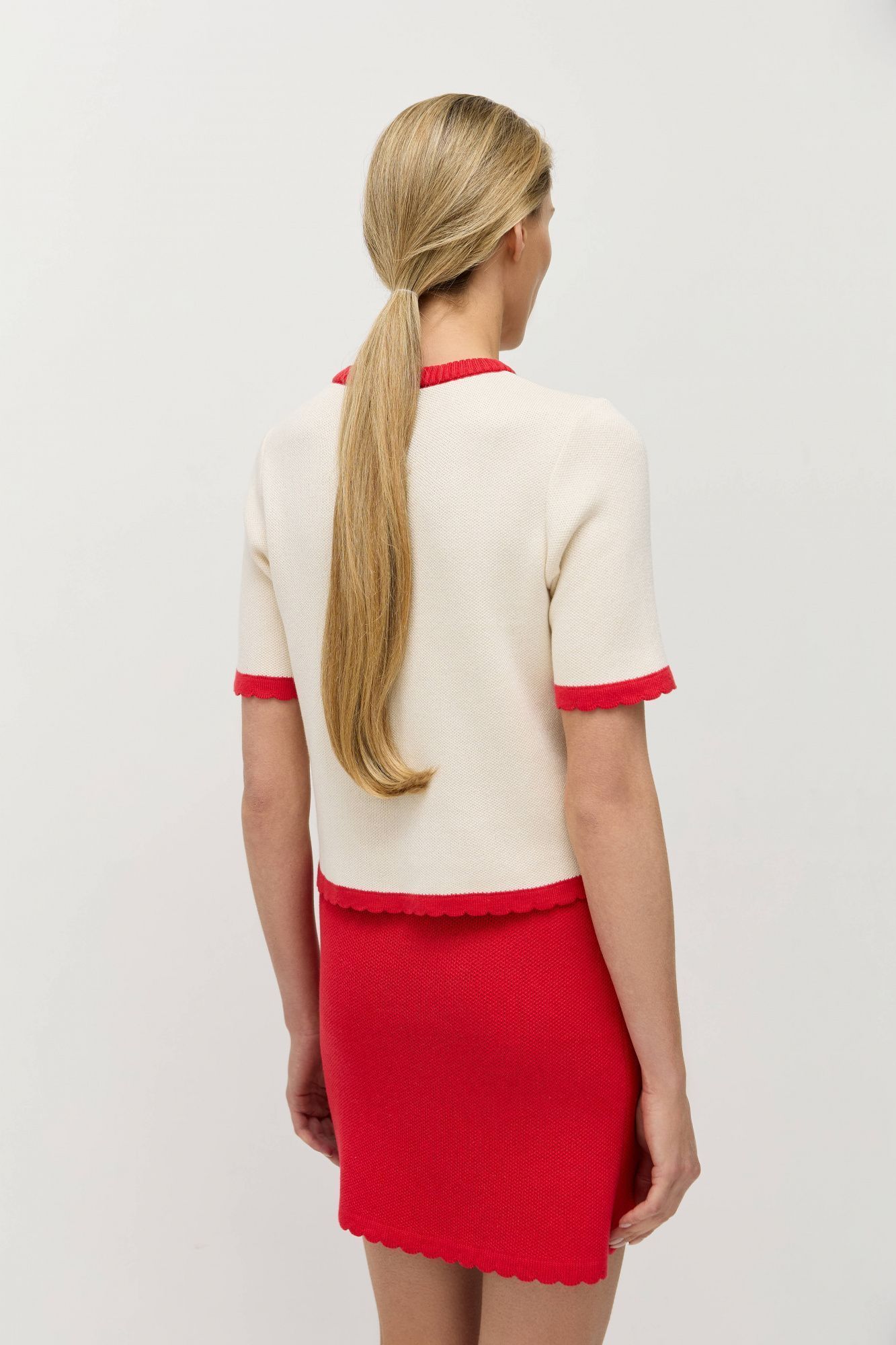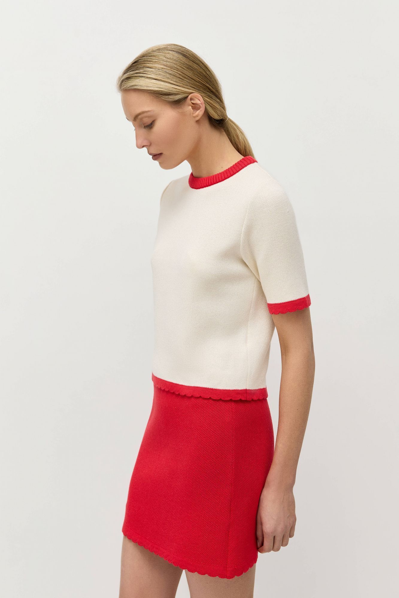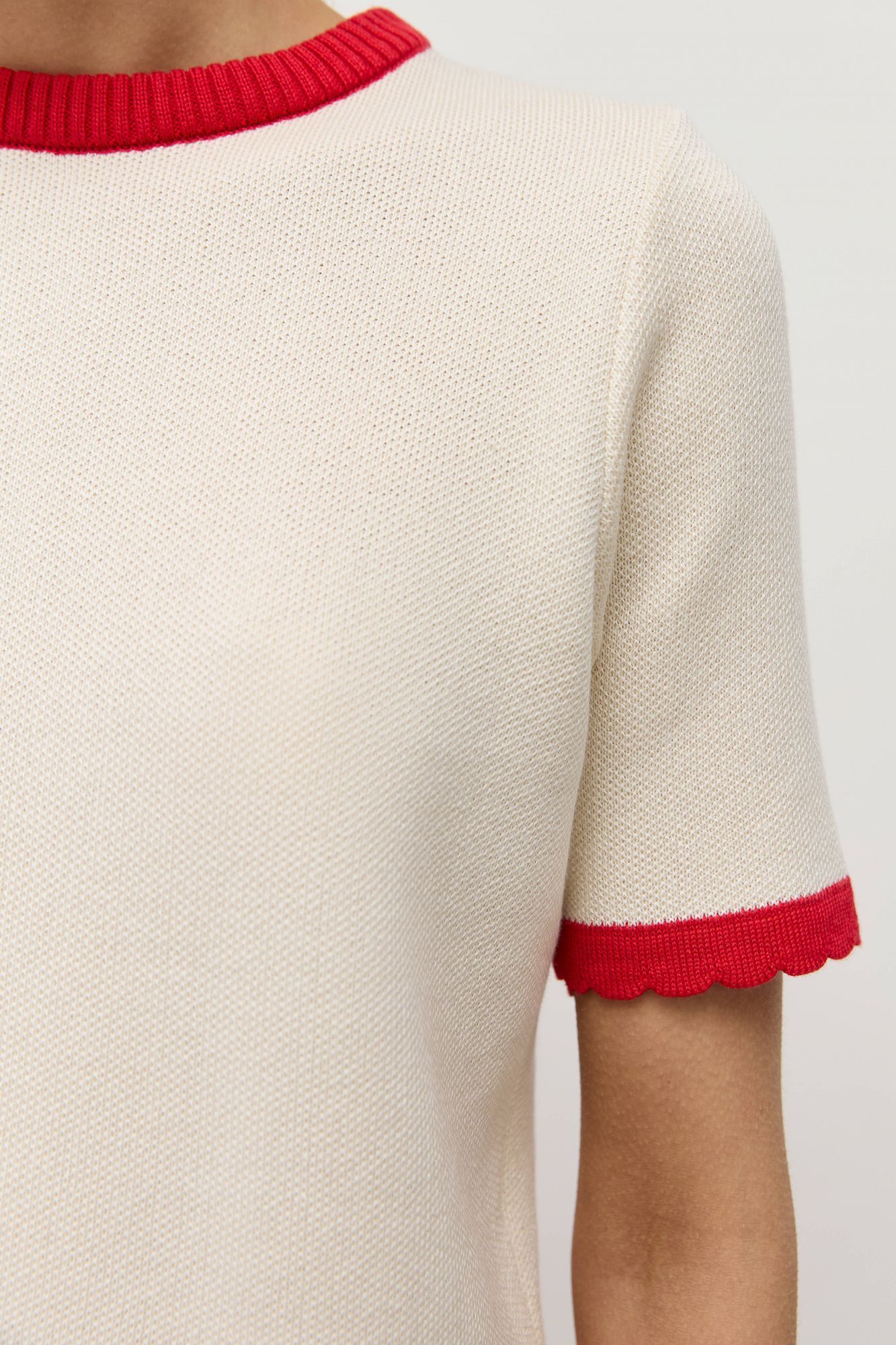 Джемпер-футболка прямого кроя связан из натурального хлопка с легкой примесью акрила для стабильности и долговечности.