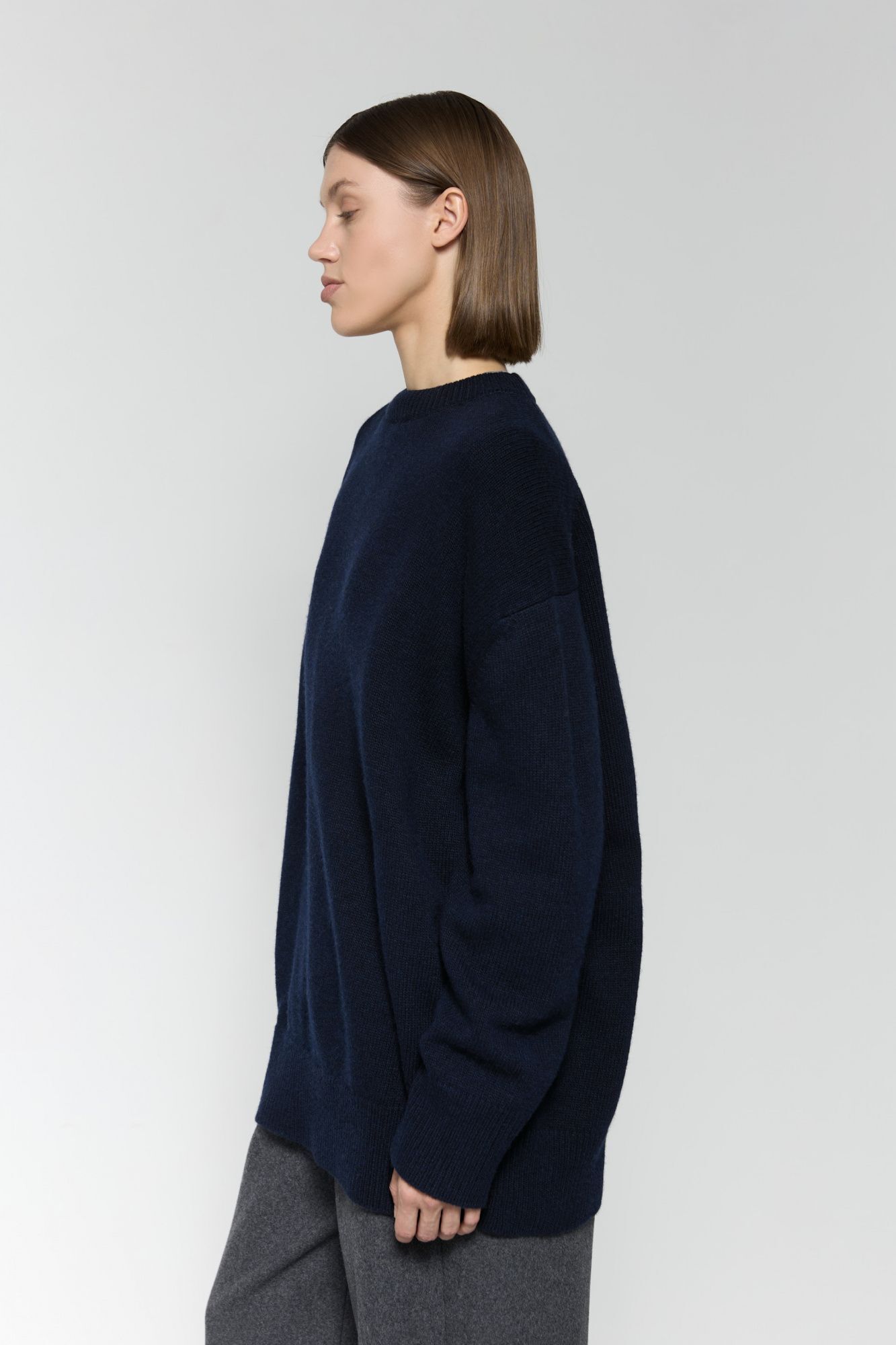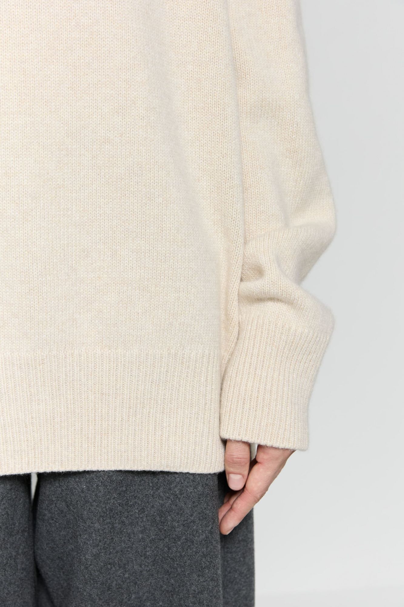 У джемпера объемный, слегка зауженный крой; широкие резинки по низу изделия и рукавов, вязка средней плотности.