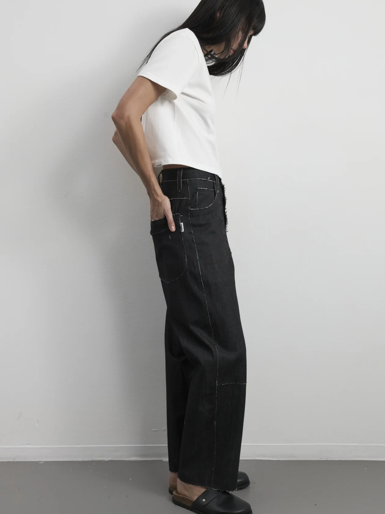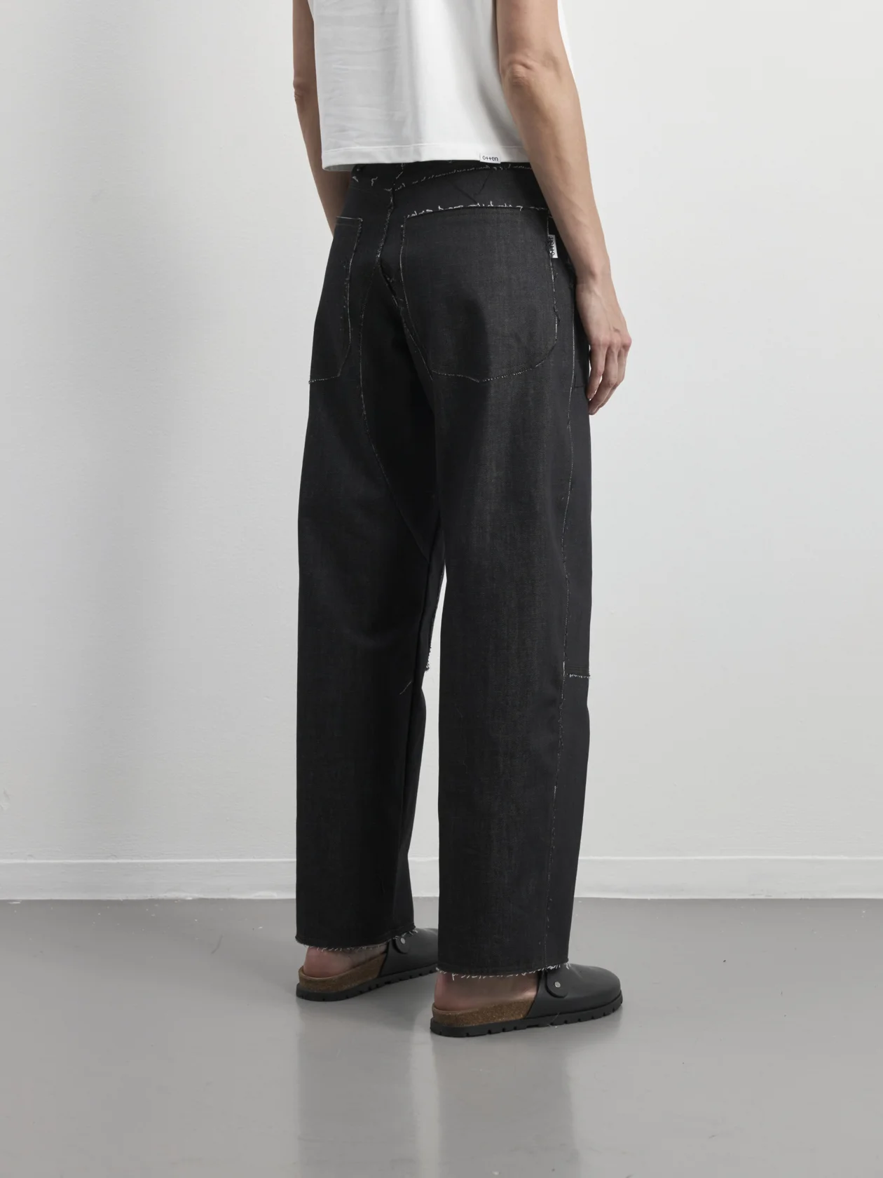 Джинсы свободного кроя с необработанными швами и краями. Фигурные карманы и декоративная шлевка на спинке. Застежка на джинсовые пуговицы-болты. Плотная посадка на талии.