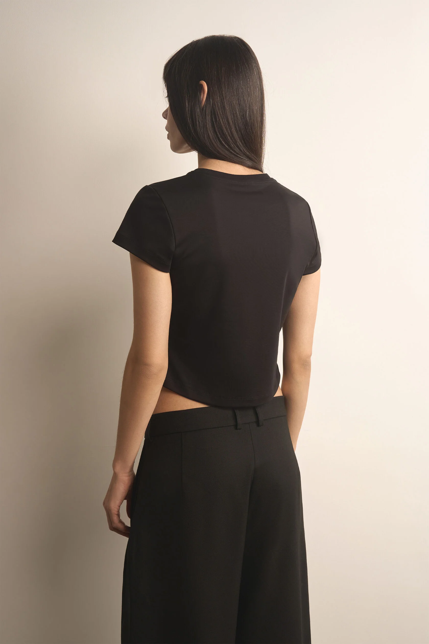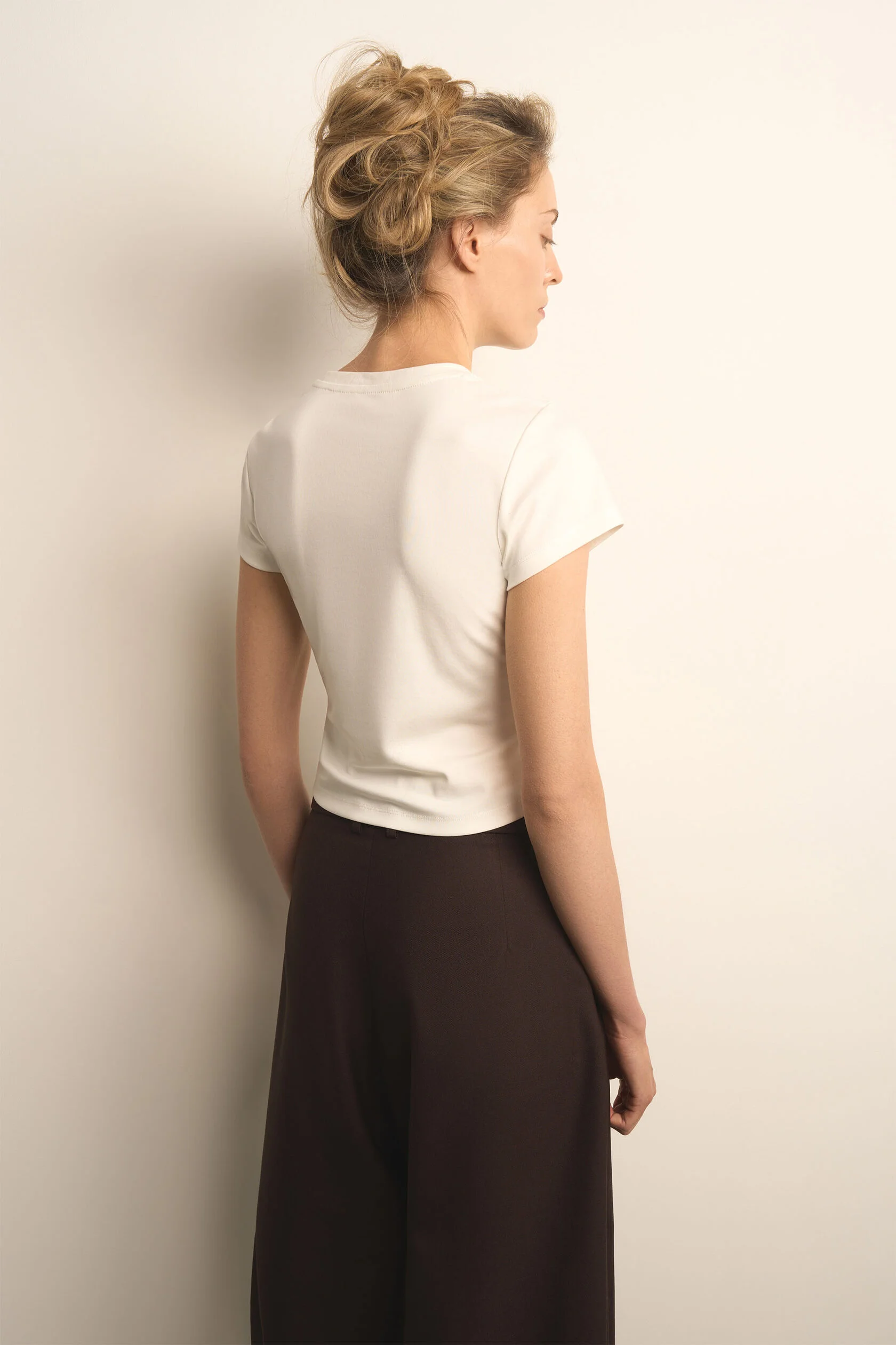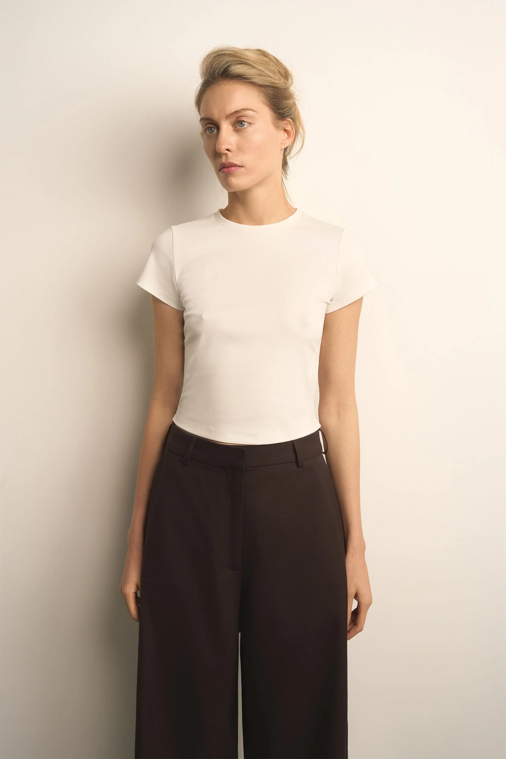 Та самая правильная футболка. В меру облегающая, с пропорциональными рукавами и длиной, с которой будет сочетаться любой низ средней и заниженной посадки. Для этой футболки мы специально выбрали хлопковую ткань с модалом — гладкую и нежную.