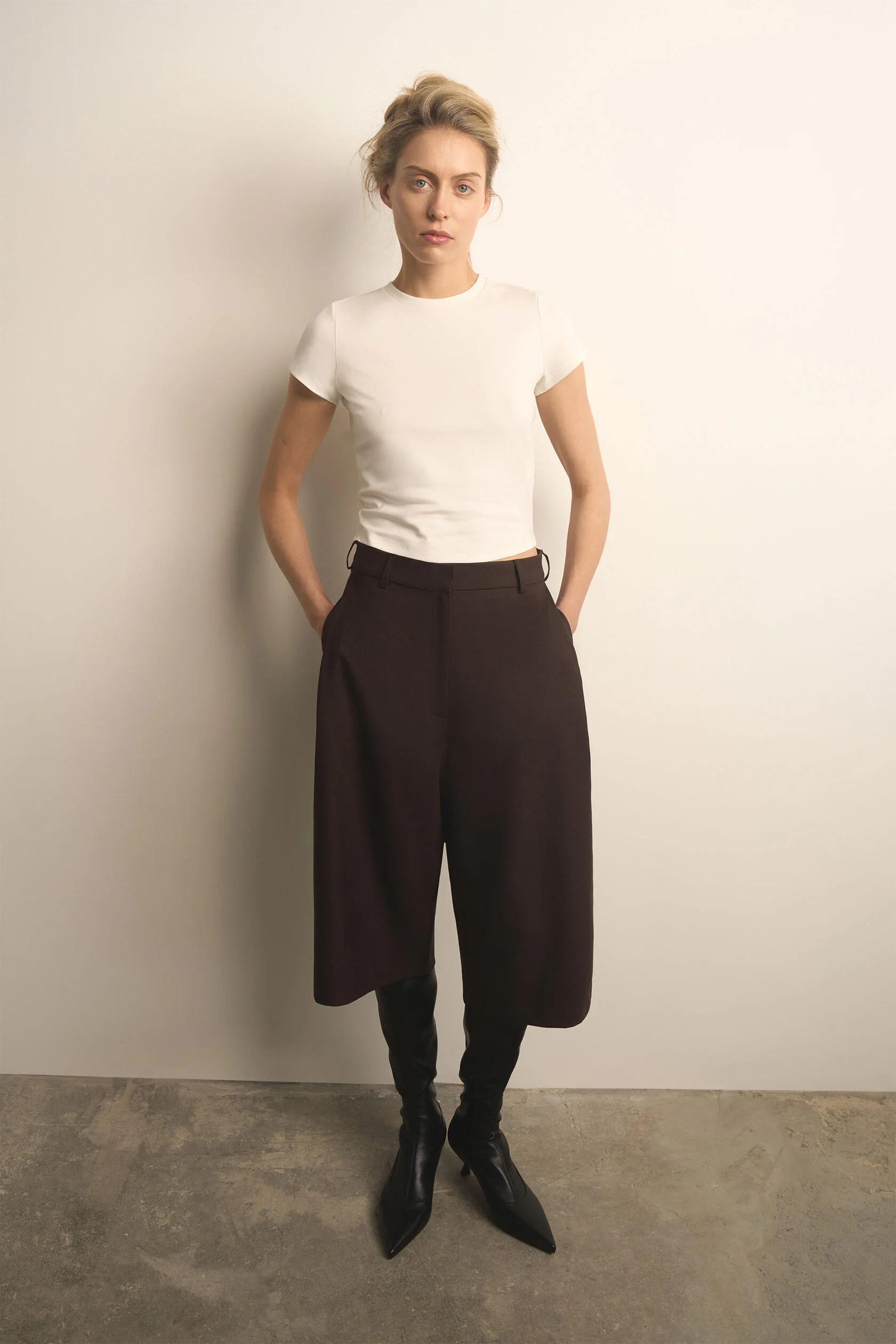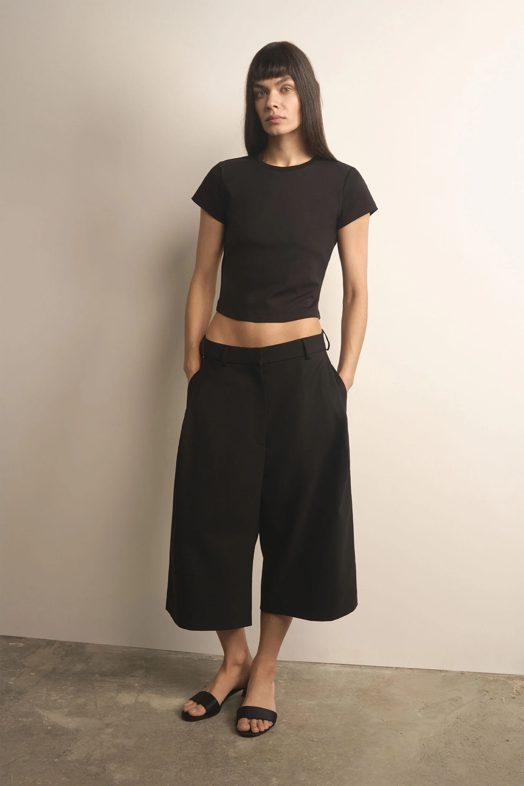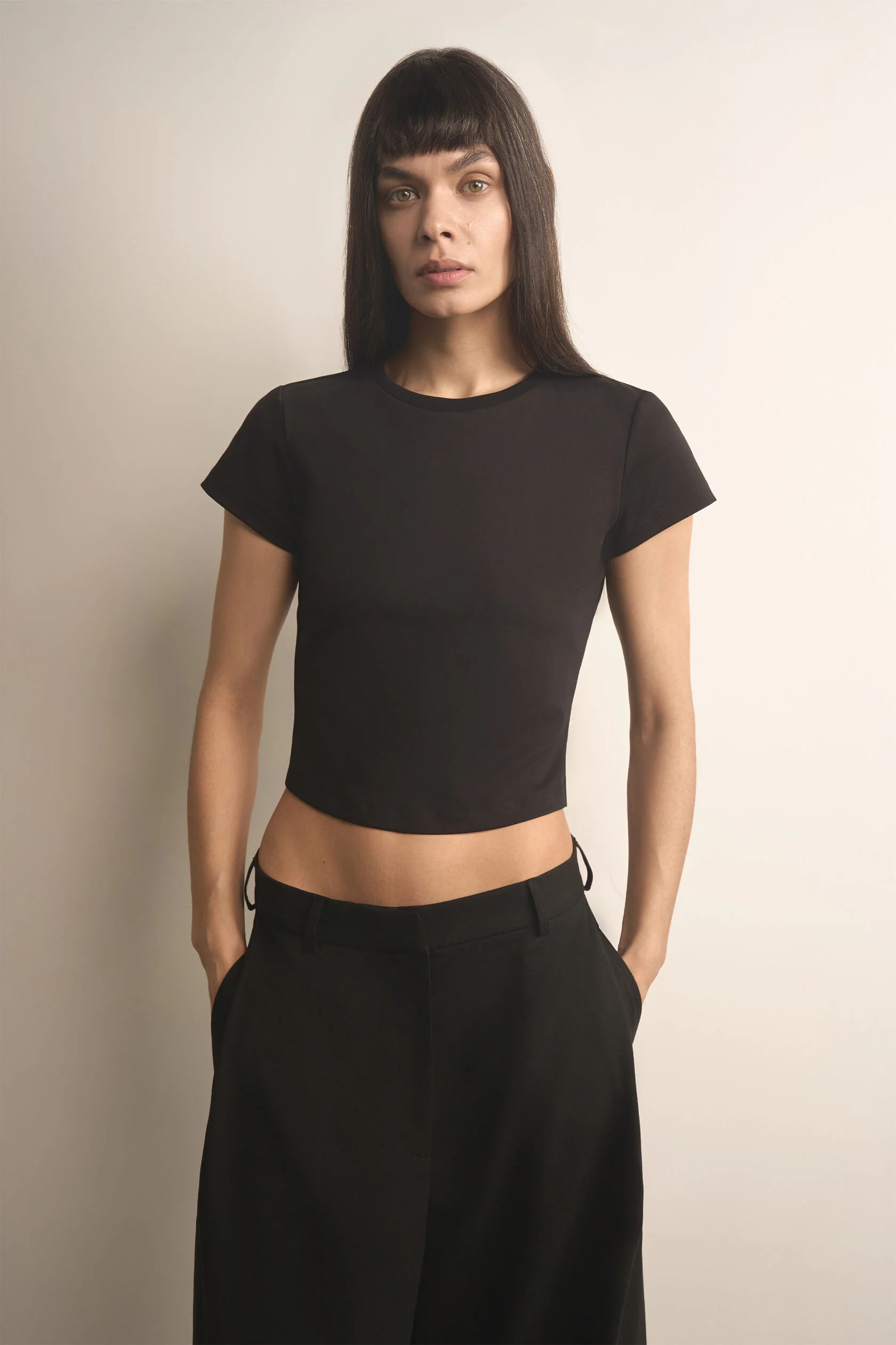 Та самая правильная футболка. В меру облегающая, с пропорциональными рукавами и длиной, с которой будет сочетаться любой низ средней и заниженной посадки. Для этой футболки мы специально выбрали хлопковую ткань с модалом — гладкую и нежную.