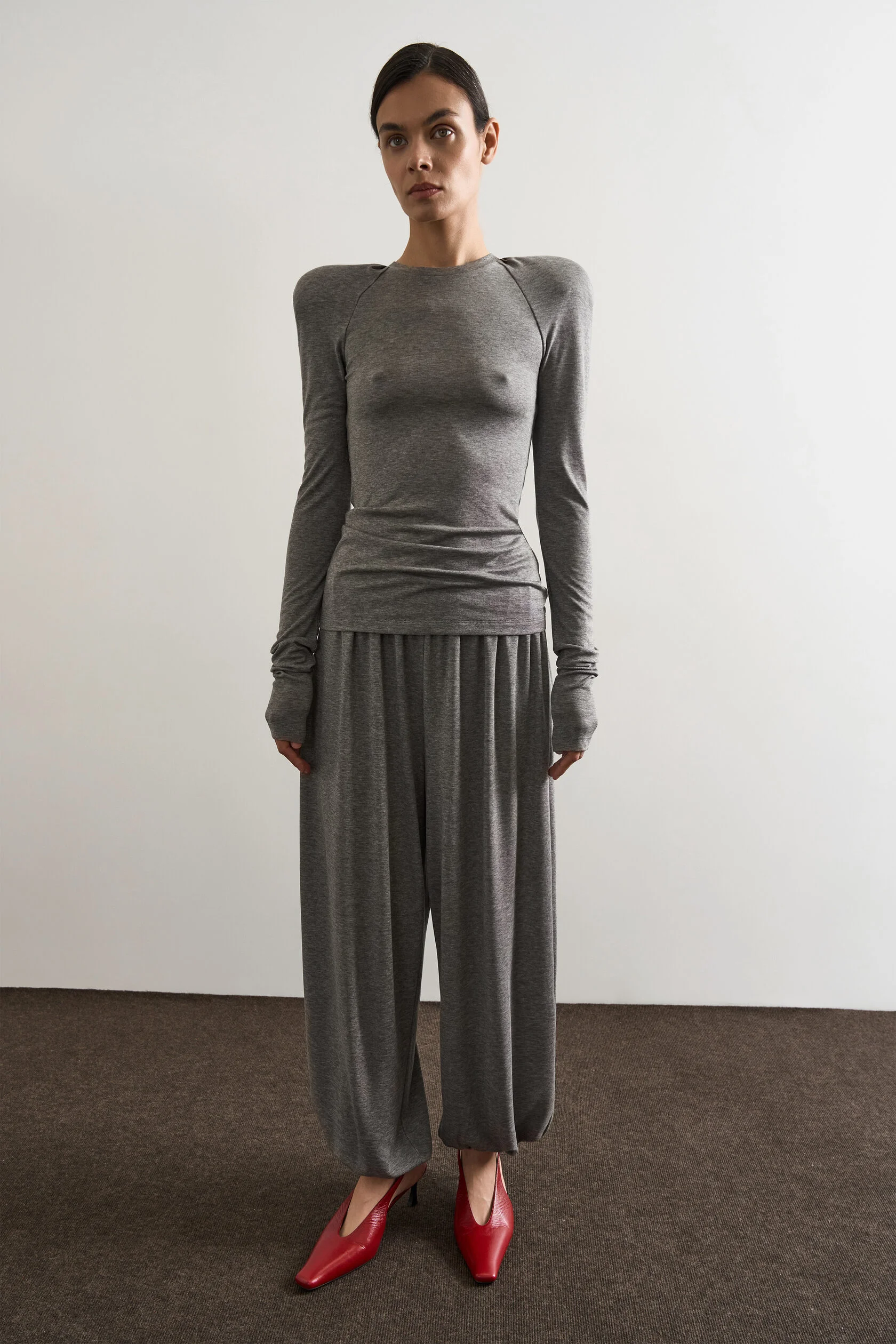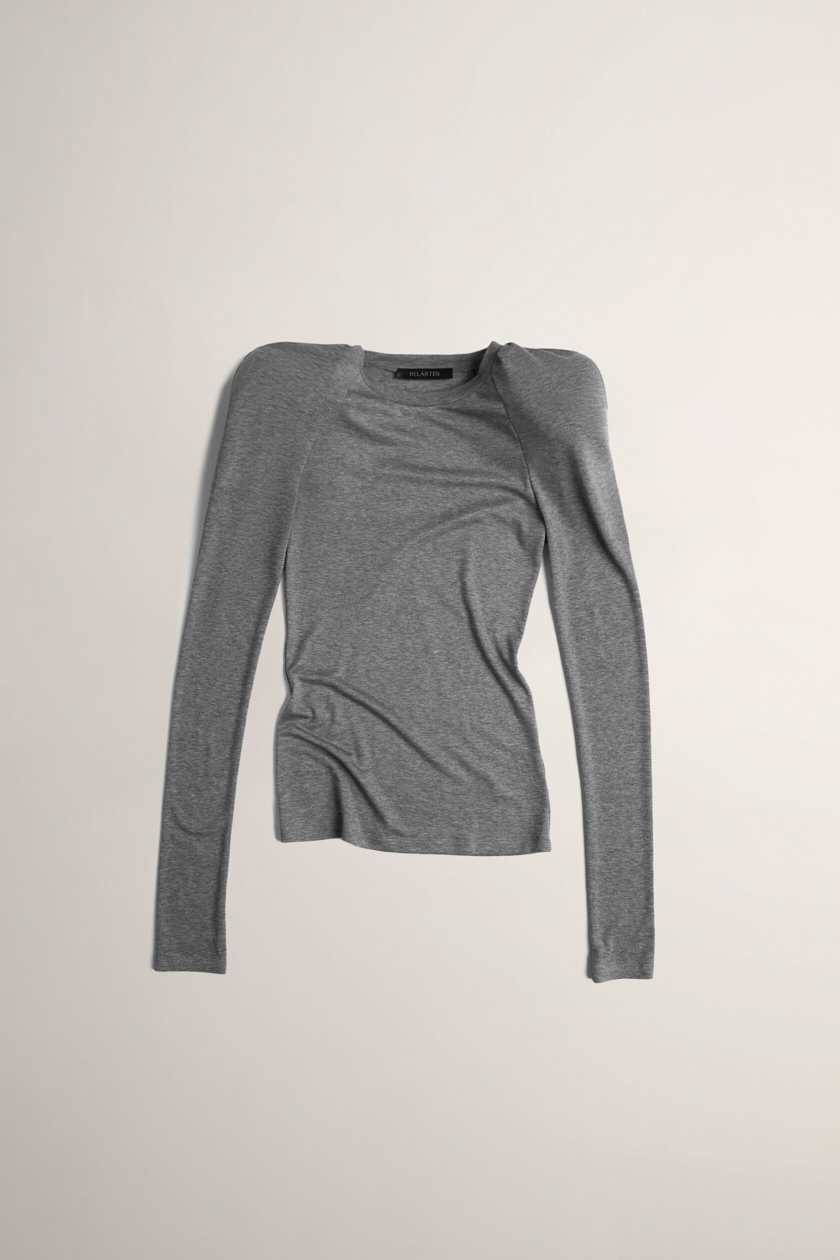 Этот лонгслив отражает суть коллекции Unison: его силуэт может меняться синхронно вам. Под прилегающим фасоном прячутся два подплечника — они создают выразительный, гипертрофированный контур тела. При желании их можно снять — подплечники крепятся на маленькие кнопки. Без них лонгслив обретает противоположный тон: силуэт становится более сглаженным, мягким, естественным.