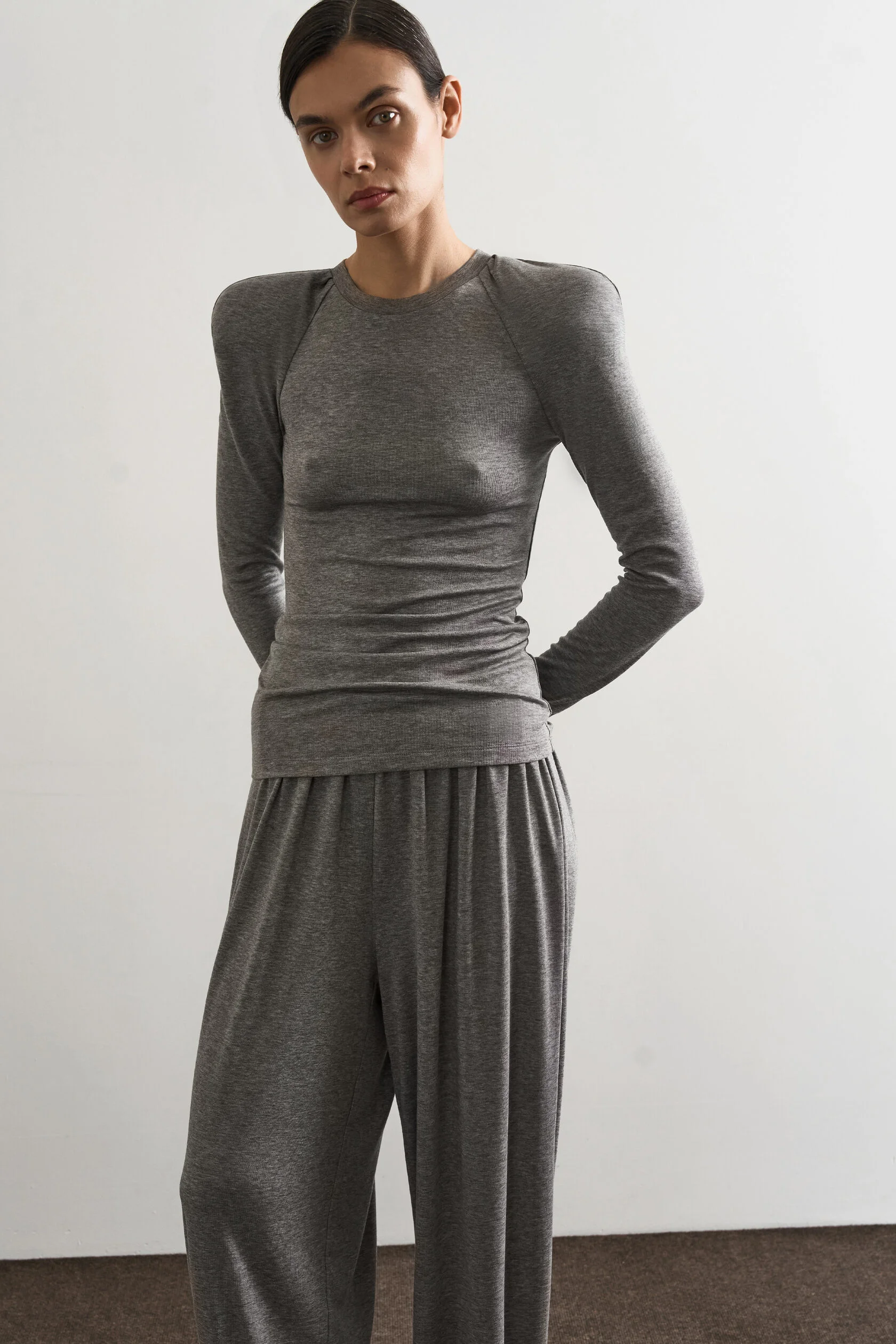Лонгслив выполнен из тонкого трикотажа. В его основе шерсть и тенсель — поэтому ткань шелковистая, струящаяся и практически невесомая. Дополните лонгслив брюками из серии Layer, чтобы собрать идеальный образ на каждый день.