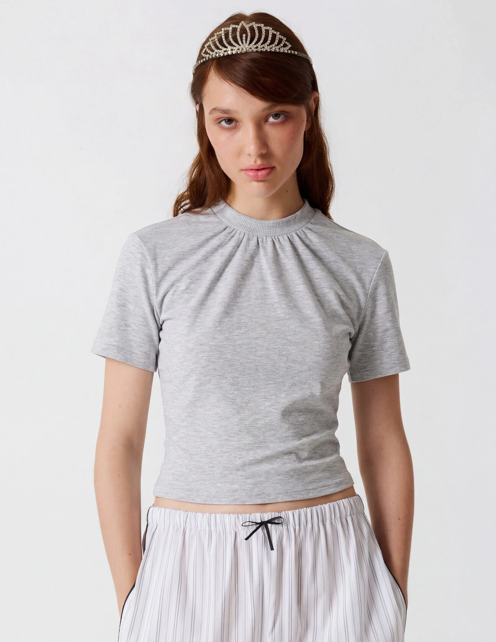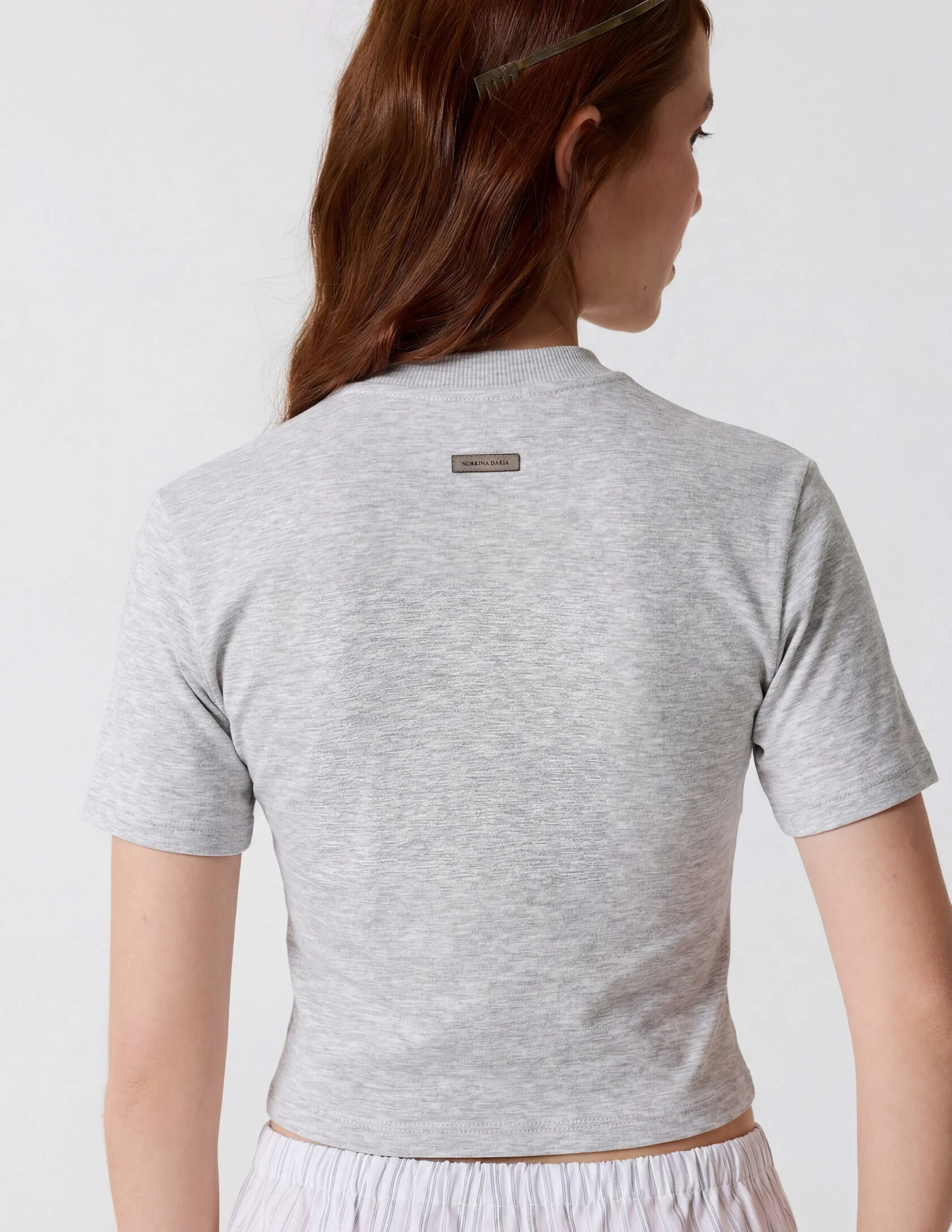 Укороченный силуэт по фигуре и короткий рукав подчёркивают хрупкость образа.