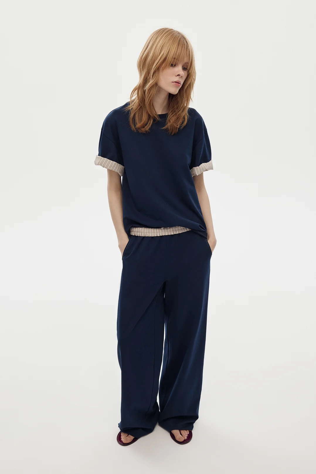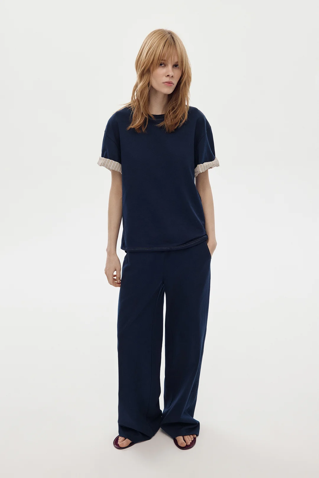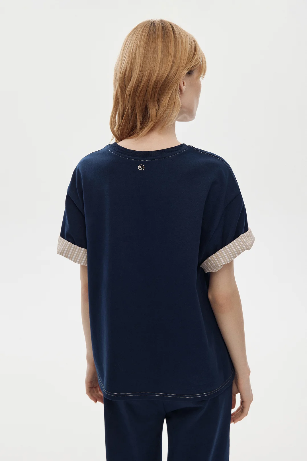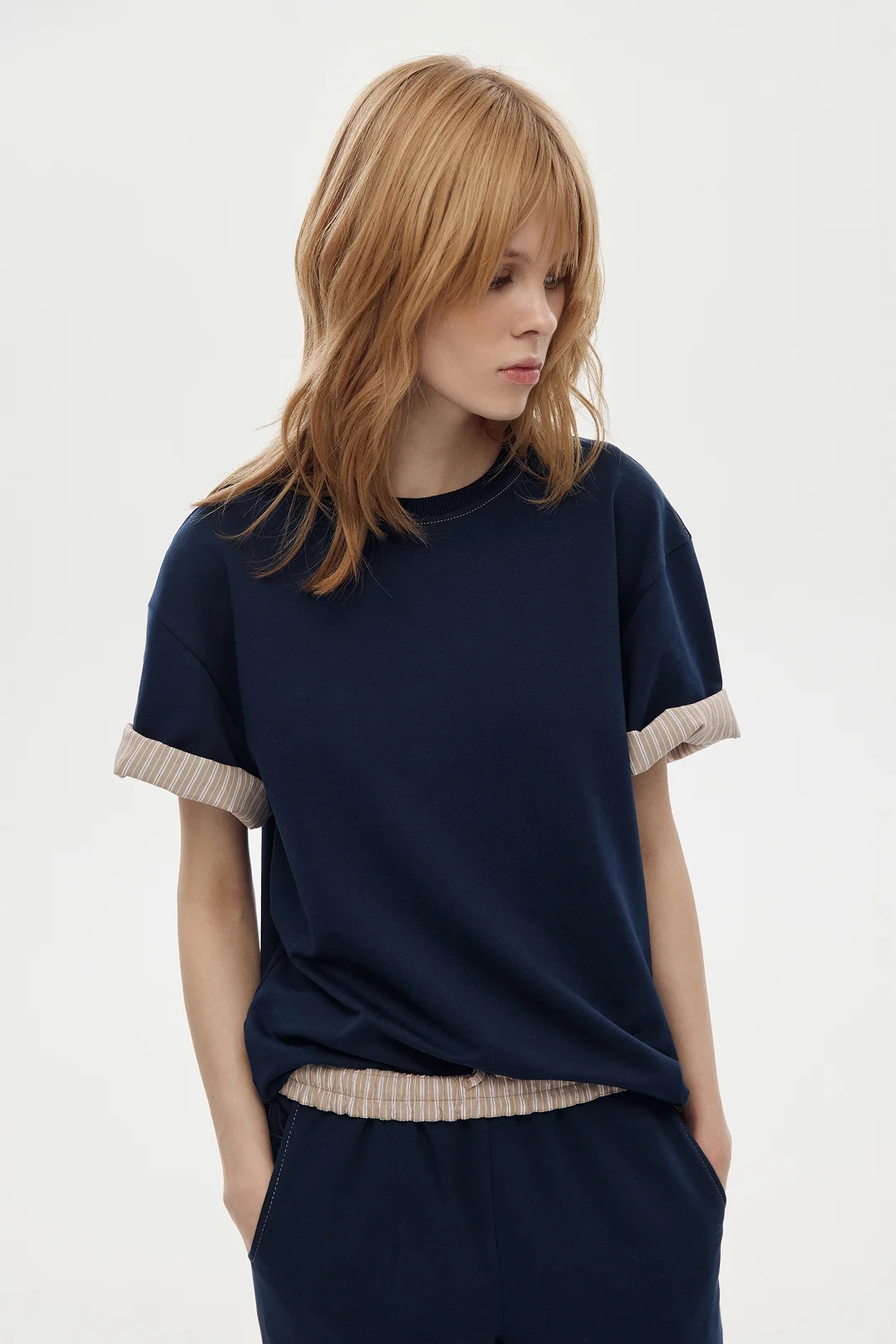 Особенность — скрытая внутренняя отделка рукавов из хлопковой ткани в полоску. Рукава можно носить в классическом варианте, сохраняя однотонный образ, или подвернуть — и добавить лёгкий контрастный акцент.