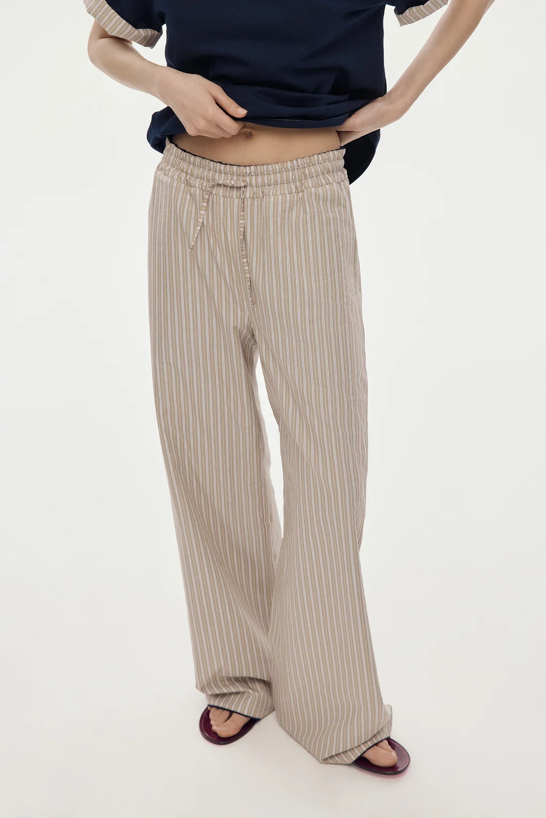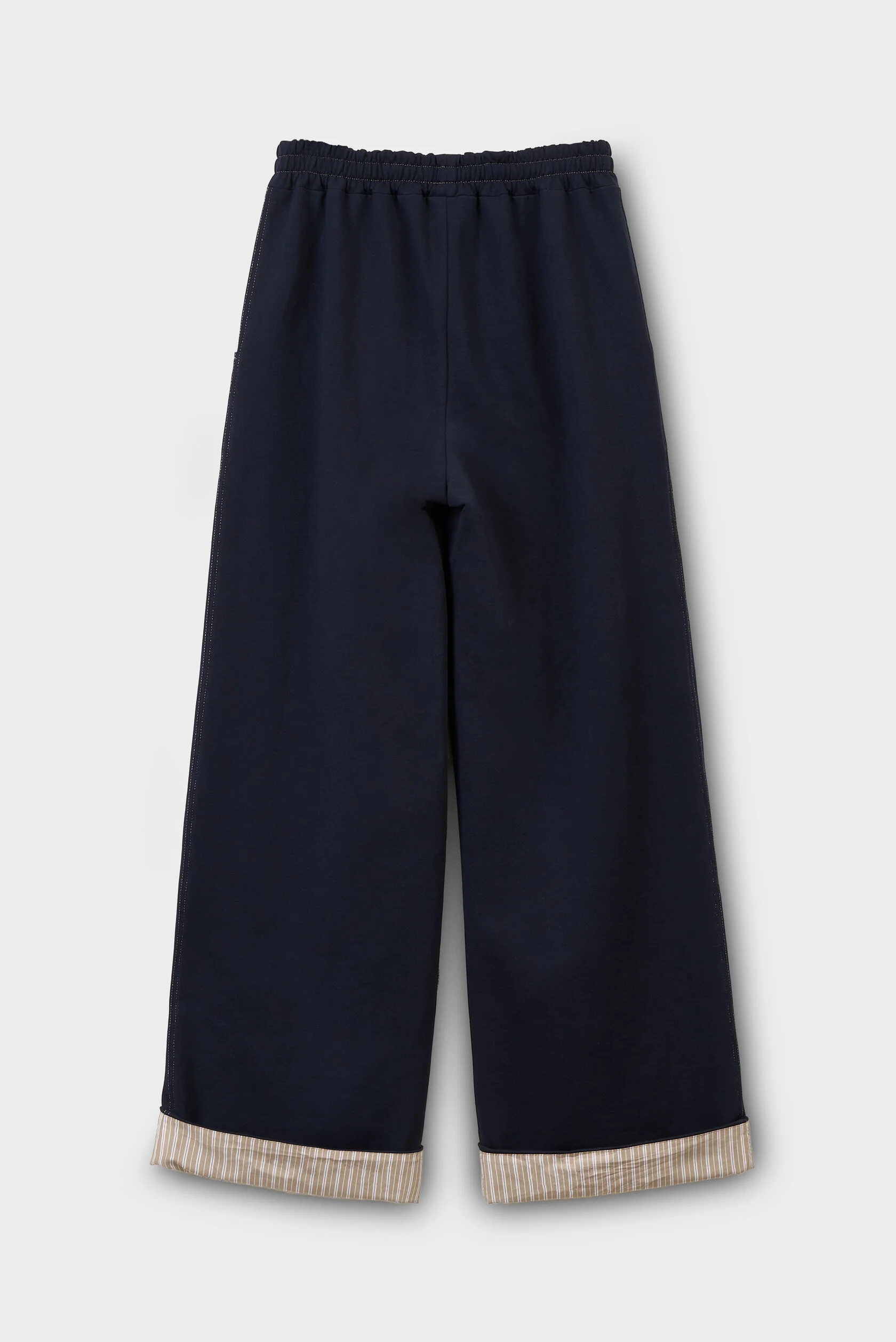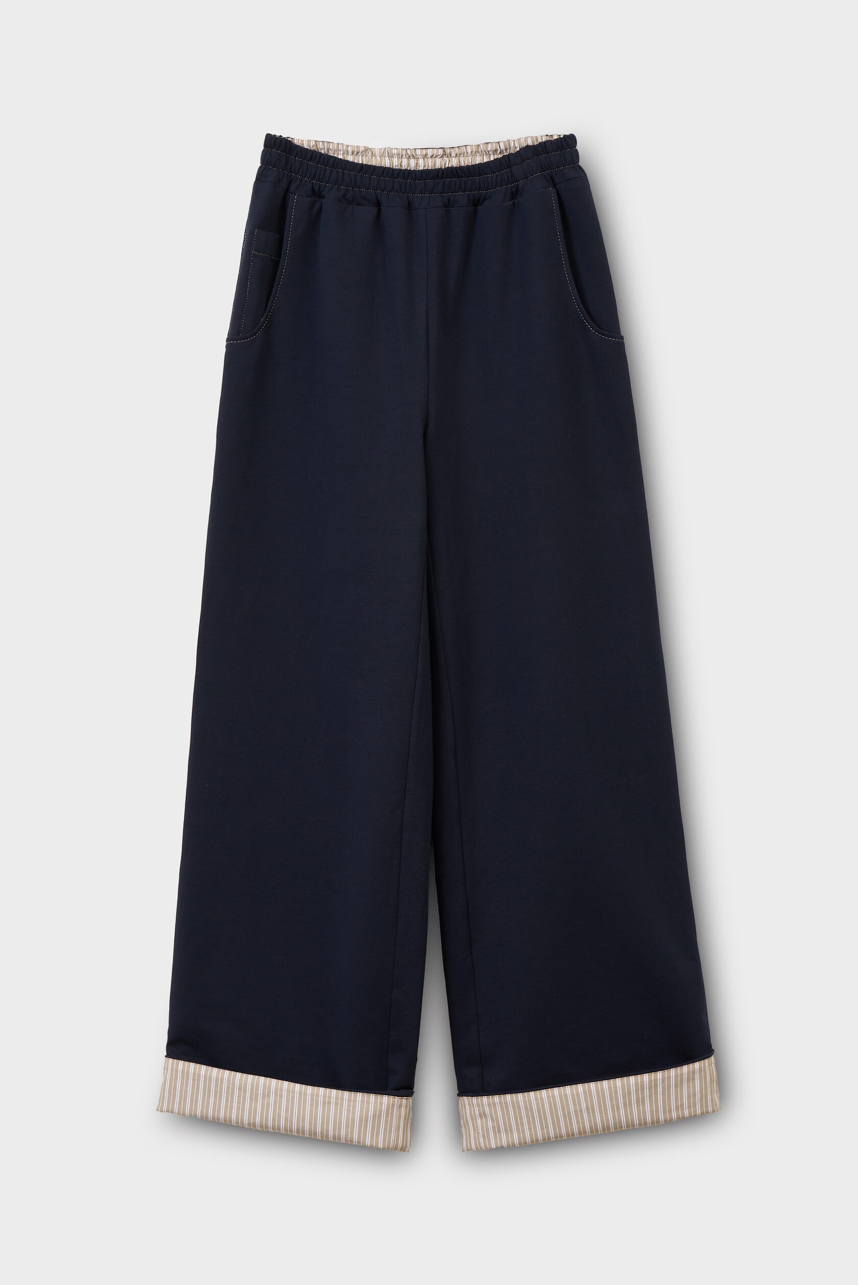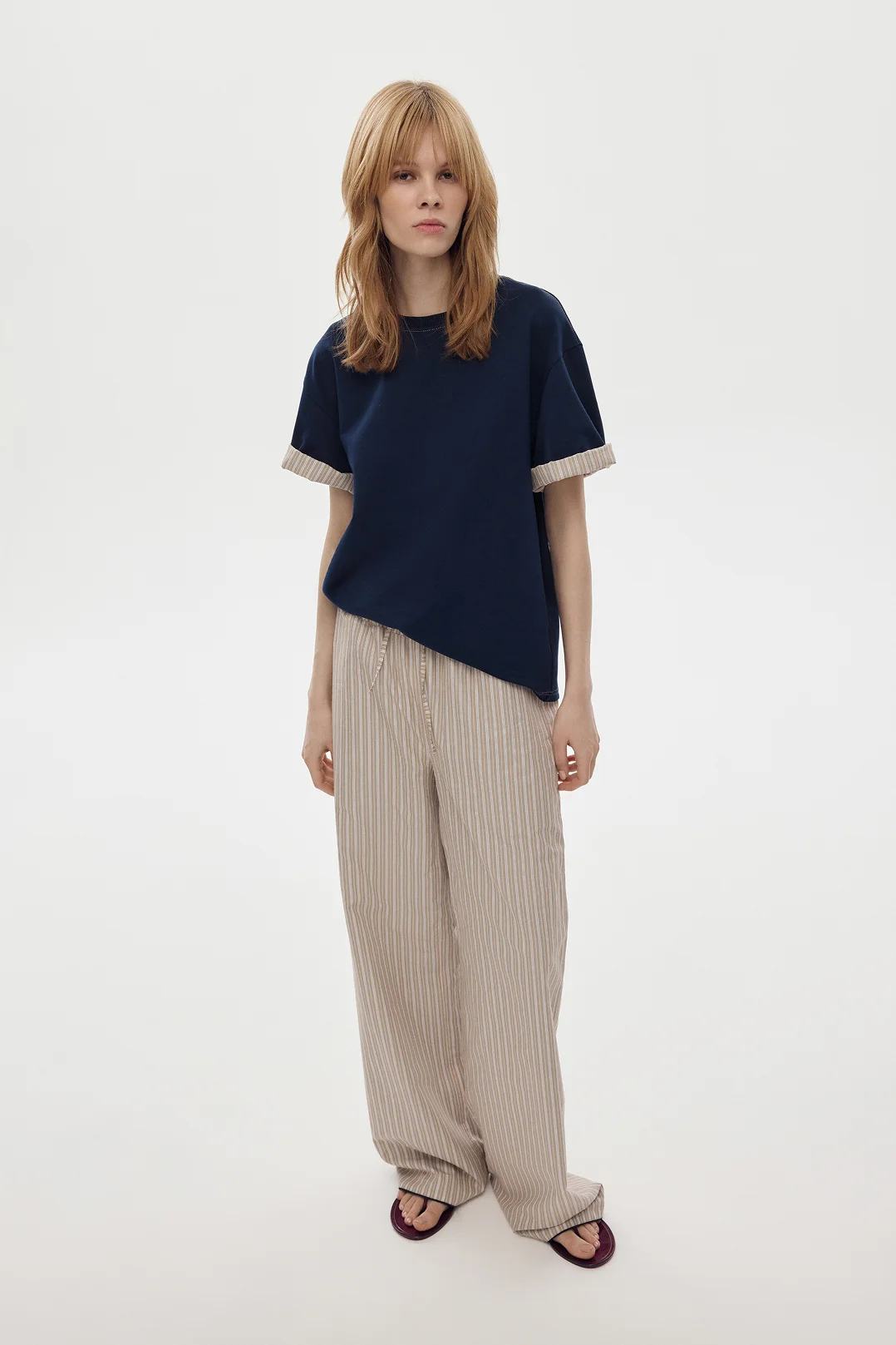 Особенность — скрытая внутренняя отделка рукавов из хлопковой ткани в полоску. Рукава можно носить в классическом варианте, сохраняя однотонный образ, или подвернуть — и добавить лёгкий контрастный акцент.