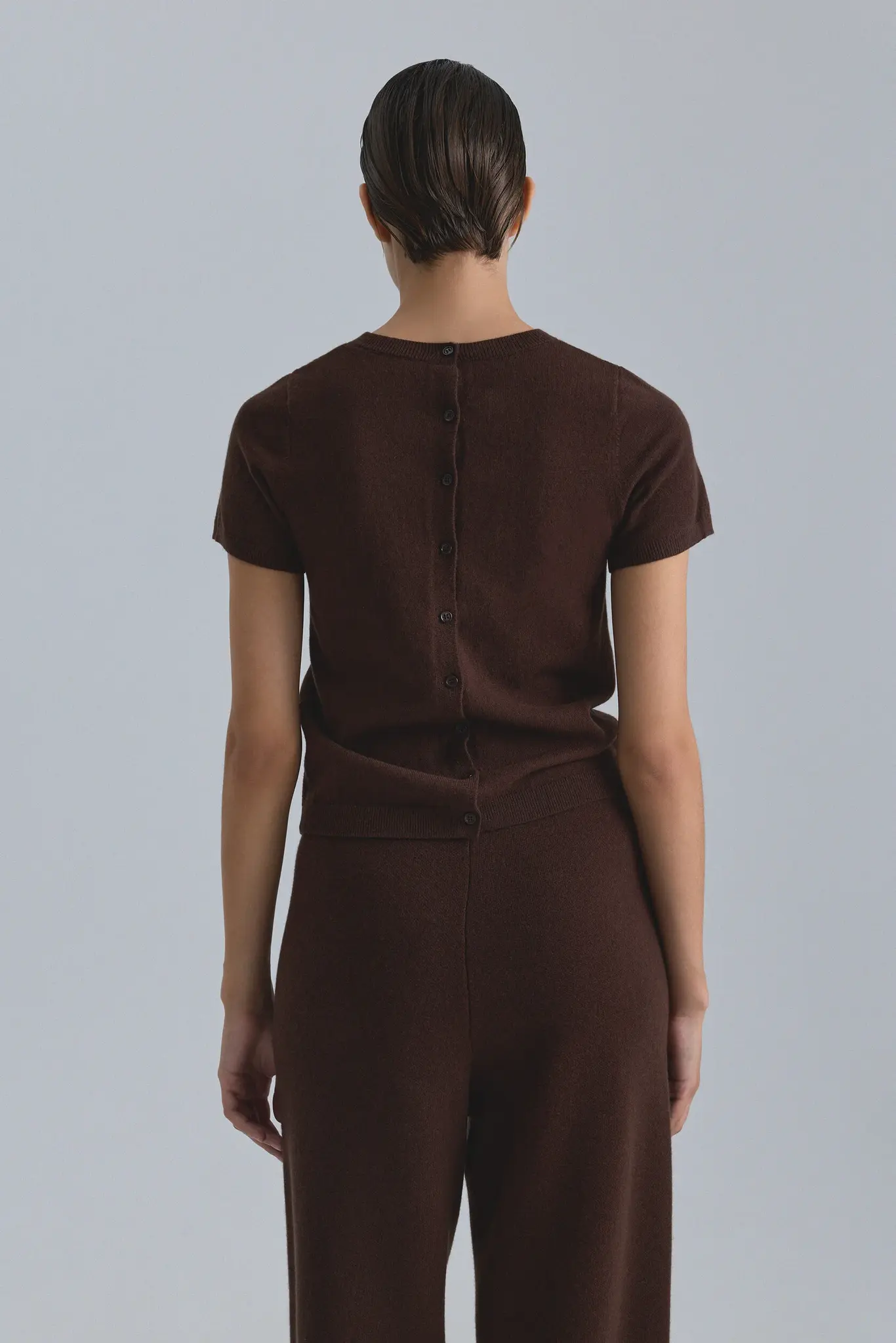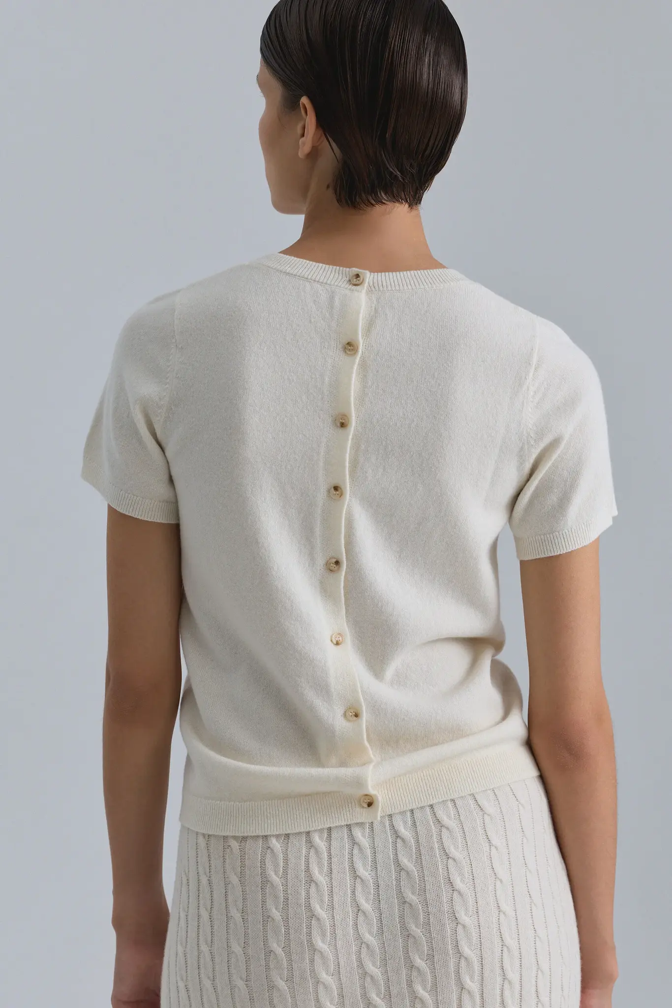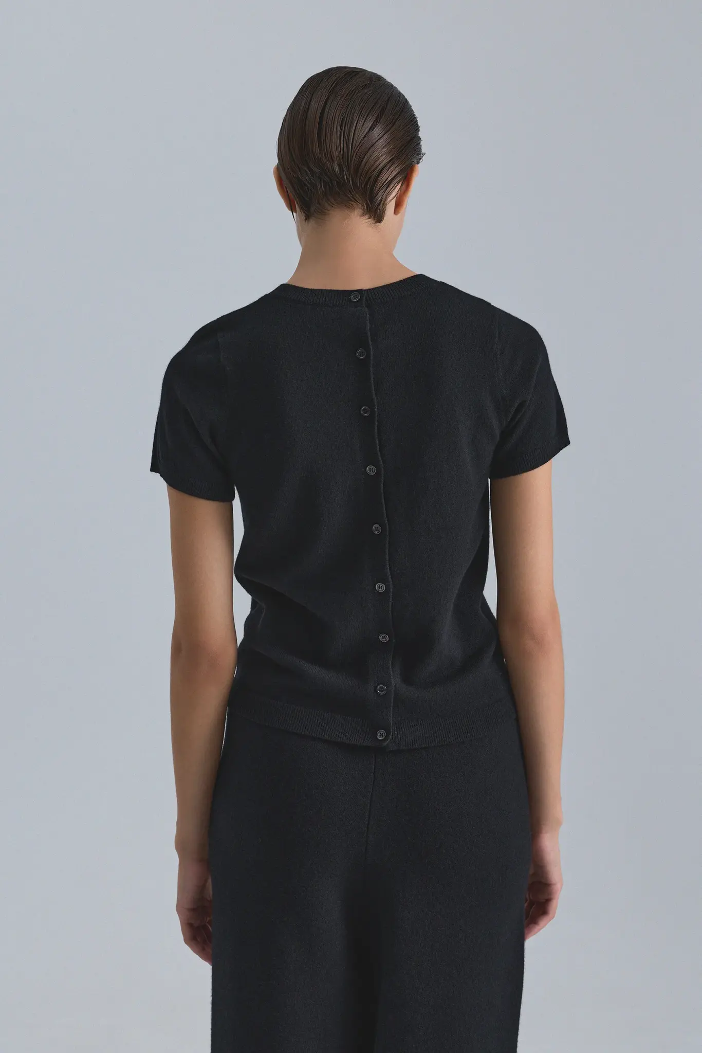 Мягкая футболка полуприлегающего силуэта с коротким рукавом из мягкой шерсти мериноса. Ворот, рукава и низ оформлены лёгкой манжетой, благодаря чему между телом и тканью сохраняется пространство — для комфорта и воздухопроницаемости. Особенность модели — пуговицы на спинке, с помощью которых можно варьировать силуэт и степень открытости. По желанию их можно перенести на лицевую сторону.