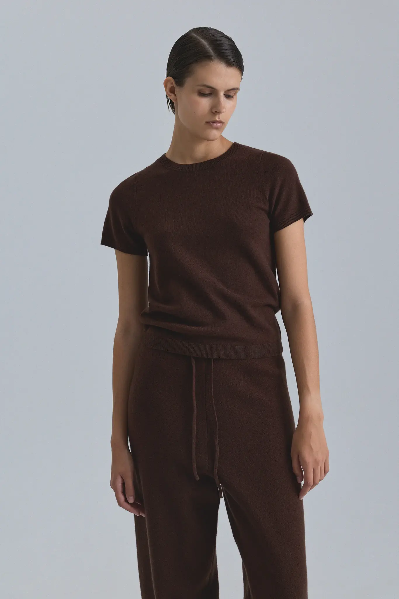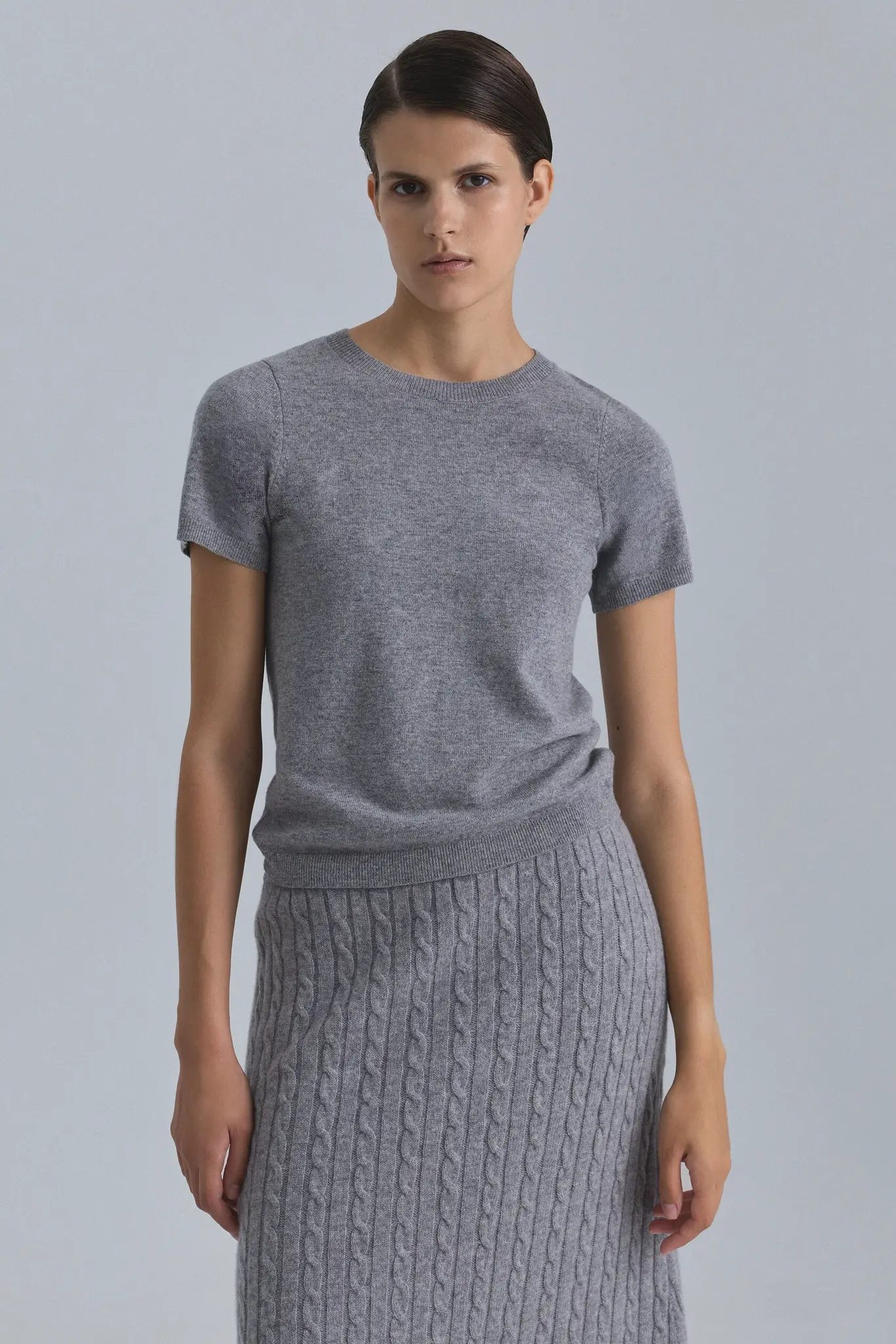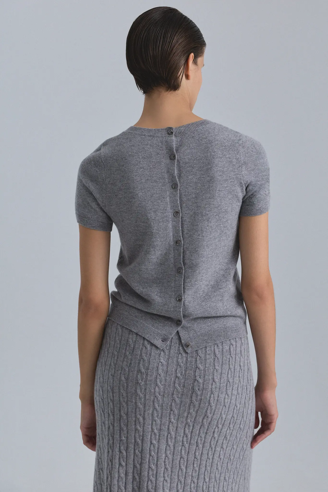 Мягкая футболка полуприлегающего силуэта с коротким рукавом из мягкой шерсти мериноса. Ворот, рукава и низ оформлены лёгкой манжетой, благодаря чему между телом и тканью сохраняется пространство — для комфорта и воздухопроницаемости. Особенность модели — пуговицы на спинке, с помощью которых можно варьировать силуэт и степень открытости. По желанию их можно перенести на лицевую сторону.