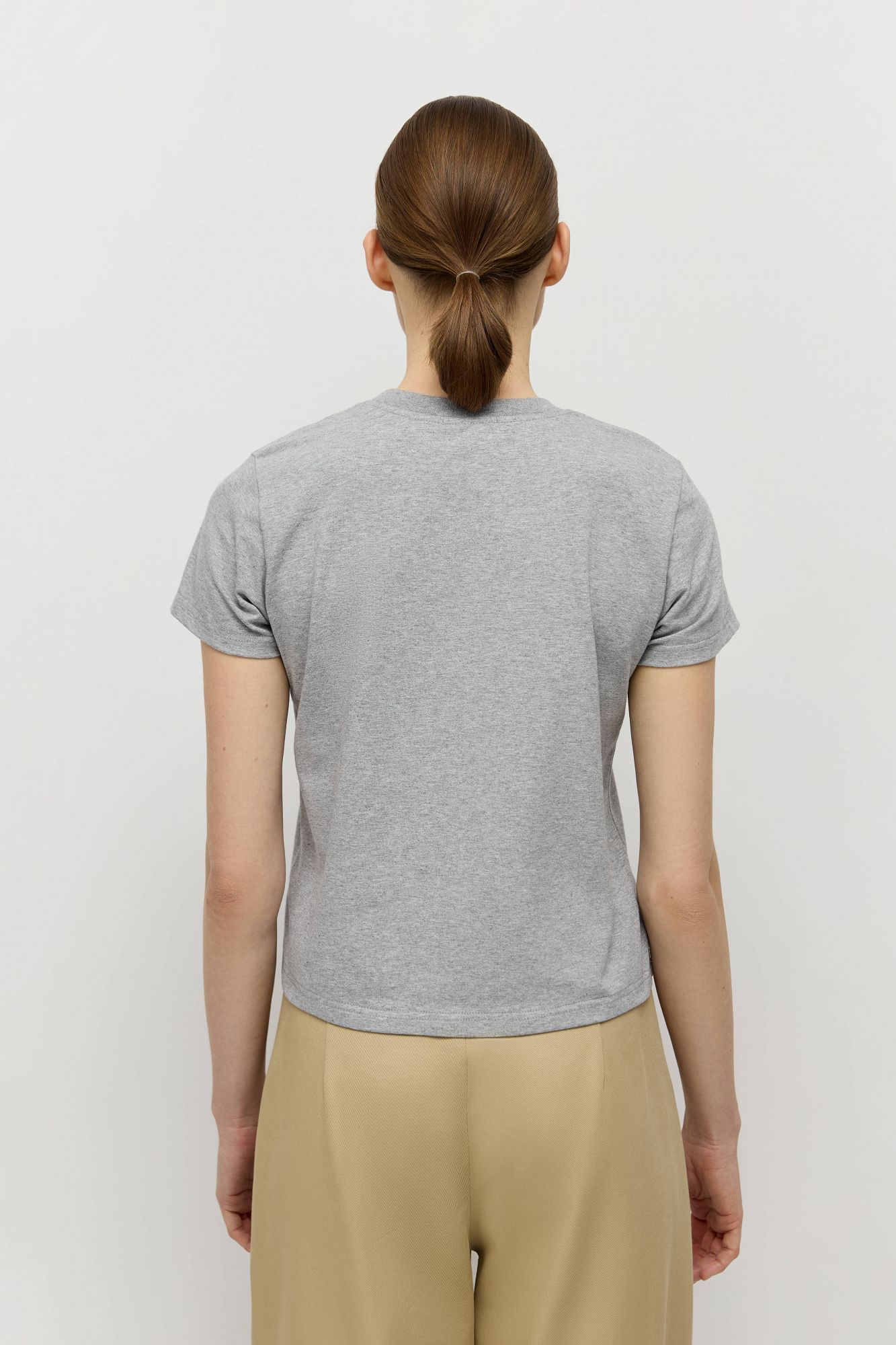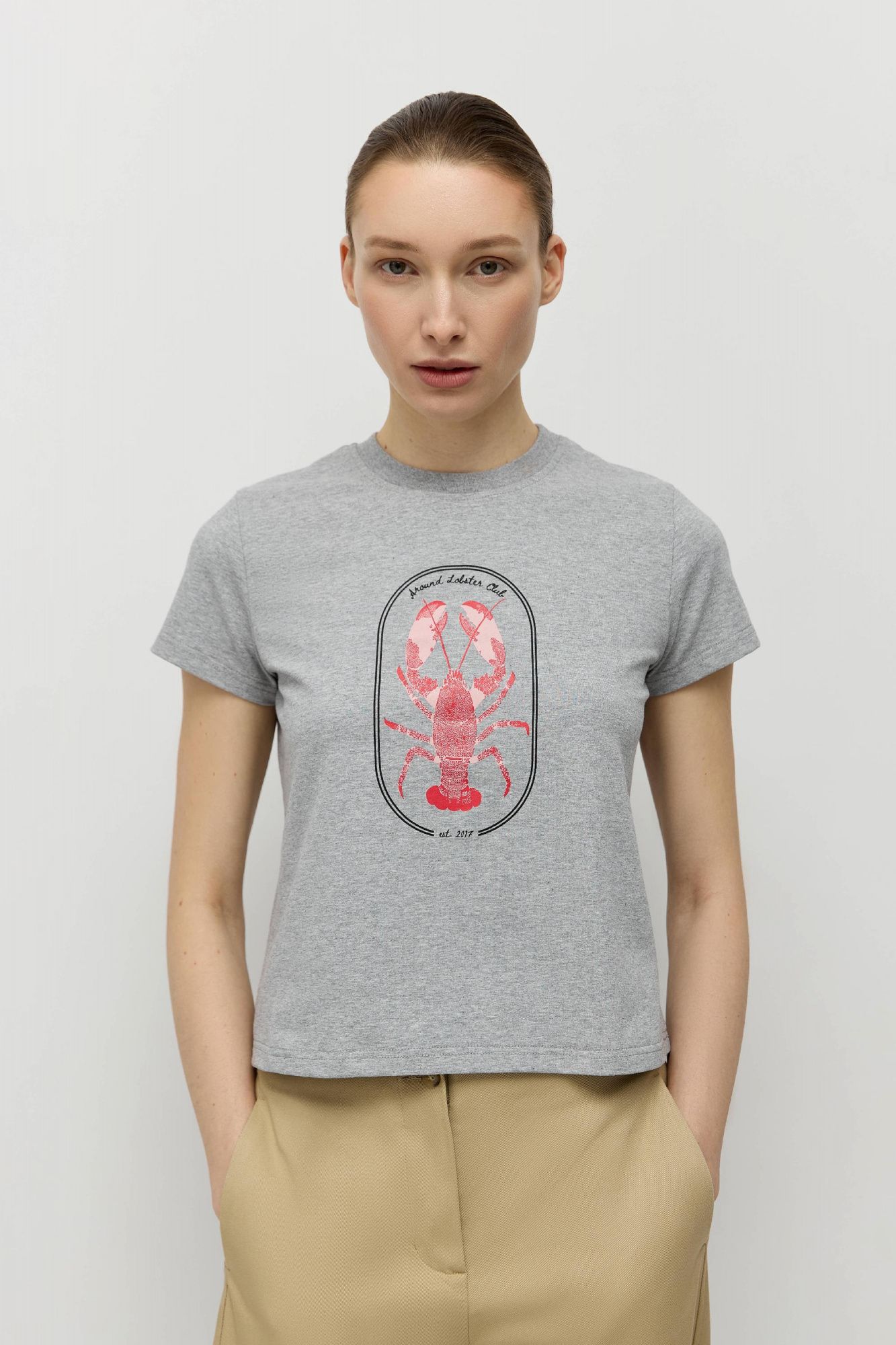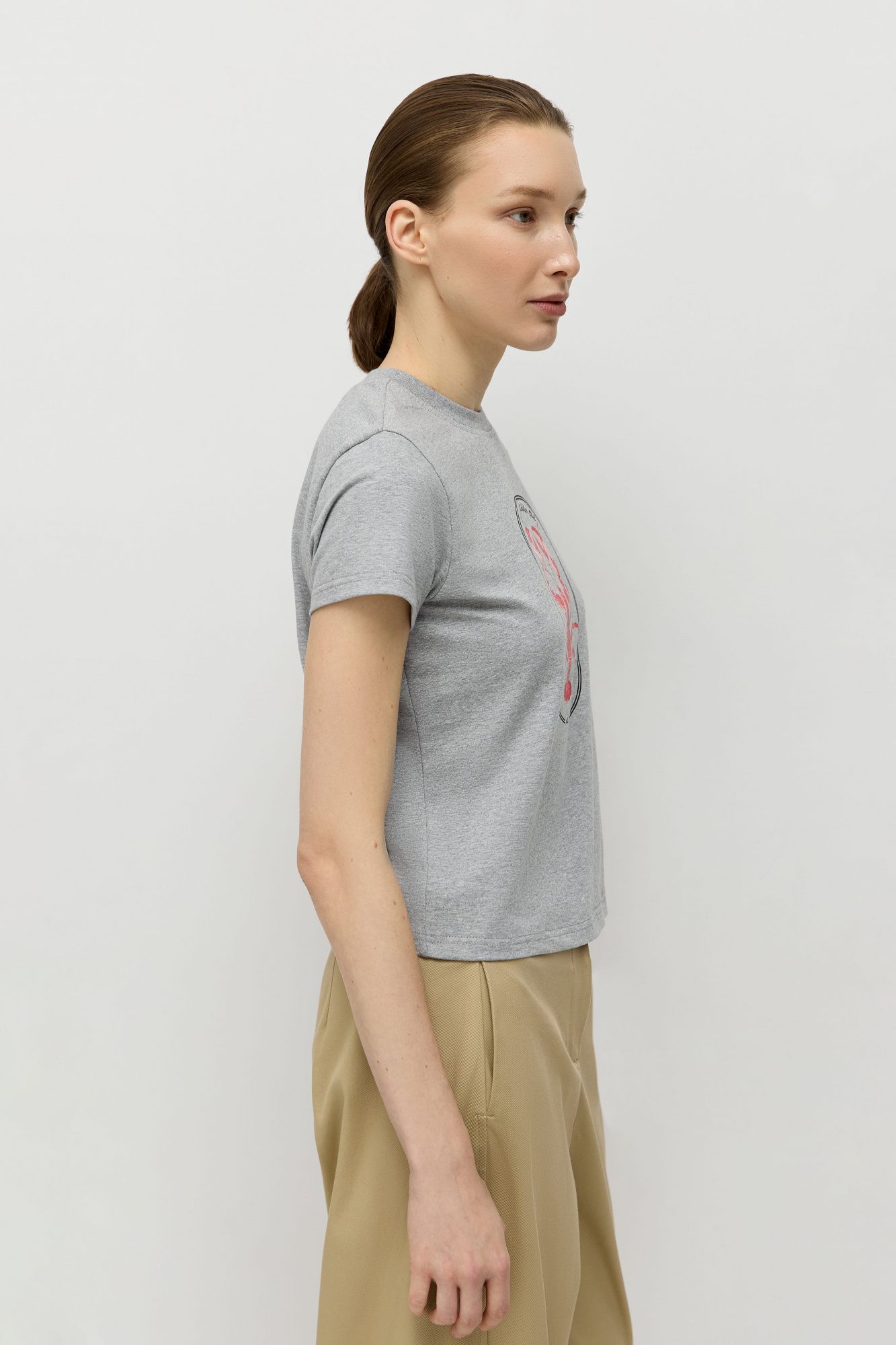 Футболка базового прямого кроя сшита из натурального хлопка. Спереди расположен печатный принт, отражающий тему коллекции весна-лето'26, выполненный шелкографией — методом печати высокого качества.