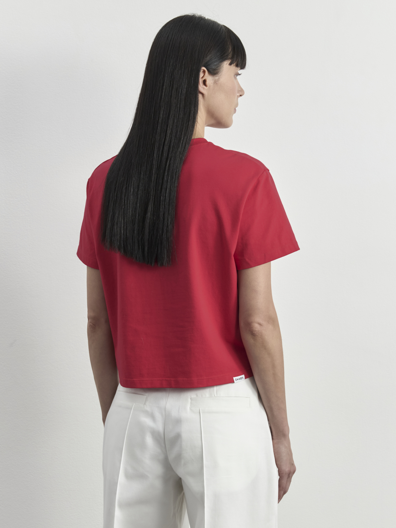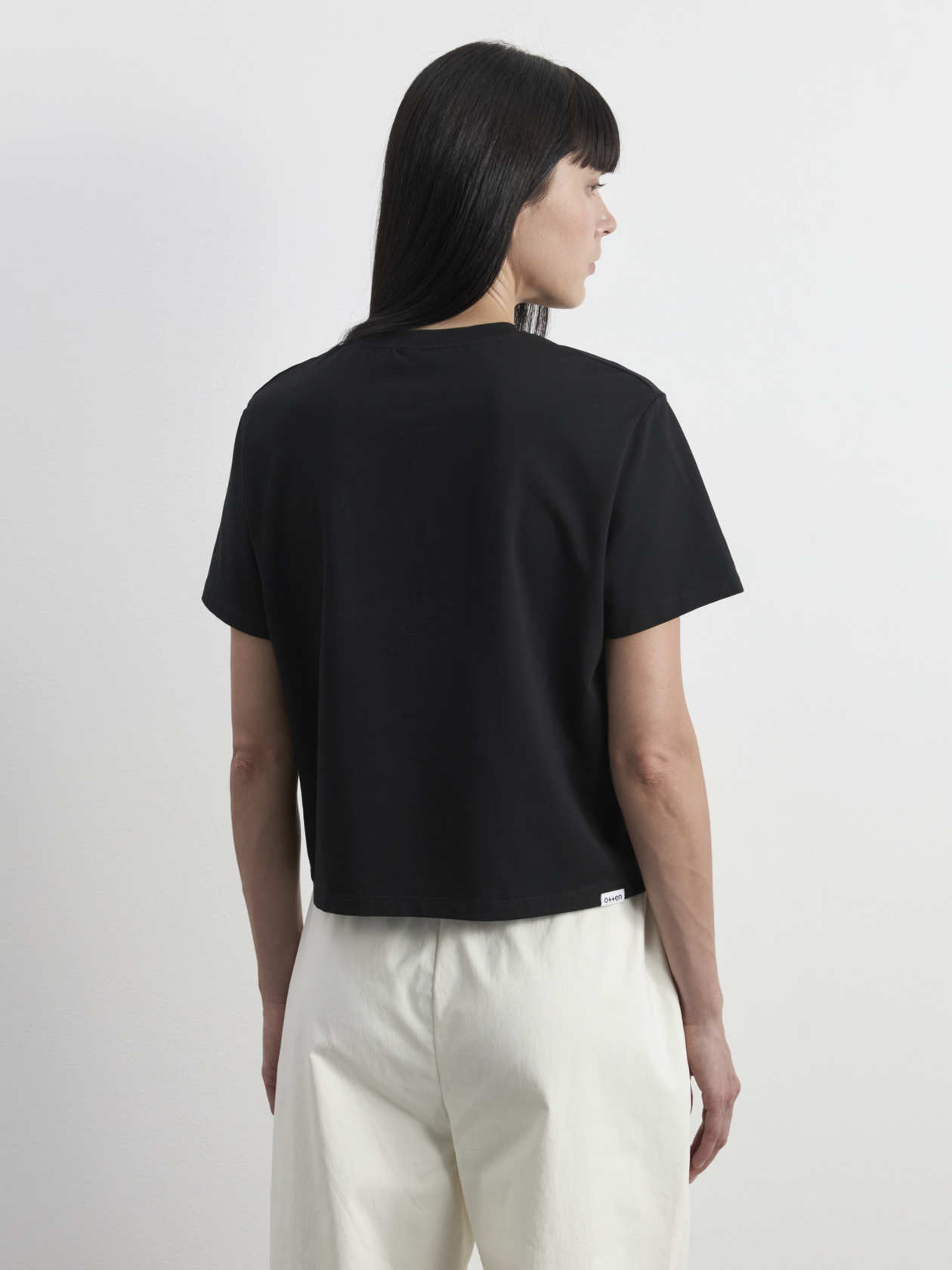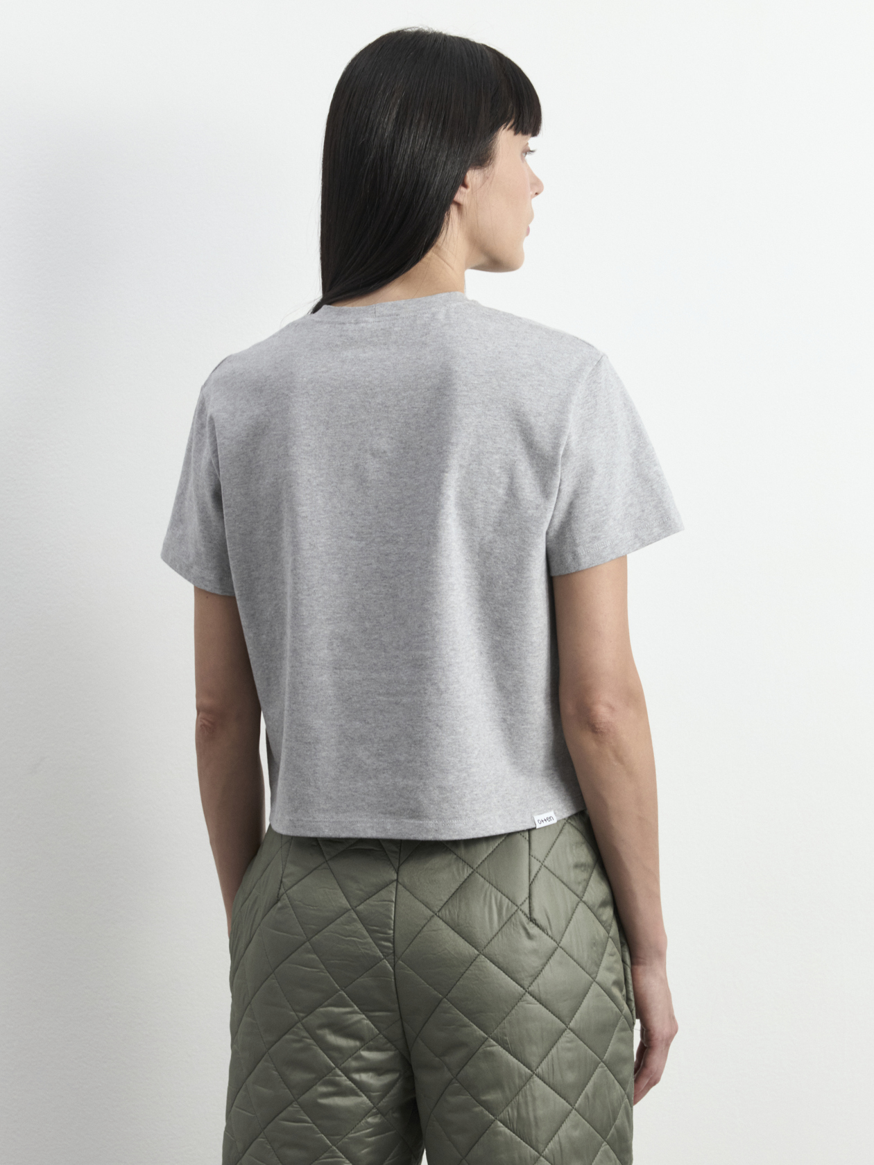 Укороченная свободная футболка со вшивным ярлыком-лого на спинке. Короткий рукав и круглая горловина.
