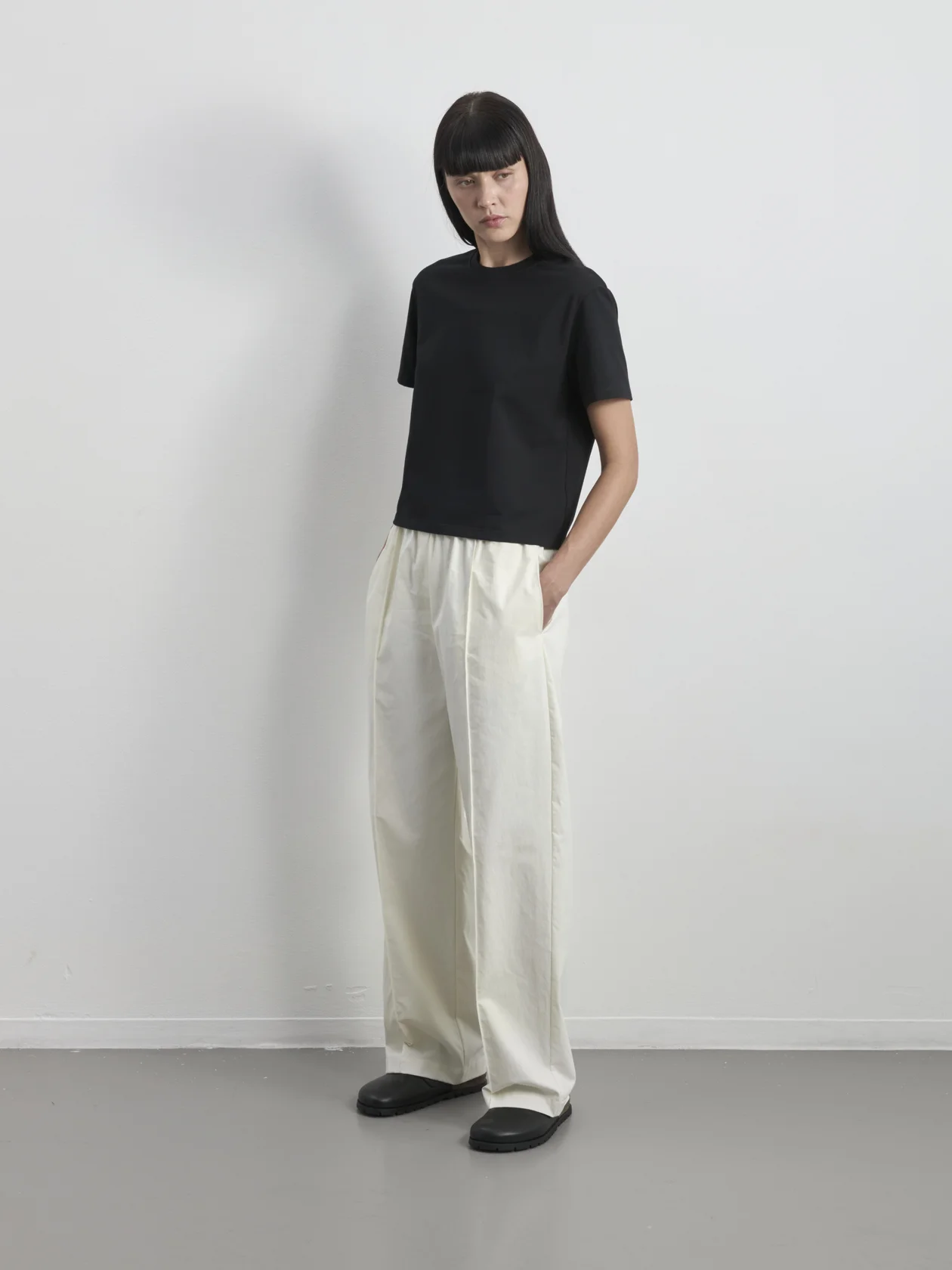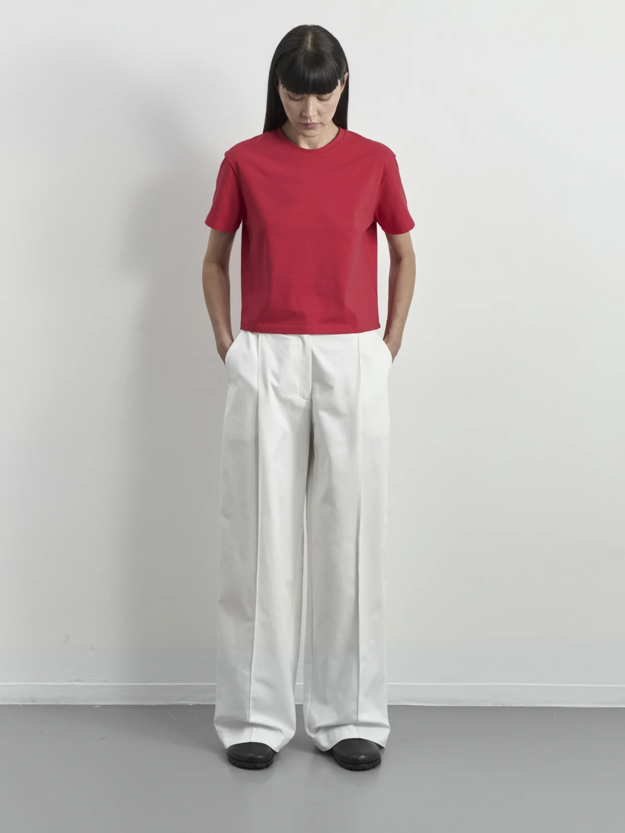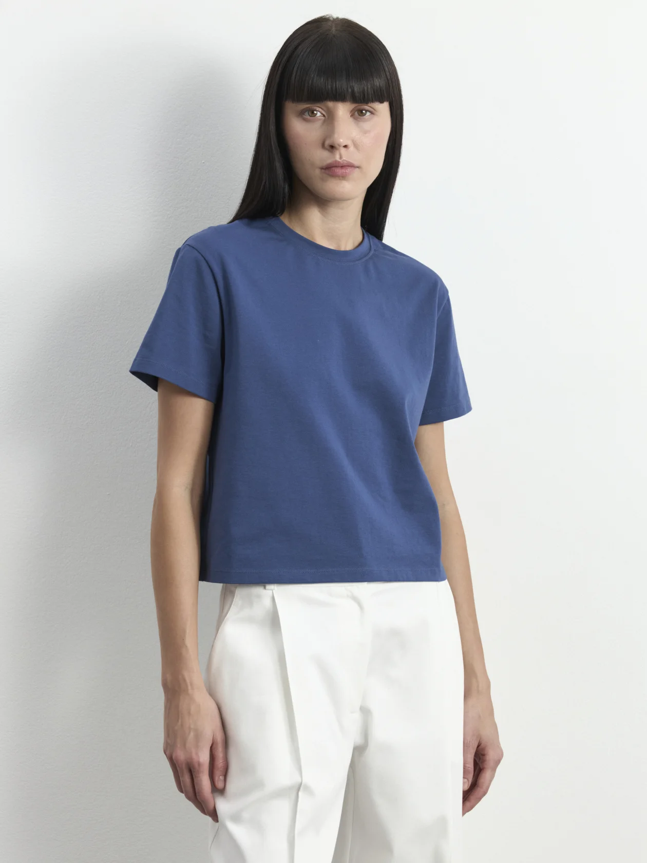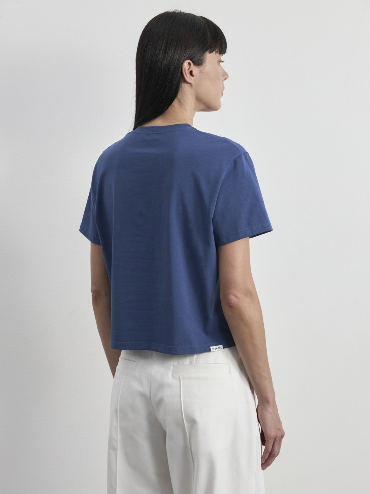 Укороченная свободная футболка со вшивным ярлыком-лого на спинке. Короткий рукав и круглая горловина.