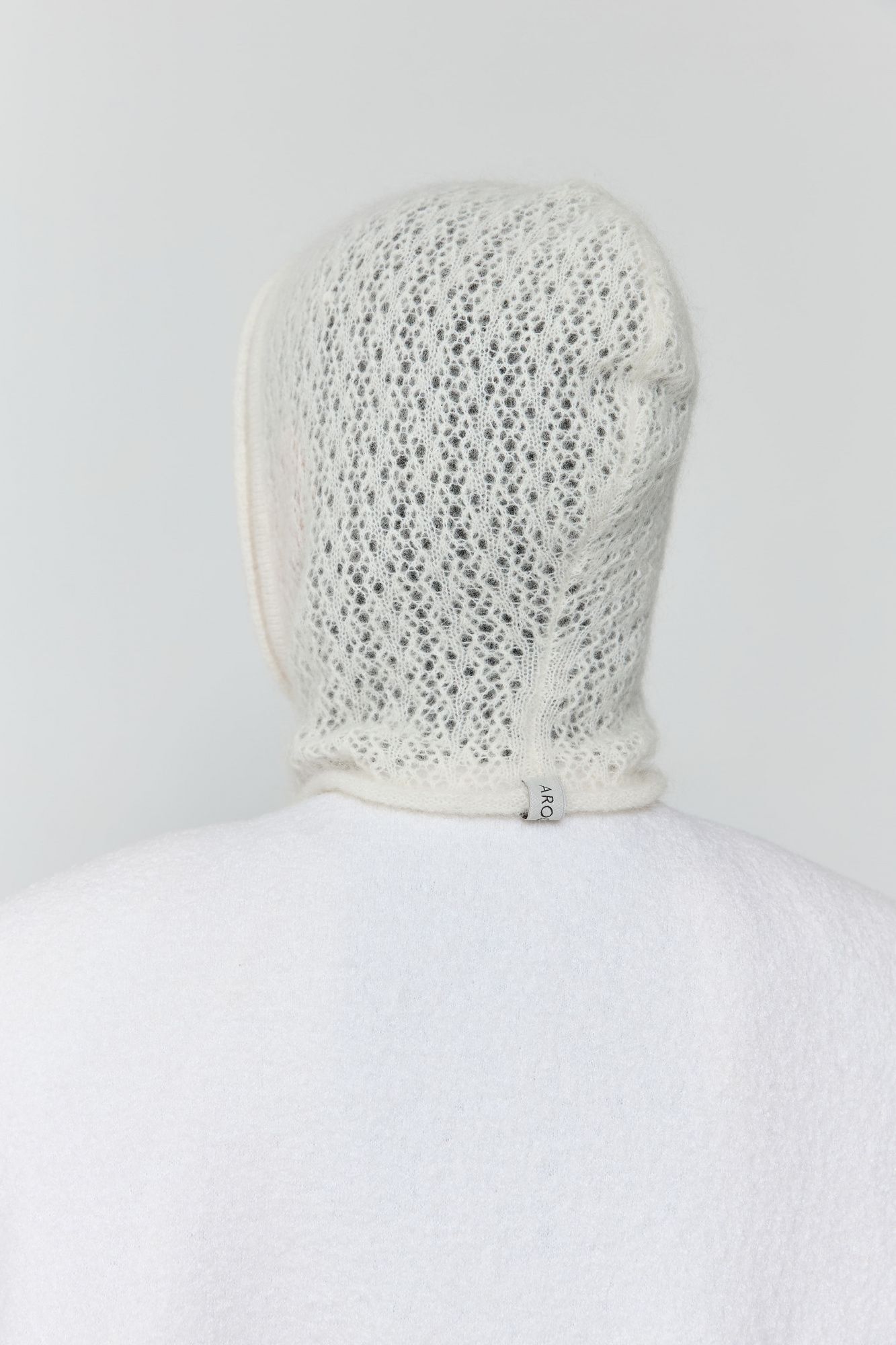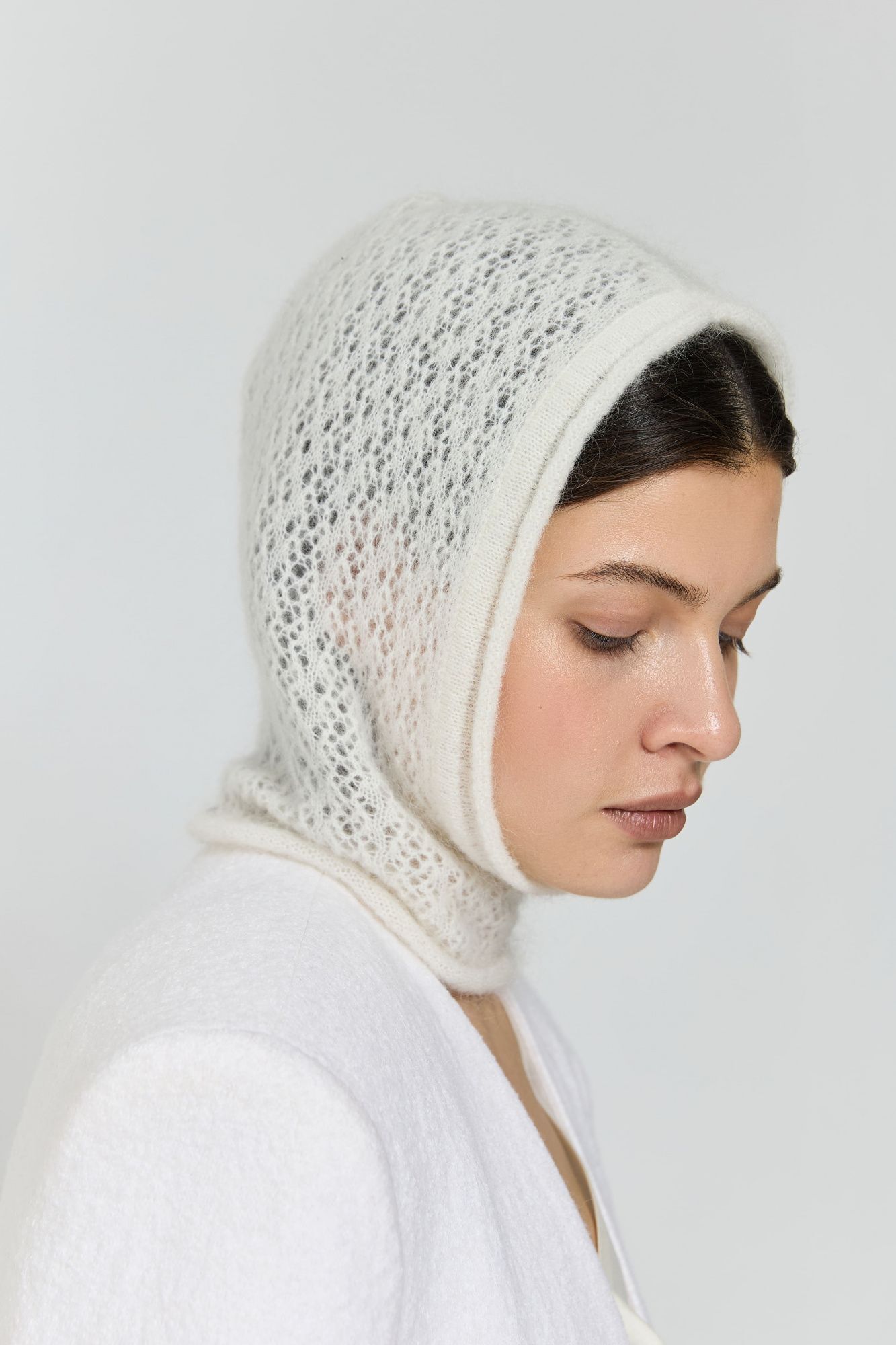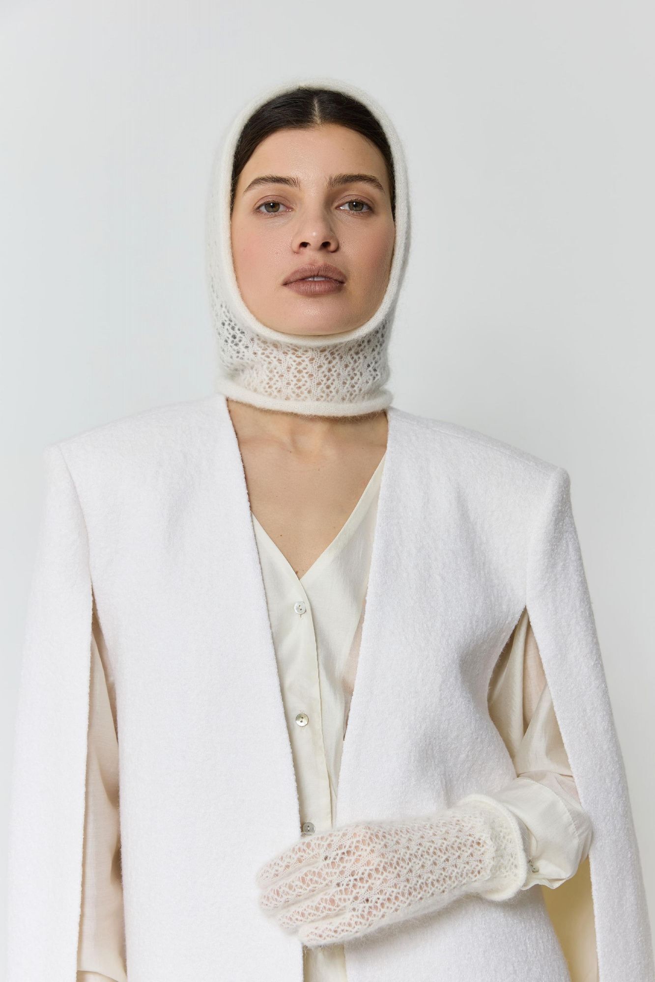 Ажурная вязка и пушистая пряжа придают элегантное настроение этому аксессуару; капор подойдет для стилизации в нарядных выходах.