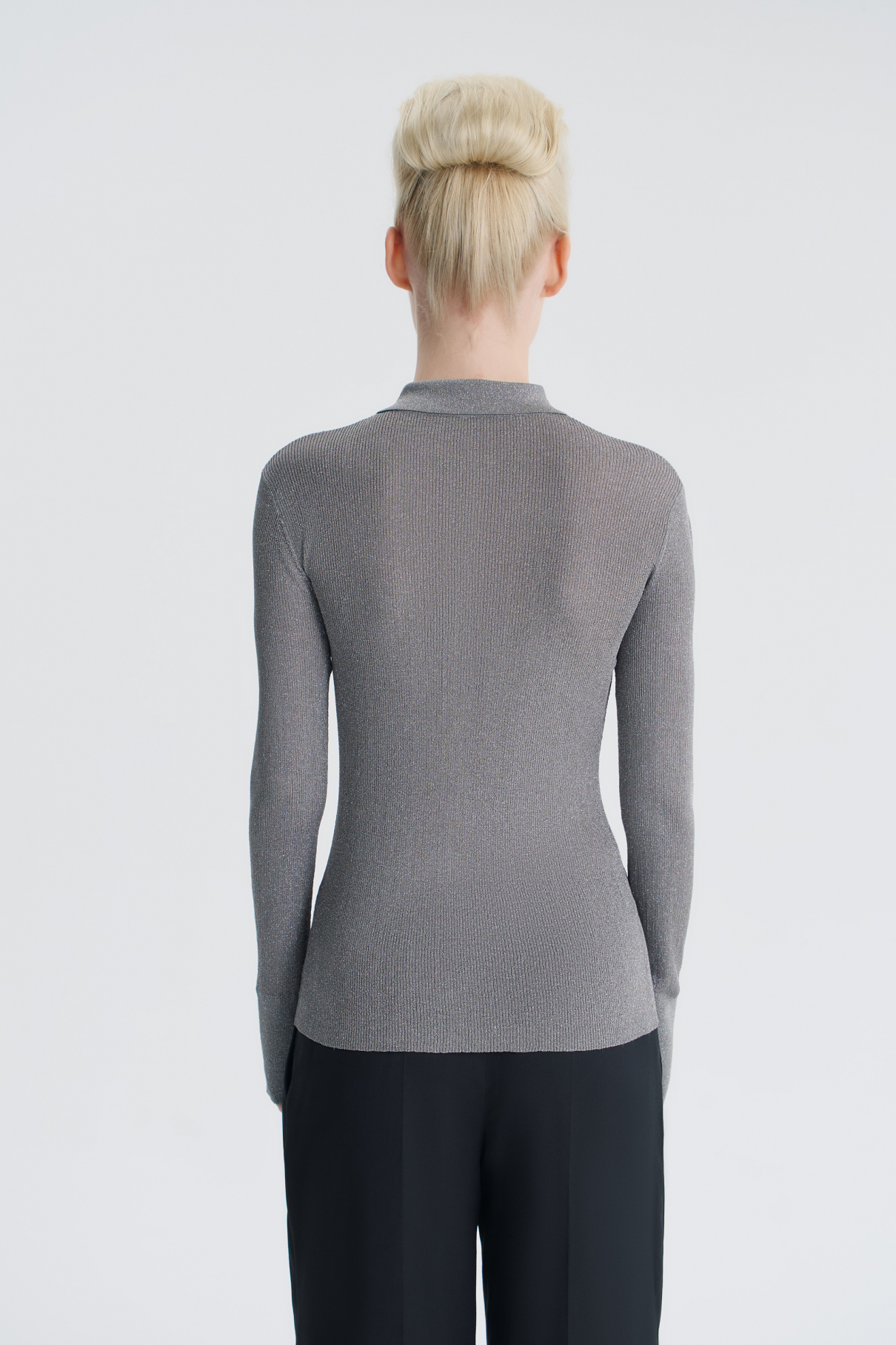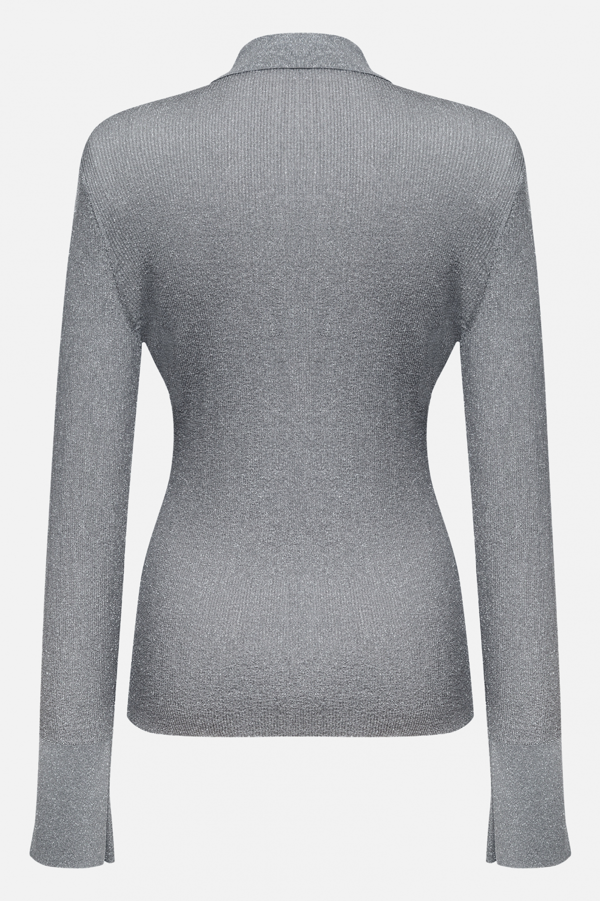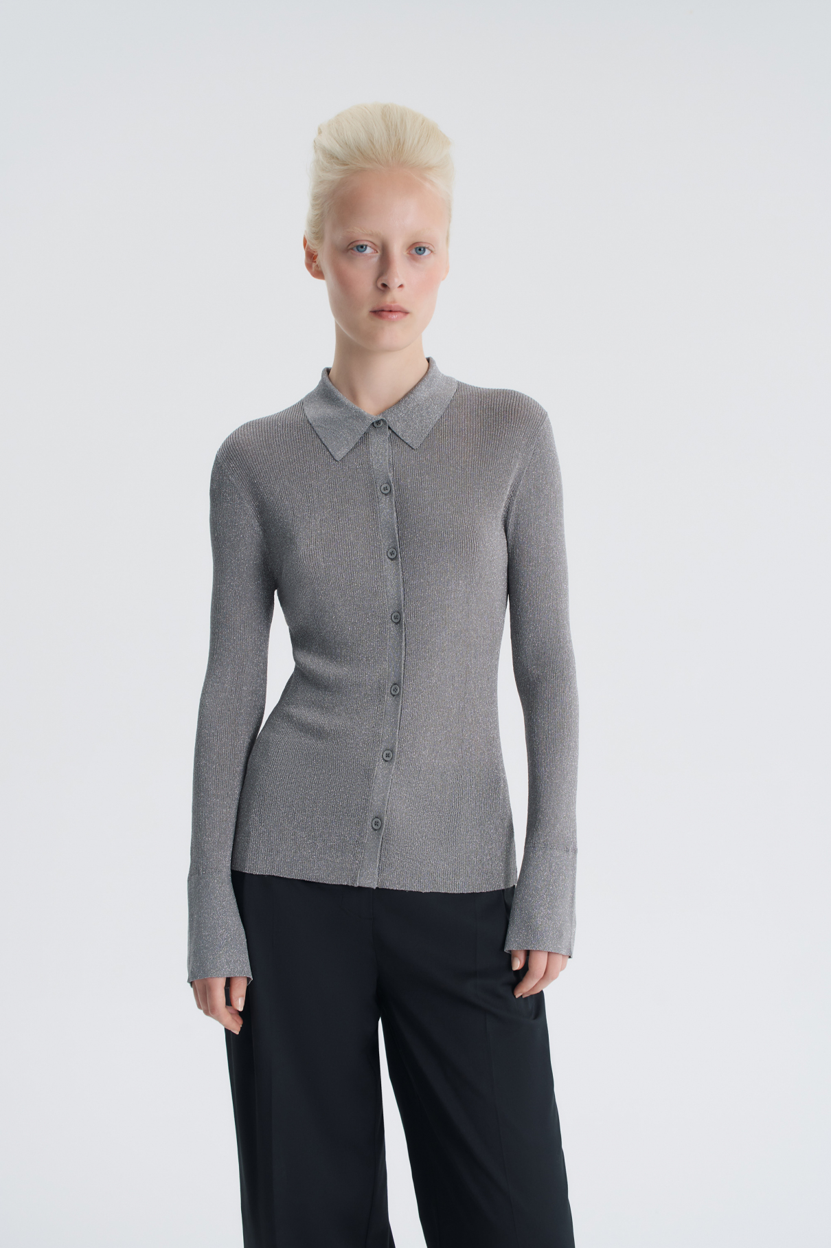 Трикотажная рубашка прилегающего силуэта — альтернатива и тонкому кардигану, и текстильным моделям одновременно. Изделие связано из люрексовой нити с деликатным блеском, при этом рубашка получилась мягкой и приятной к телу. «Рубашечный» дизайн — застежка на пуговицы, характерный отложной воротник позволяют носить изделие с костюмами и брюками, а чуть удлиненный рукав и манжета делают образ интереснее и добавляют модели уюта, как будто вы уже спрятали руки от холода.