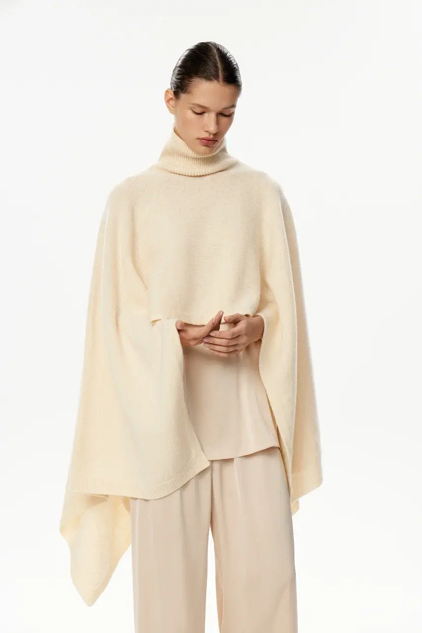 Кейп объемного кроя выполнен из 100% шерсти. Высокая, но мягкая горловина. Асимметричный крой-перед изделия короче, чем спинка. Идеален вместо палантина или шарфа на пальто, а также как накидка, в которую приятно укутаться в прохладную погоду.