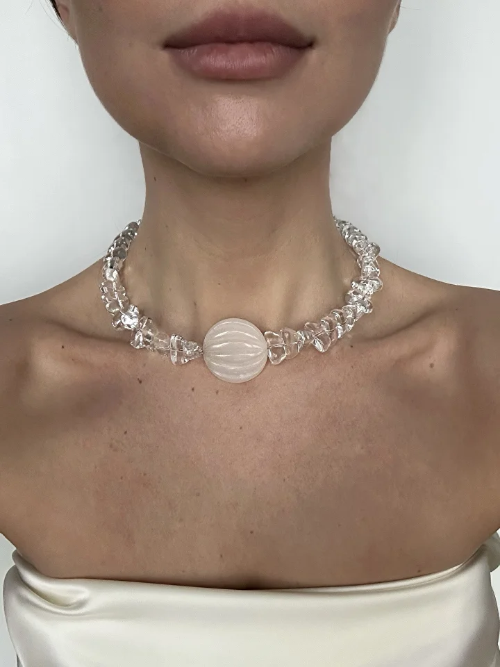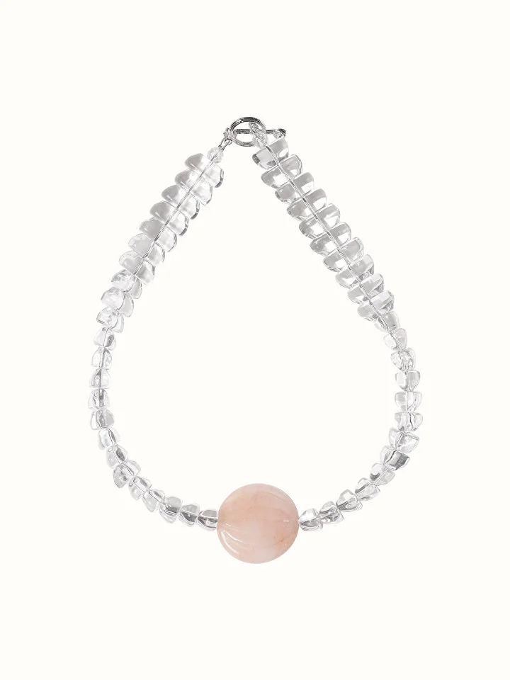 Хрустальные бусины играют светом и отражают каждый лучик, создавая ощущение лёгкости и свежести, а солнечный камень притягивает взгляд мягким, натуральным светом персикового оттенка. В сердце украшения — именно он задаёт настроение, придавая колье особую глубину и теплоту.