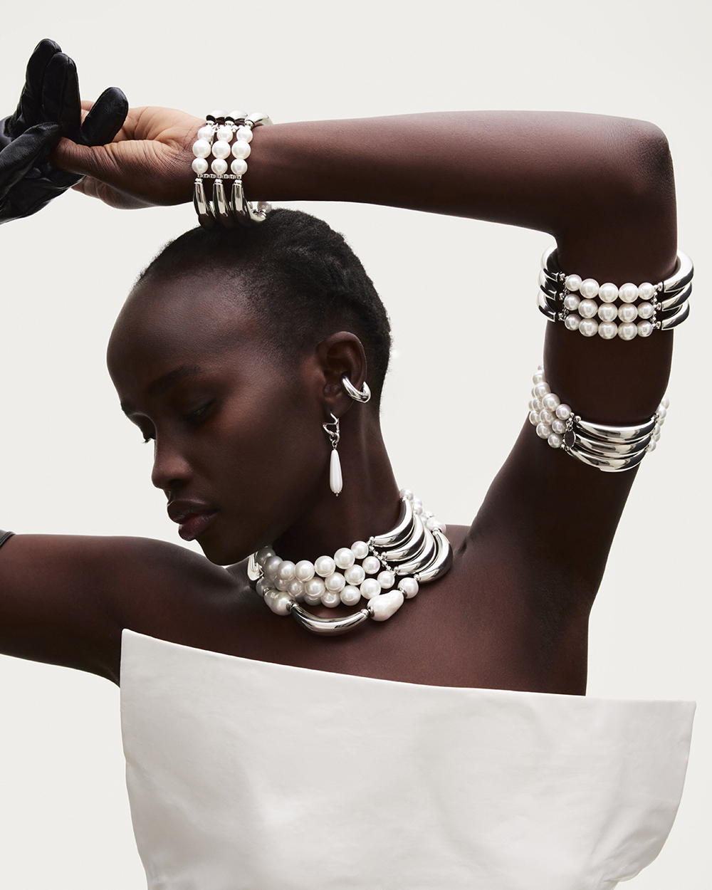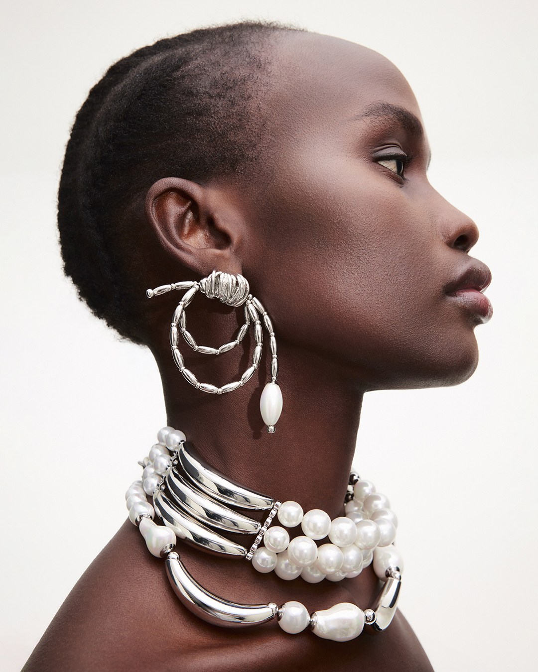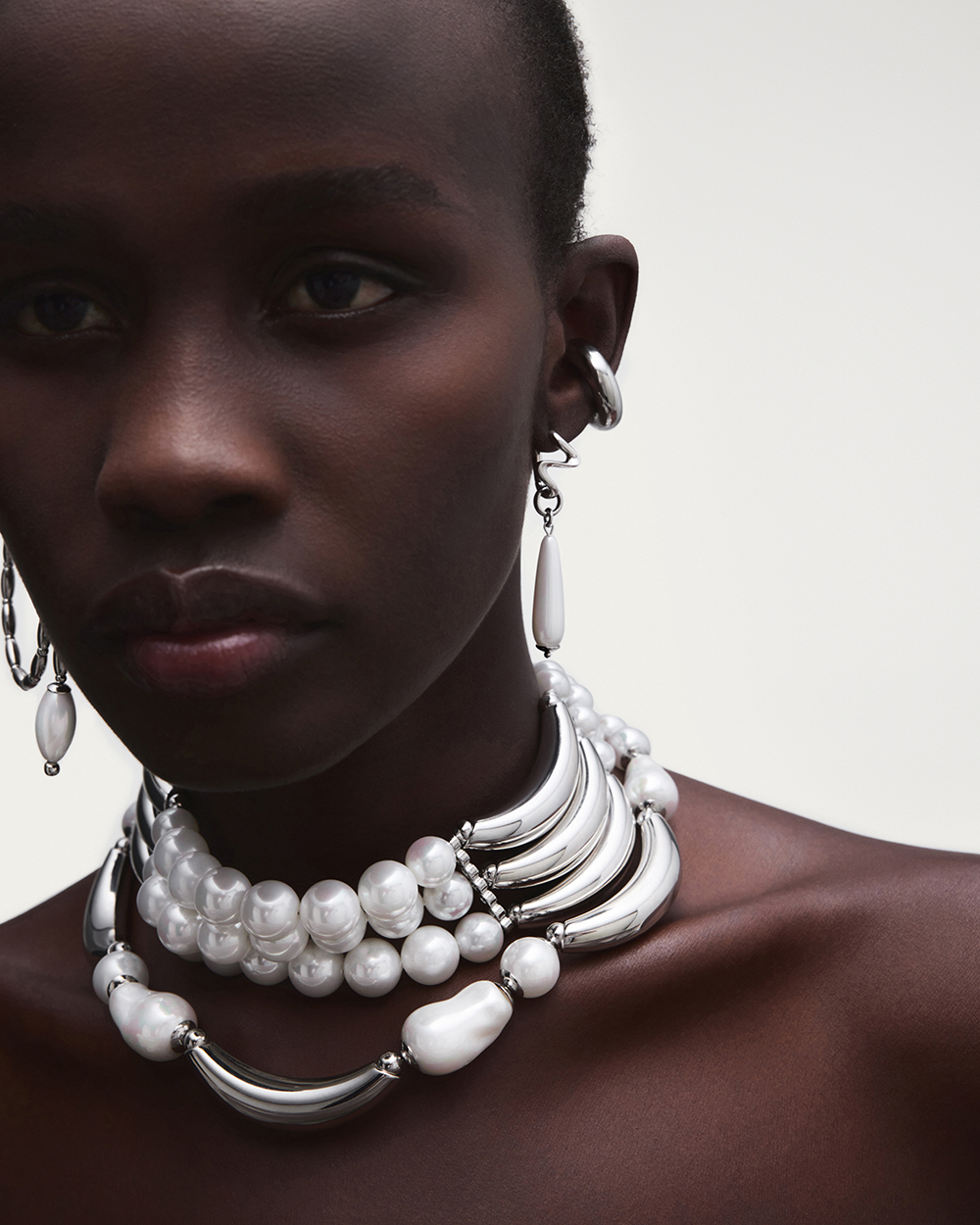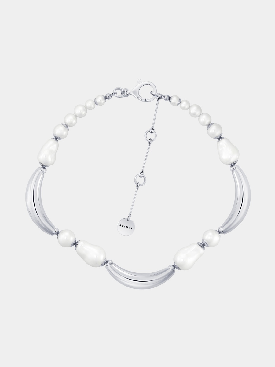 Колье "PEARL FLOW" — это текучесть форм и движение света на коже. Мягкое сияние жемчуга встречает холодную гладкость металла, создавая идеальный баланс между нежностью и силой. Изделие словно дышит, оно текучее, живое, вне времени.