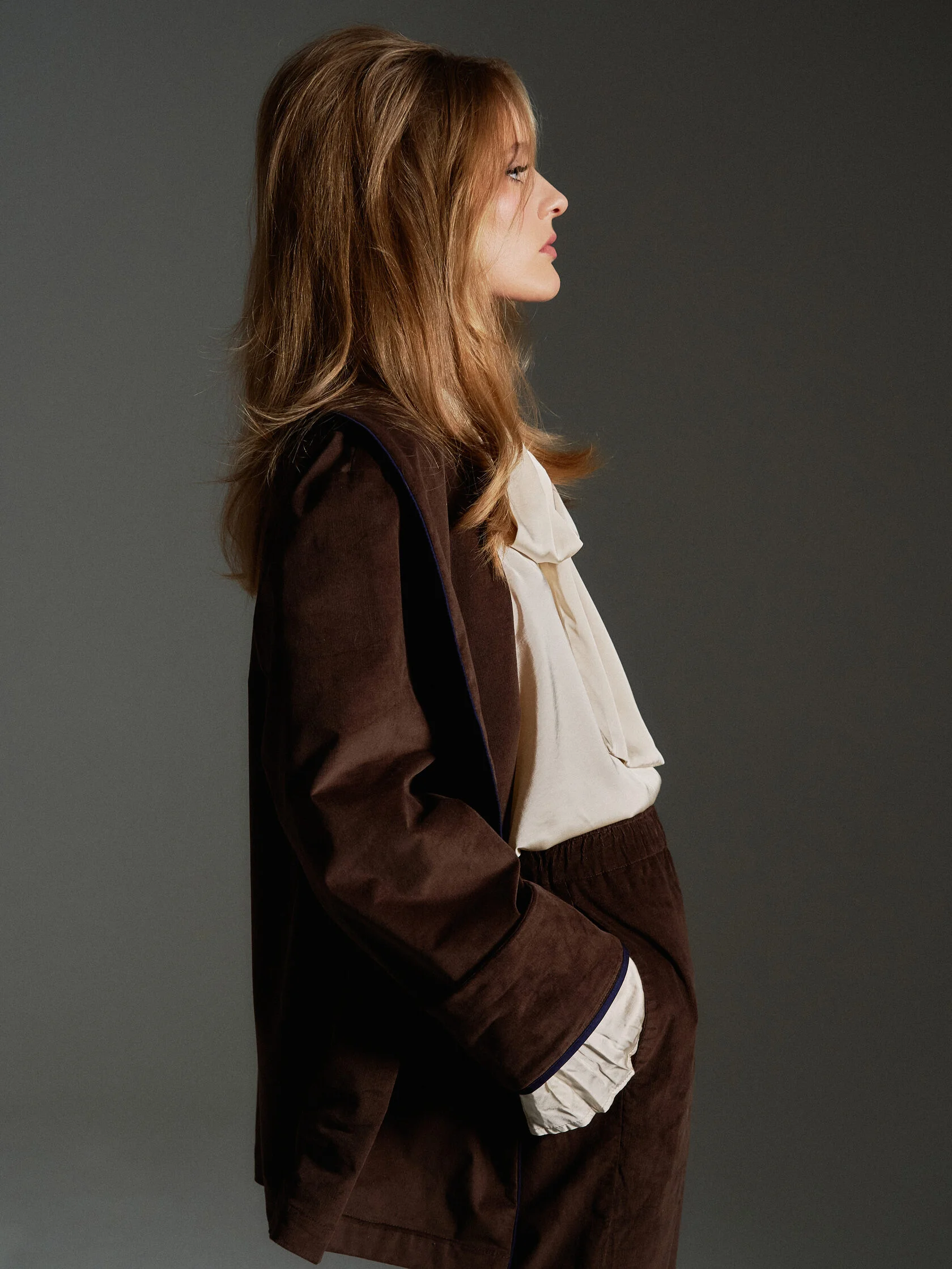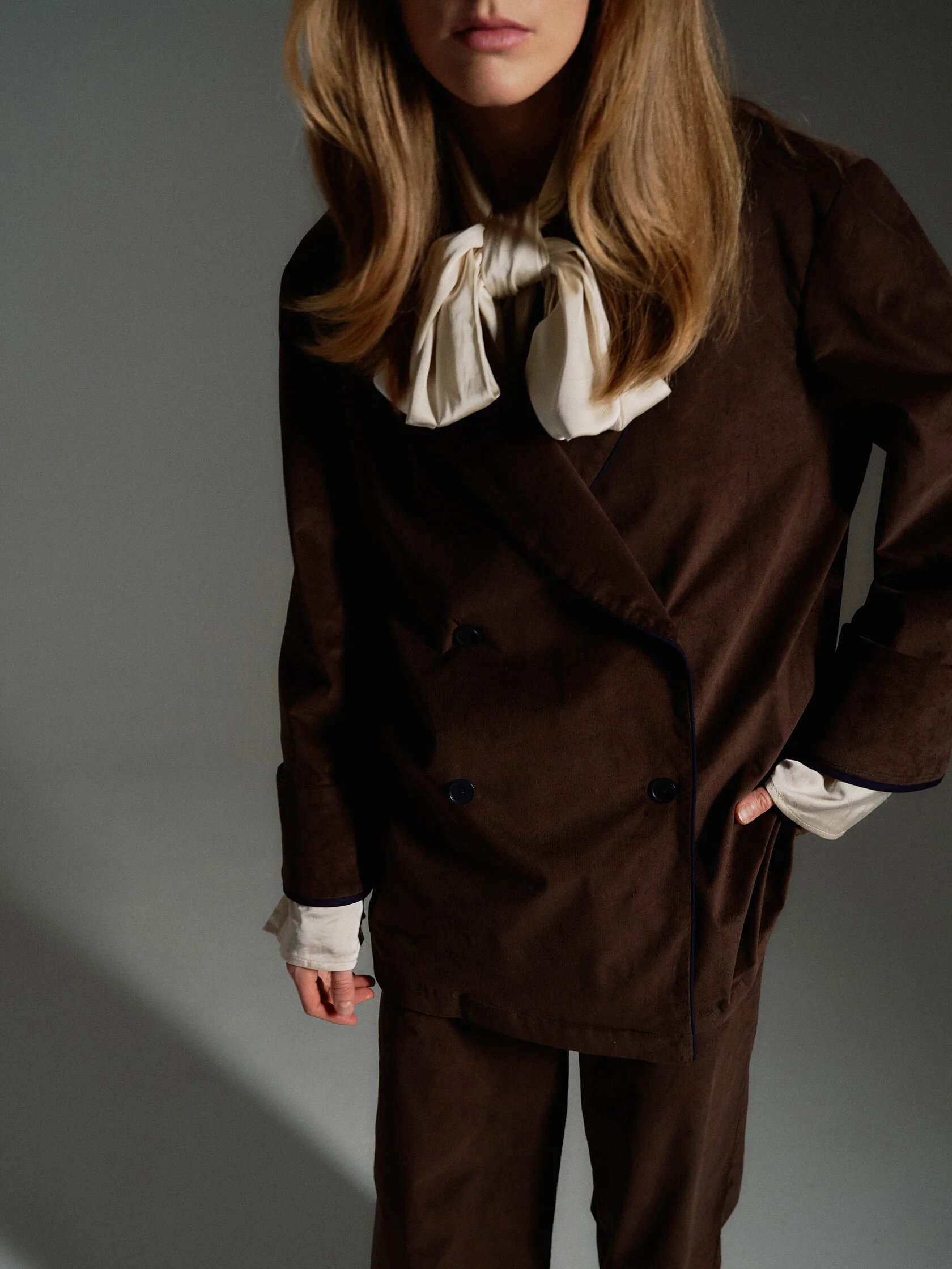 Унисекс костюм из микровельвета прямого силуэта в шоколадном оттенке с контрастными пуговицами и кантом темно-синего цвета. Двубортный пиджак можно застегивать на правую и левую сторону и пробовать разные способы стилизации воротника.