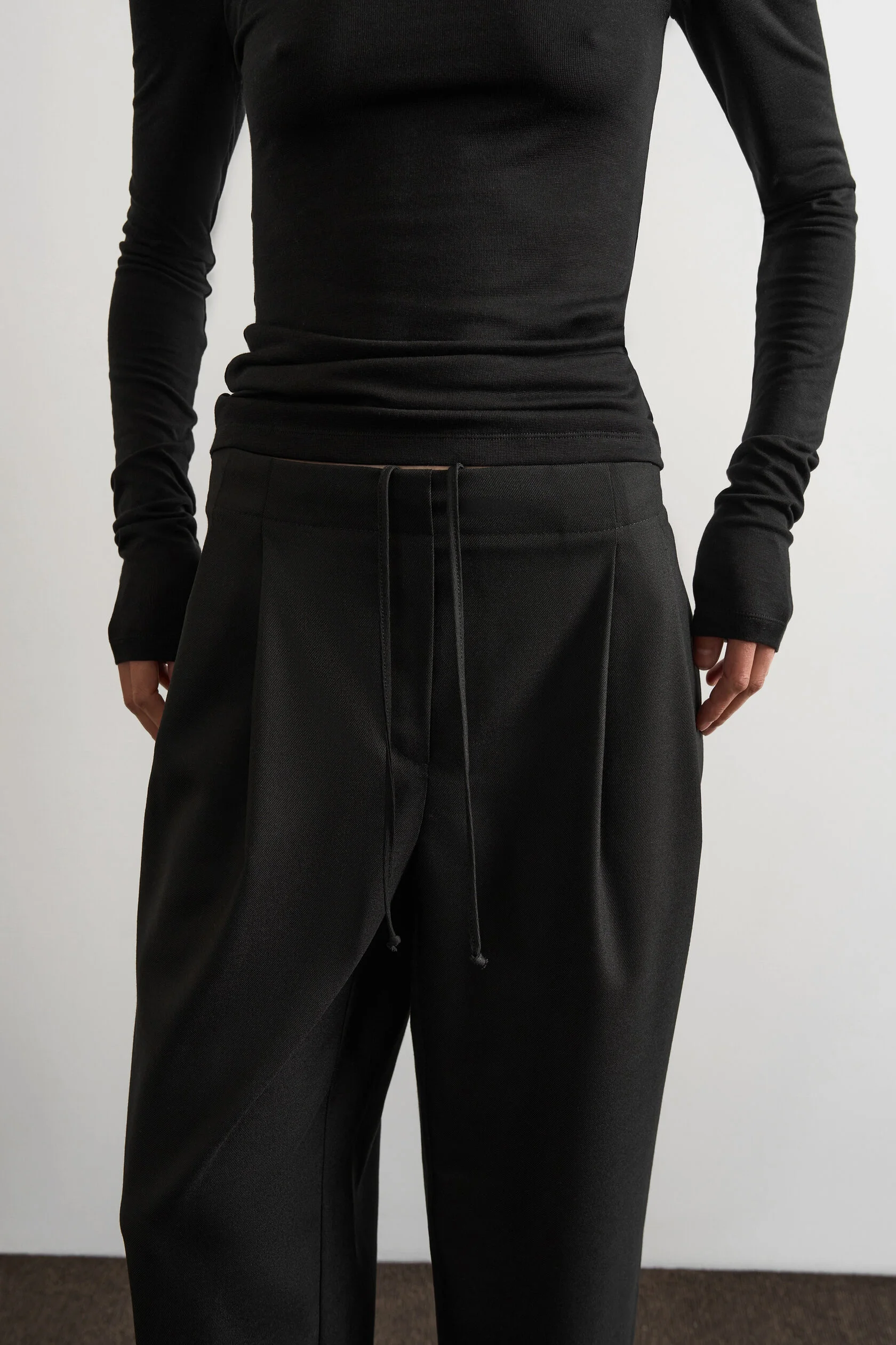 Градус серьезности сбивает ложный гульфик — у брюк нет привычной молнии или крючков. Вместо этого предусмотрена кулиса, позволяющая регулировать посадку, а сзади пояс обработан широкой простроченной резинкой.