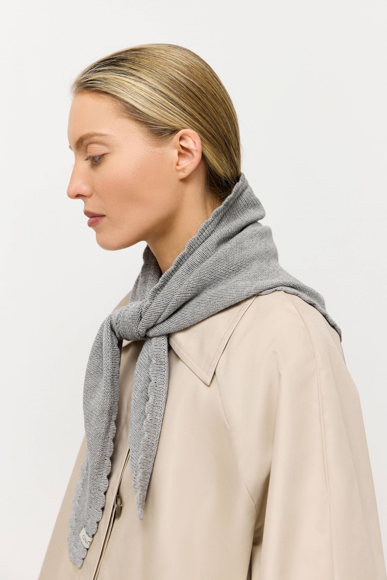Косынка связана из хлопка с добавлением кашемира. По двум сторонам в качестве акцента вывязаны фестоны.