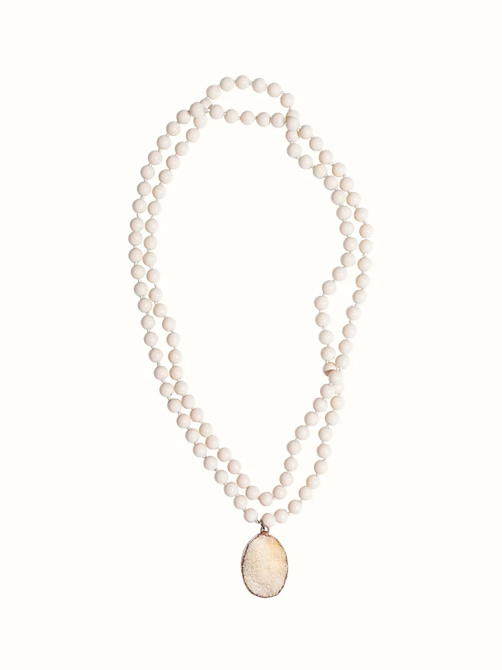 В лимитированной серии всего 10 кулонов - каждый со своим характером и оттенком, словно сахарные крупинки, но ни одна не повторяется. Шнурок из бусин розового кварцевого агата длиной до талии мягко обвивает, кулон друза кварца в медно-бронзовой оправе.