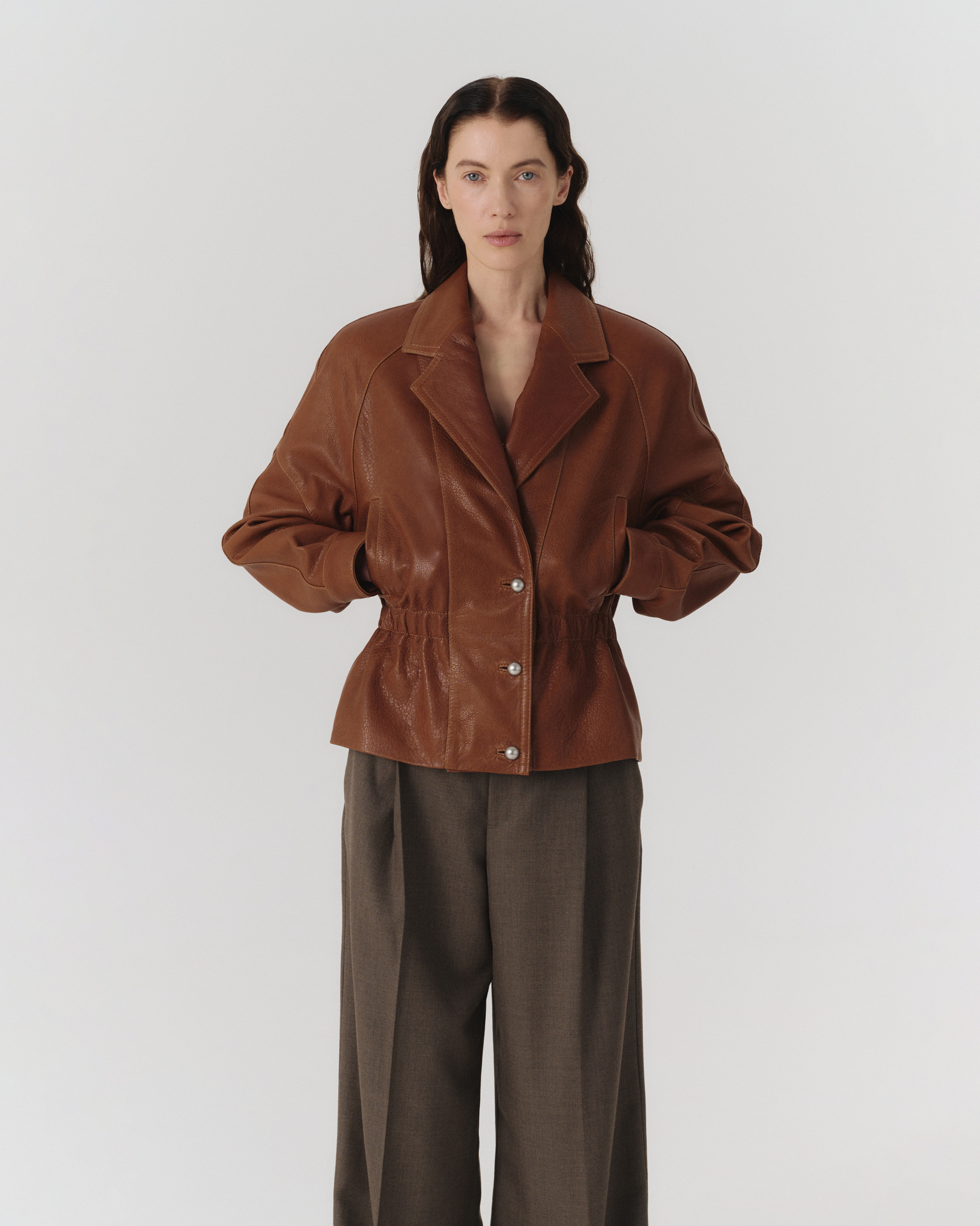 Силуэт слегка расслабленный, но структурный, с мягкими линиями, присобранной талией и выразительными плечами. Натуральная кожа с выраженной фактурой придает модели глубину и объем, а металлические пуговицы с винтажной патиной добавляют финальный штрих.
