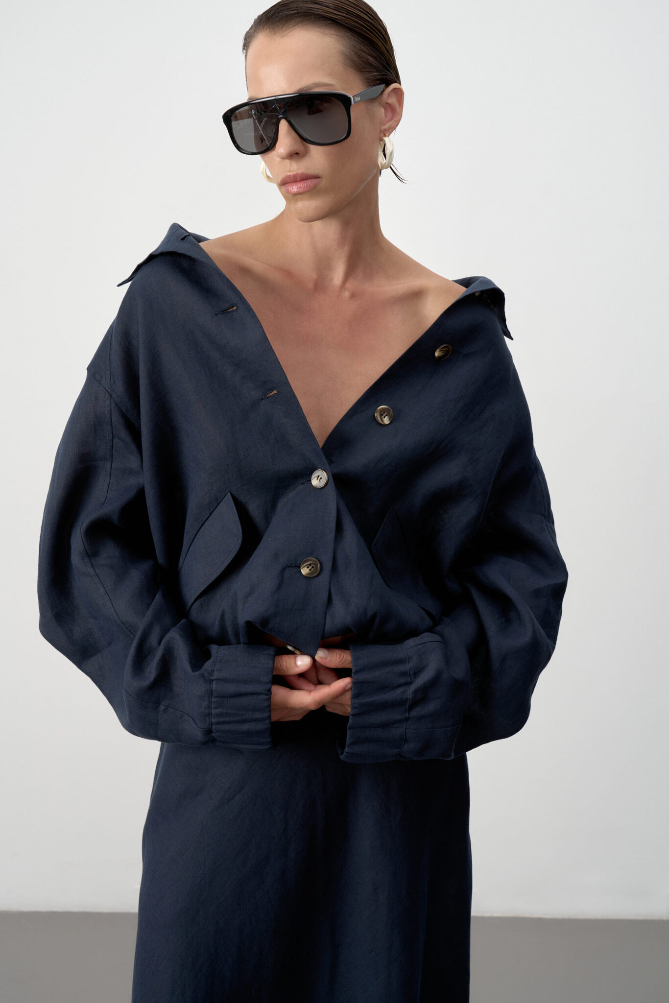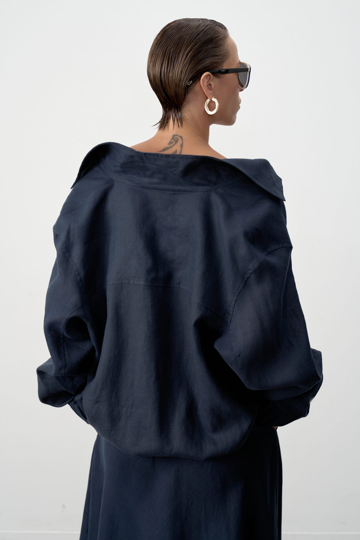 Куртка DEPTH создана как тактильный слой тишины — свободная форма, выстроенная из натурального итальянского льна, словно заимствует структуру ветра, задержанного между берегами. Воротник-стойка и фронтальная застежка на пуговицах, продолжают вертикаль, уравновешивая лёгкость ткани и графику силуэта.