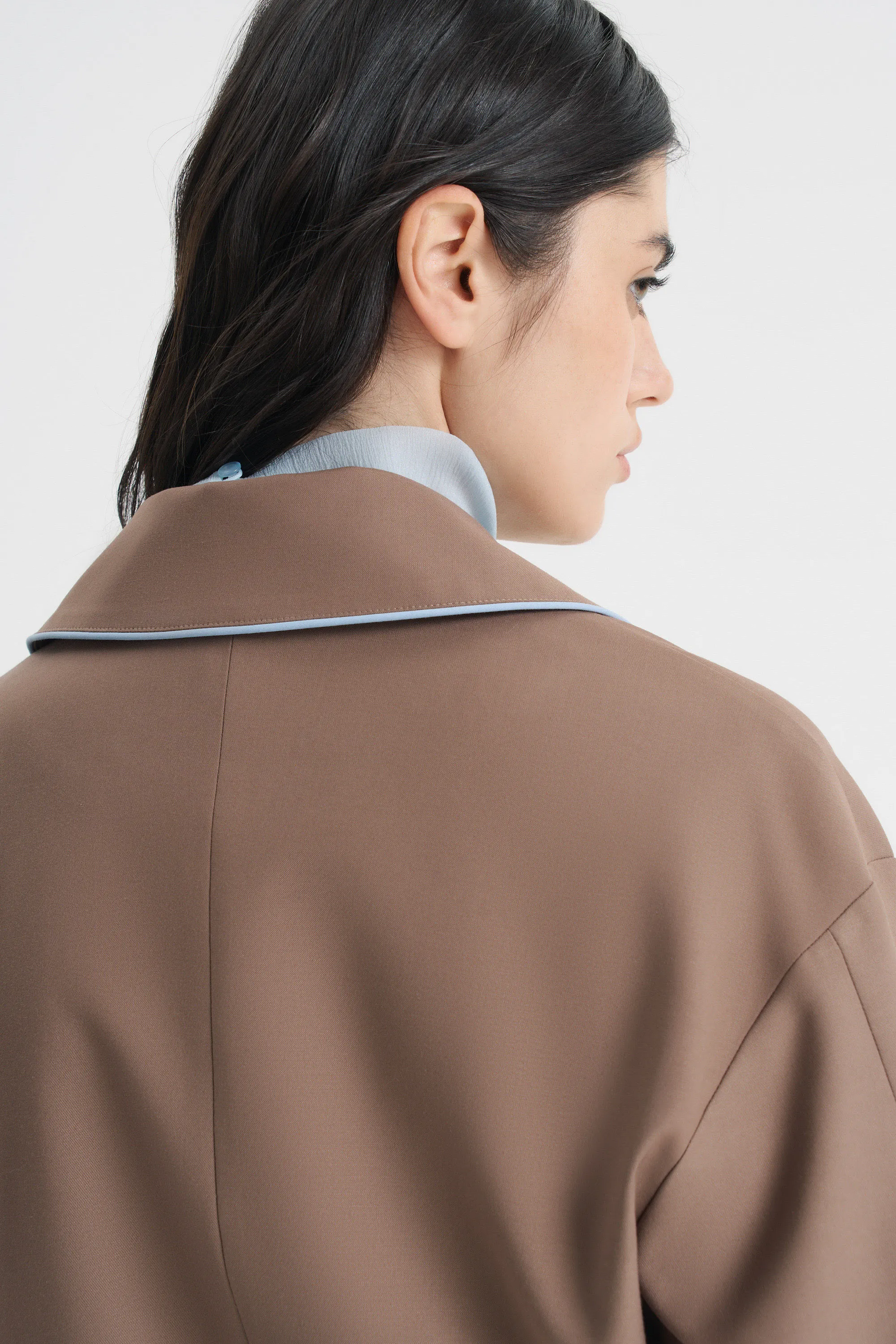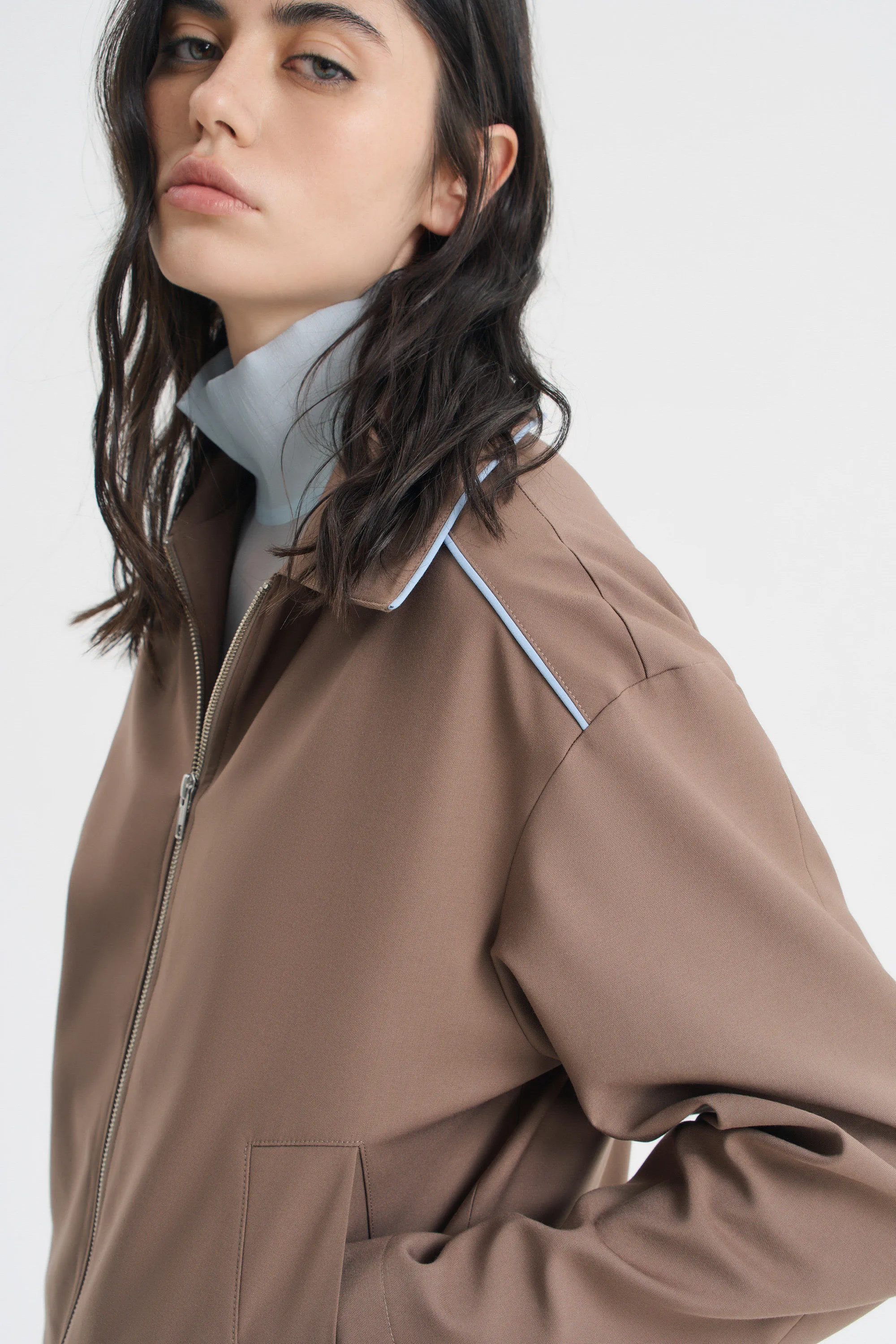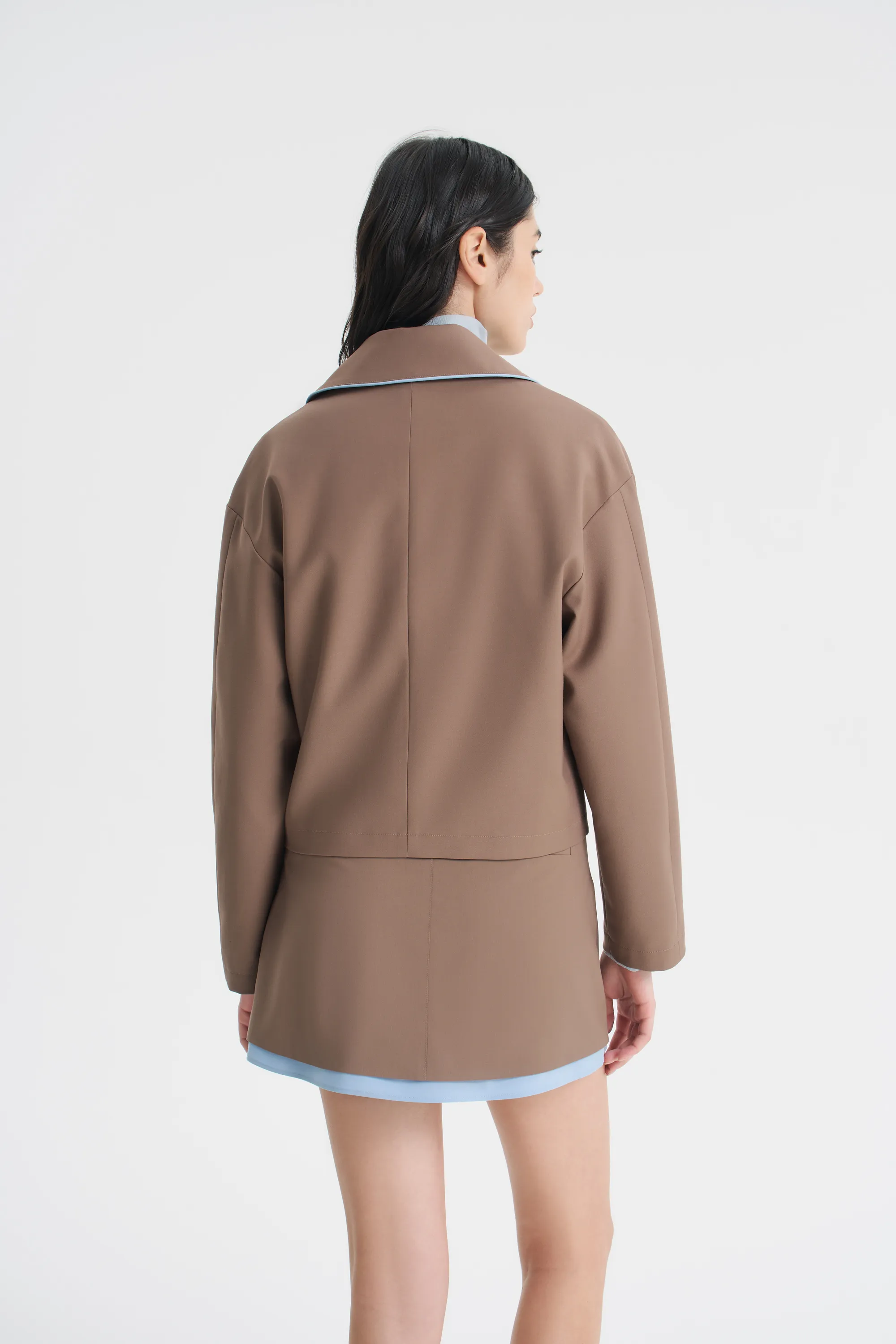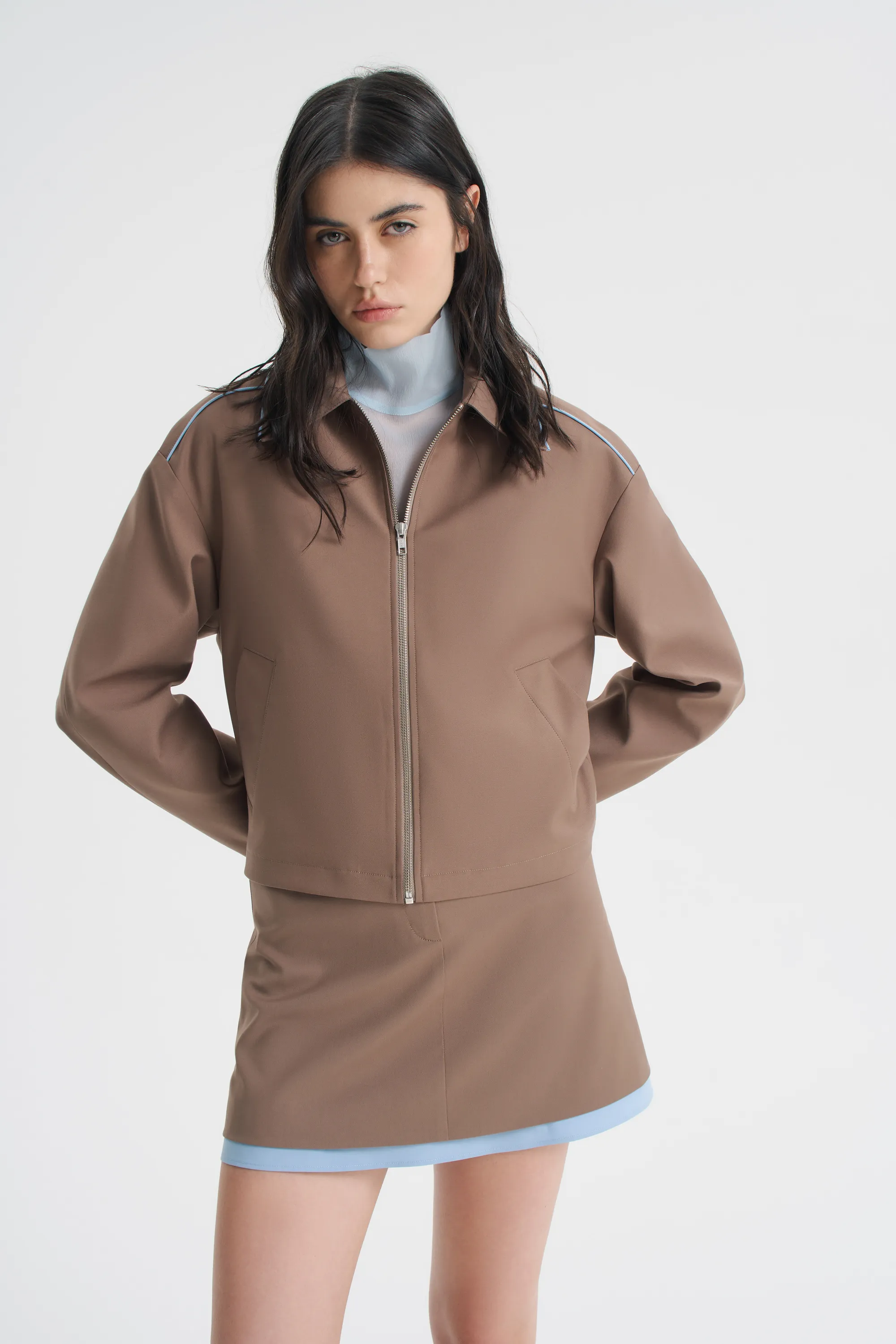 Куртка из костюмной ткани — альтернатива жакету и верхняя часть комплекта в сочетании с юбкой мини или миди из такого же материала или самостоятельный вариант легкой верхней одежды. Нежно-голубой контрастный кант по линии воротника и плечевого шва добавляет свежести изделию в цвете мокко. Куртка прямого свободного кроя с отложным воротником застегивается на металлическую молнию. Спереди на полочках — прорезные карманы с широкой листочкой. Изделие на подкладке с декоративной отделкой по мотивам творчества дизайн-группы Memphis.