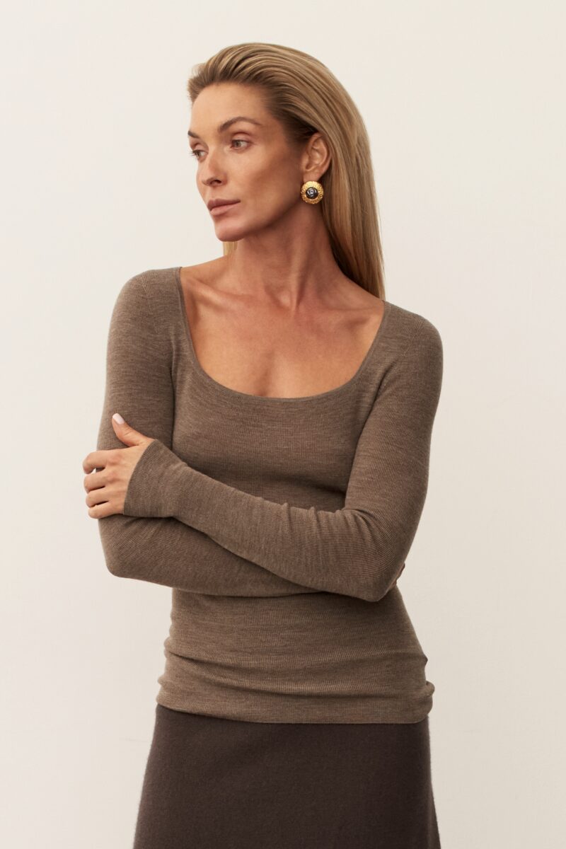 Бесшовный лонгслив Merino Wool. Очень нежный и мягкий топ с правильным прямоугольным вырезом. Модель в сложном оттенке Mocha Mousse. Лонг облегает силуэт, но при этом не сковывает движения. Ткань на коже ощущается как кашемир.