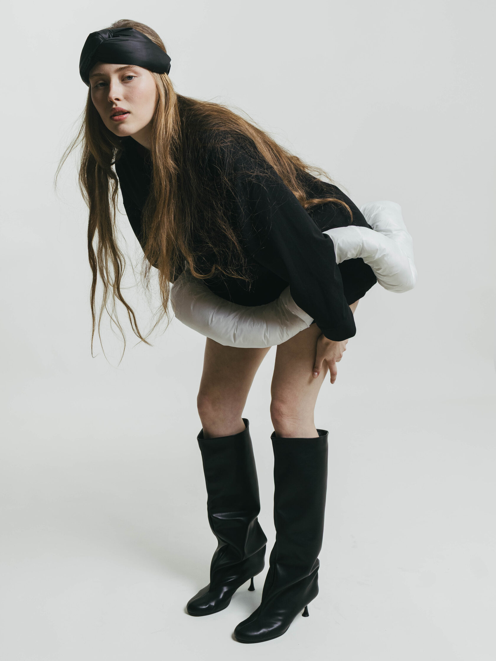 Суть фасона: Состояние защищённой уязвимости. Прилегающий силуэт, как вторая кожа, создаёт ощущение кокона и спокойствия, а мягкий волан на груди — единственное «окно», место эмоционального выдоха.