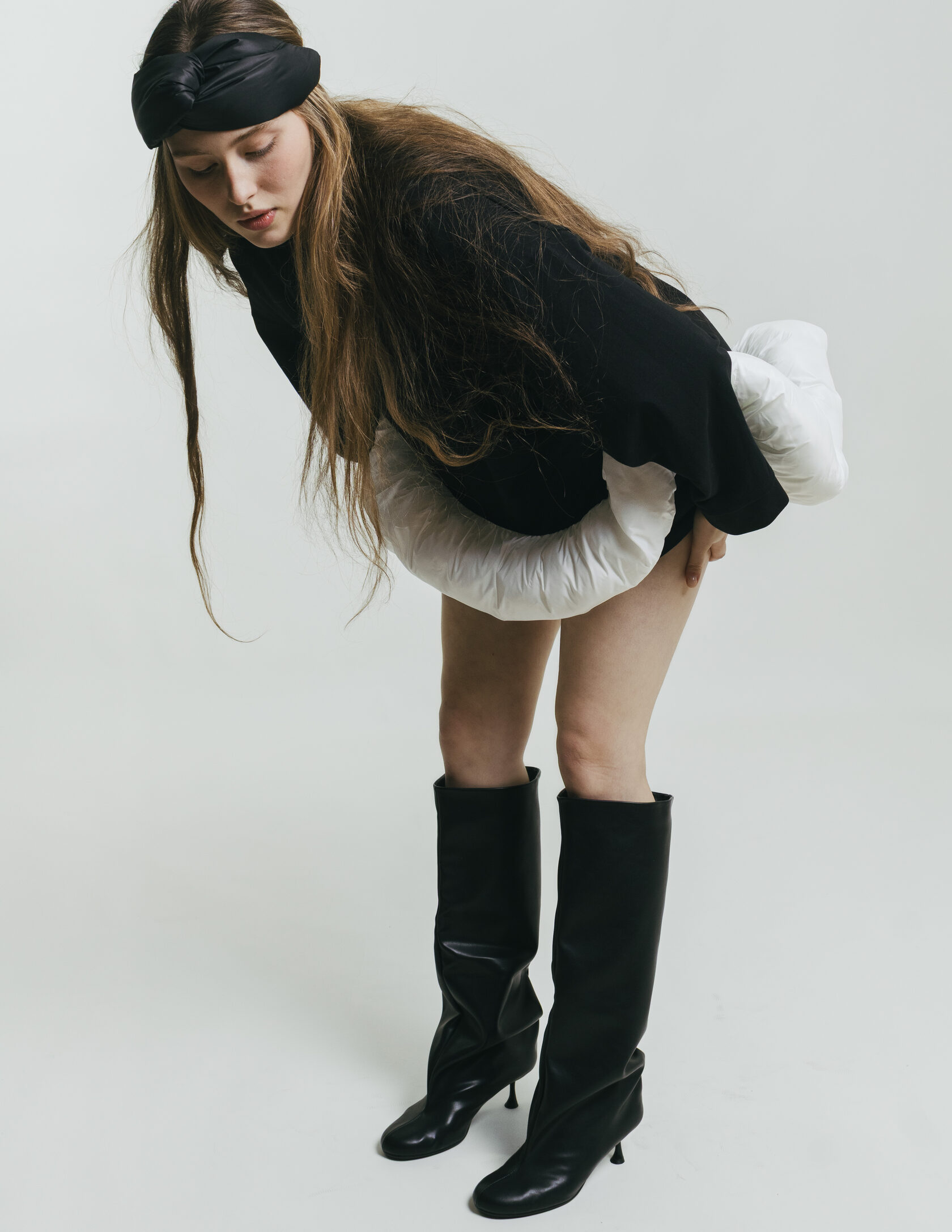 Белый волан: Уязвимость становится искусством. Волан читается как чистый холст или скульптурный рельеф. Вся простота фасона концентрируется в этой белизне, возводя минимализм в абсолют.