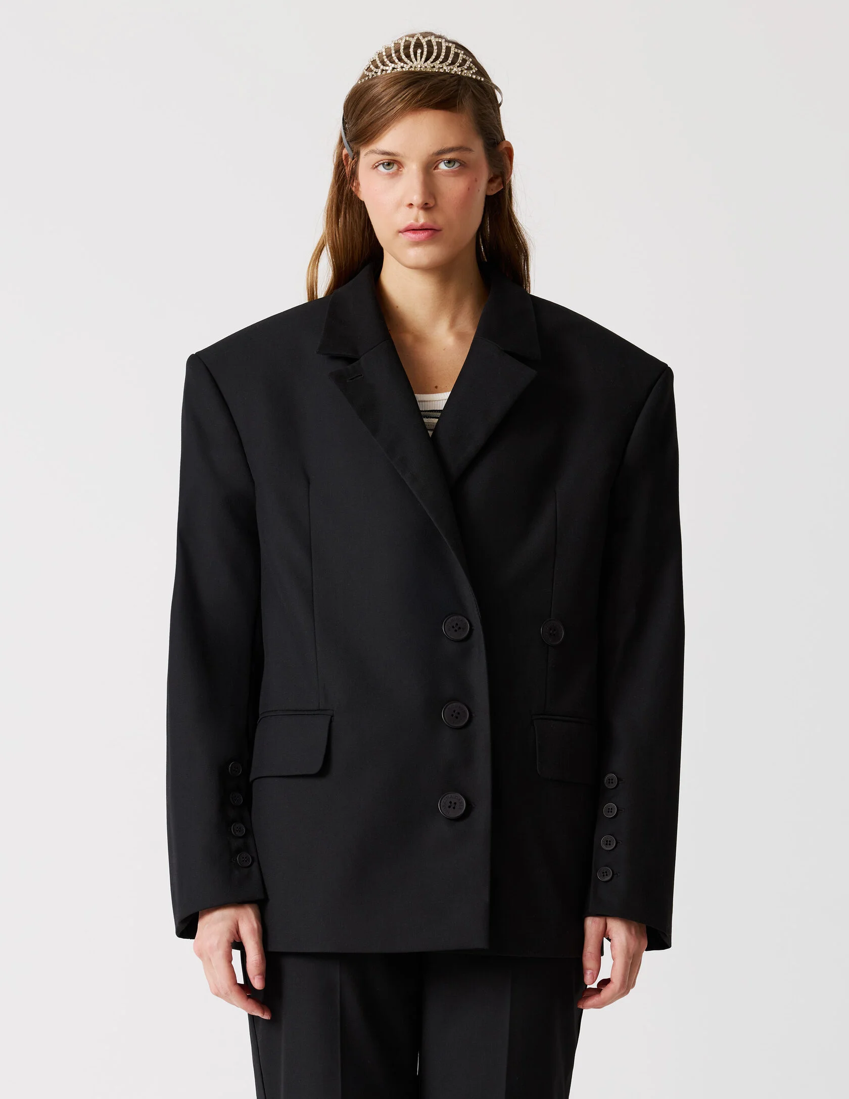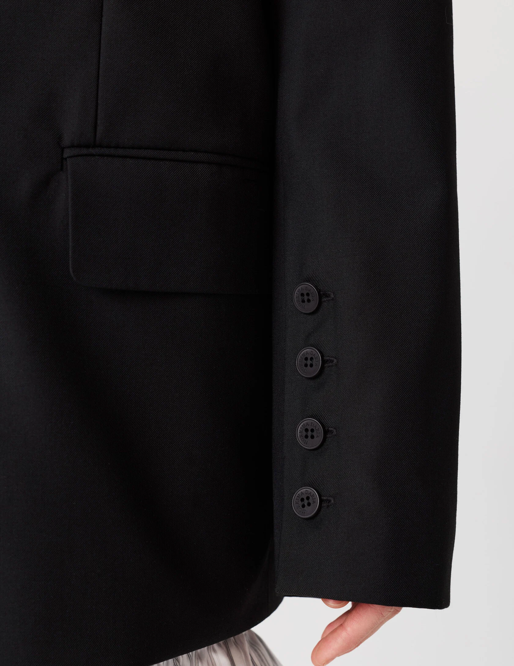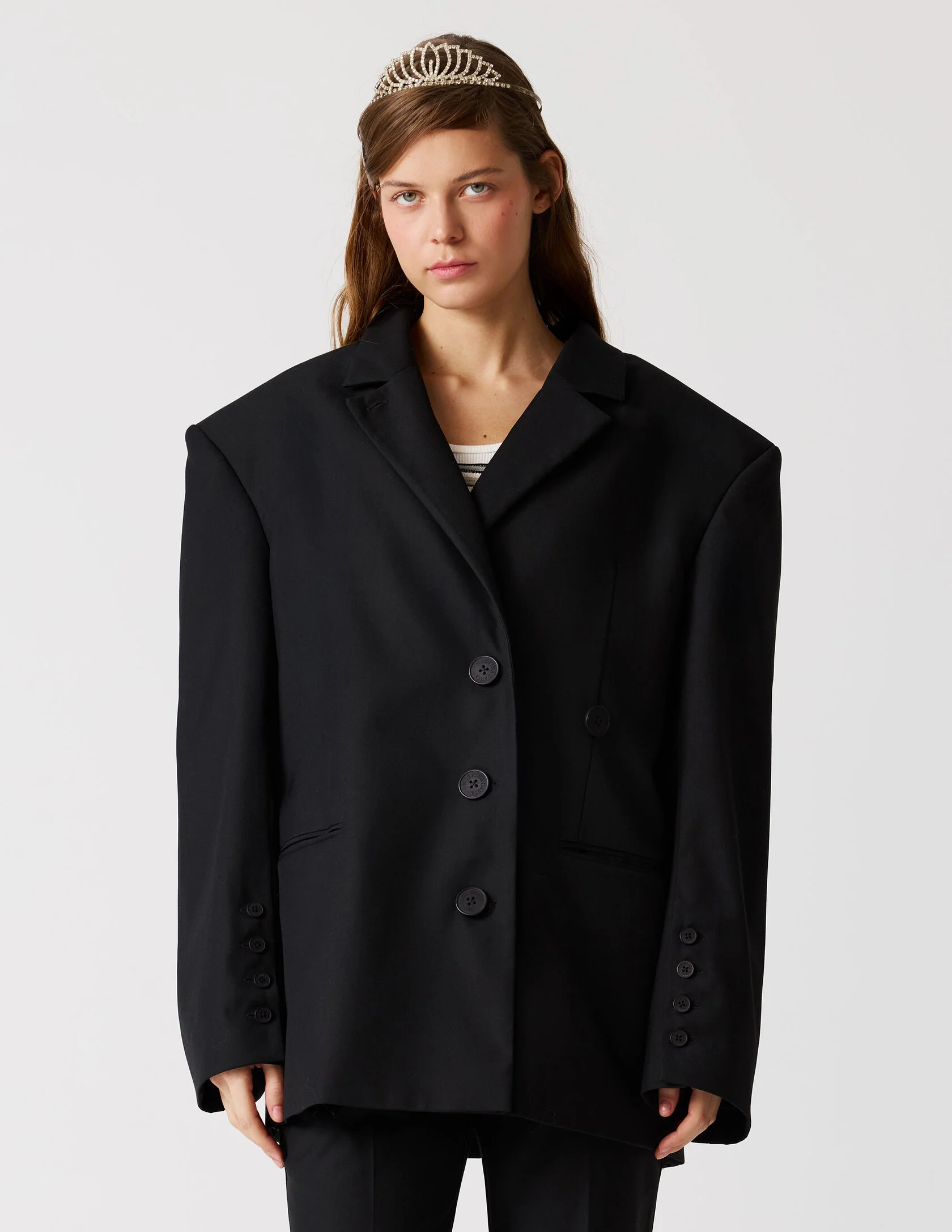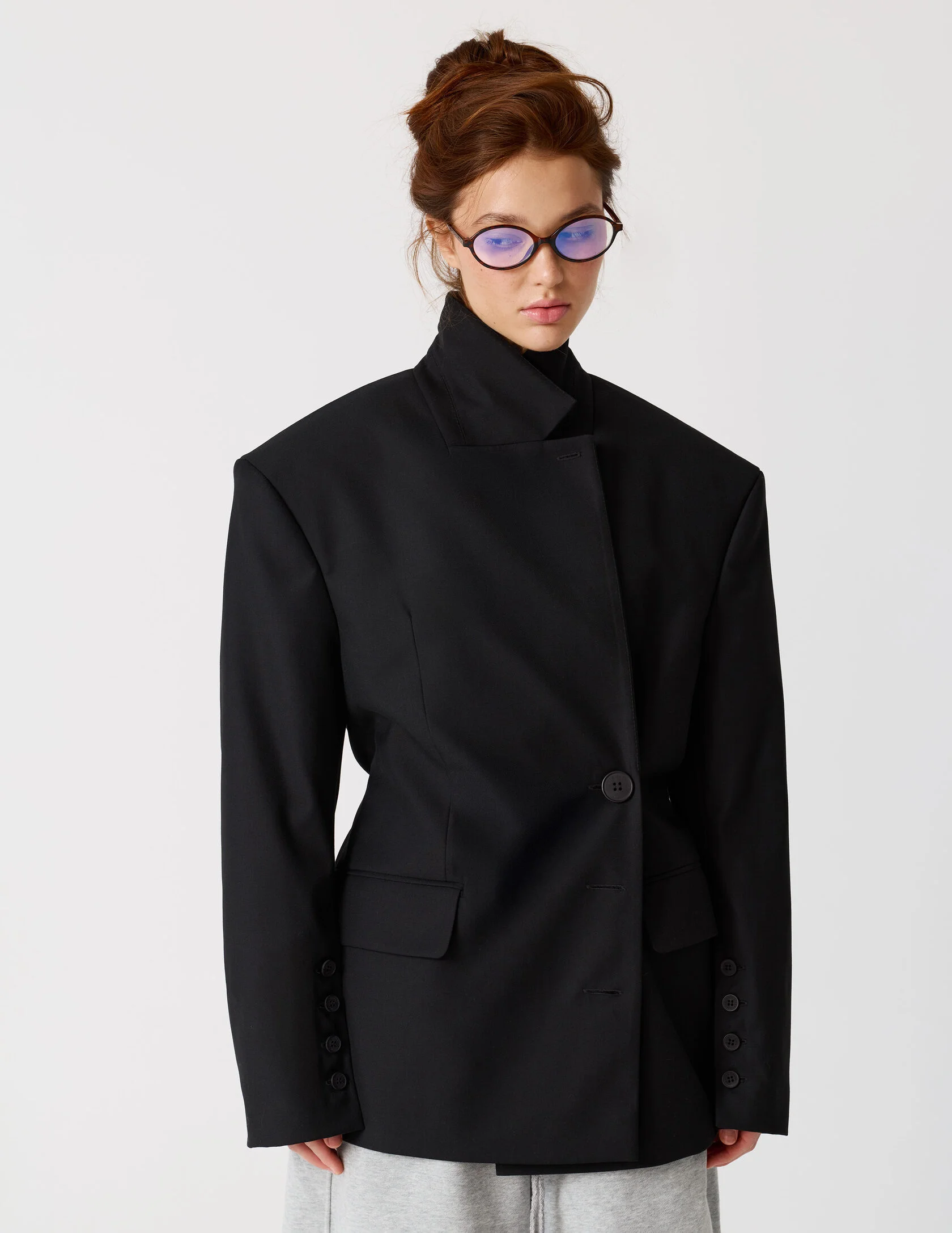 Пиджак мужского кроя с возможностью приталивания силуэта. Сразу две роли и обе главные. «Сильная женщина» в пиджаке с мужского плеча и «Хрупкая девушка» в приталенном жакете с ассиметричной застежкой. Продуманная конструкция пиджака позволяет менять посадку — от свободного оверсайз до более собранного силуэта. Для приталивания силуэта используются дополнительные пуговицы. Акцентная линия плеча, выразительная шлица и возможность варьировать посадку делают его универсальной основой гардероба.