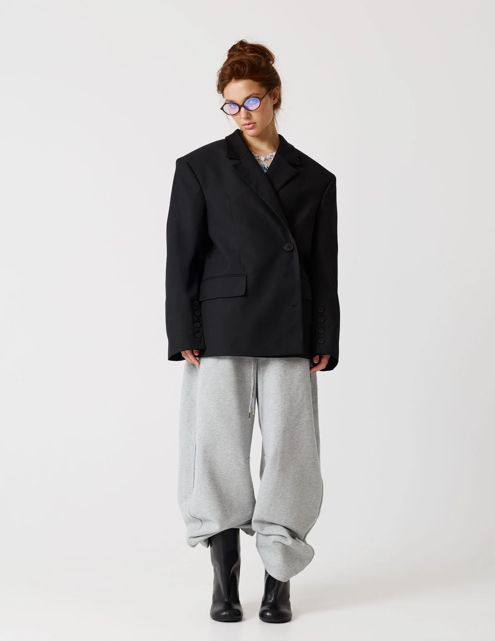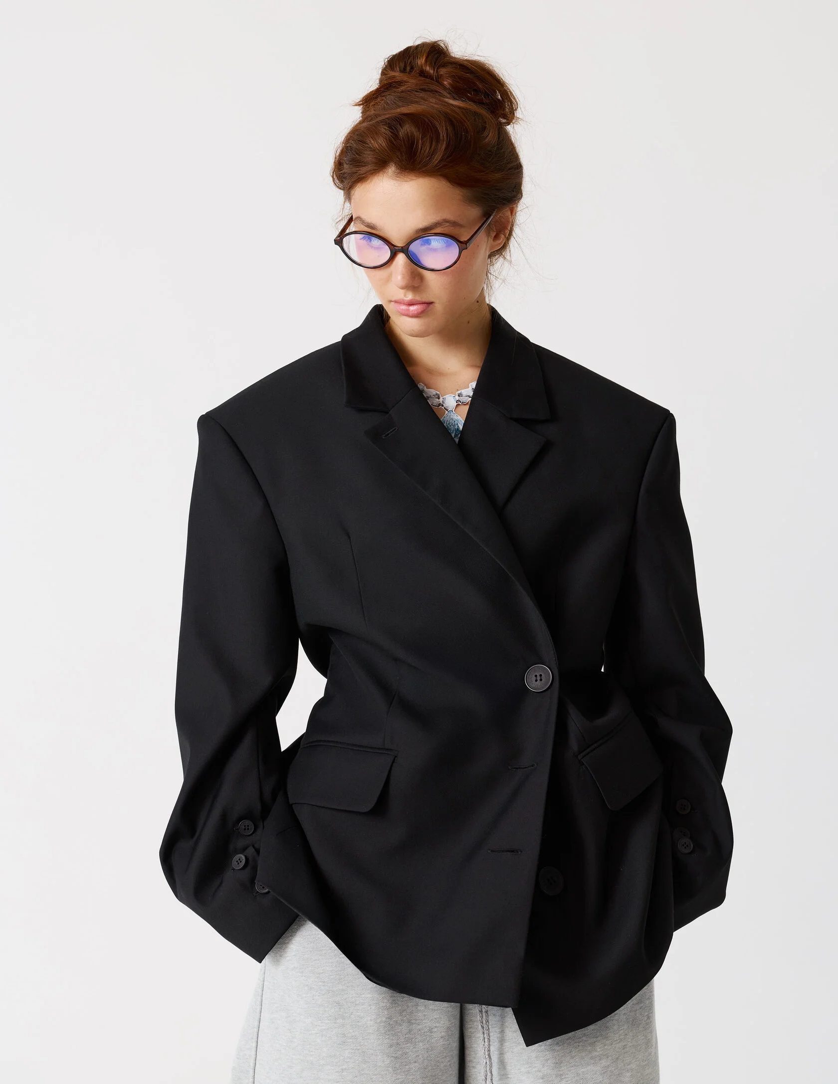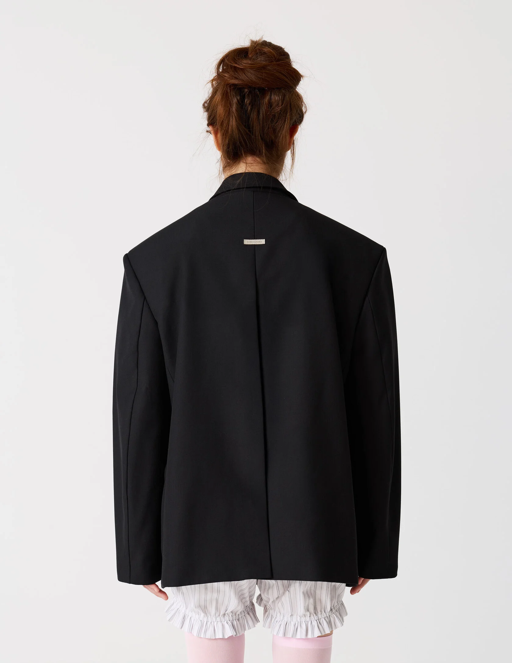 Пиджак мужского кроя с возможностью приталивания силуэта. Сразу две роли и обе главные. «Сильная женщина» в пиджаке с мужского плеча и «Хрупкая девушка» в приталенном жакете с ассиметричной застежкой. Продуманная конструкция пиджака позволяет менять посадку — от свободного оверсайз до более собранного силуэта. Для приталивания силуэта используются дополнительные пуговицы. Акцентная линия плеча, выразительная шлица и возможность варьировать посадку делают его универсальной основой гардероба.